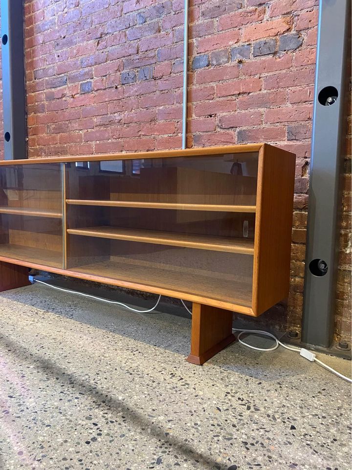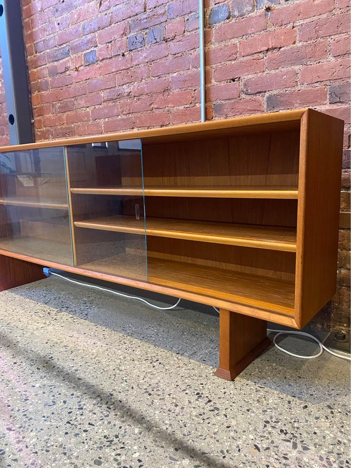 This elegantly crafted piece showcases teak veneer and boasts two sliding glass doors, complemented by a double pedestal base. Originating from Denmark in the 1960s, this item has undergone meticulous restoration and remains in impeccable condition.