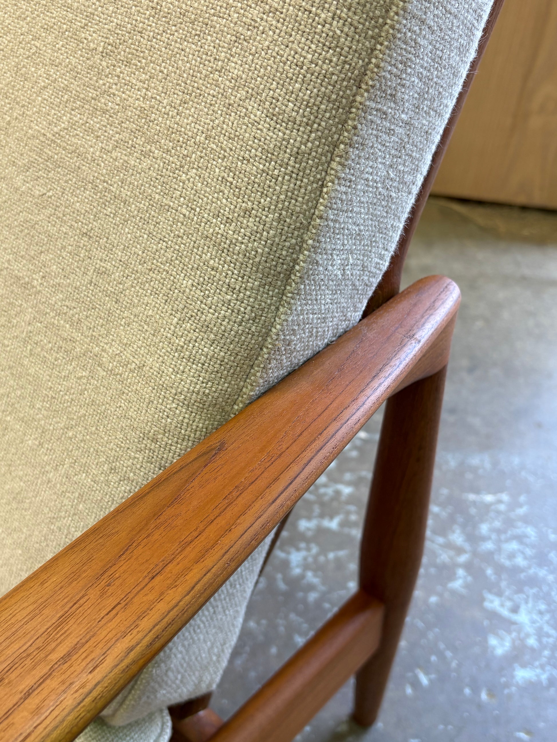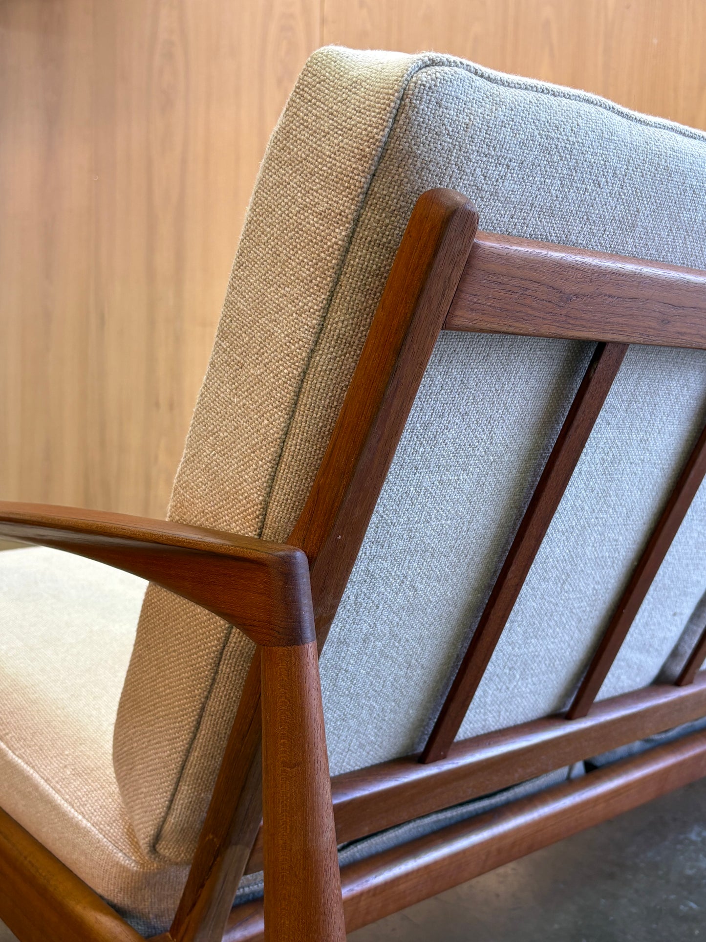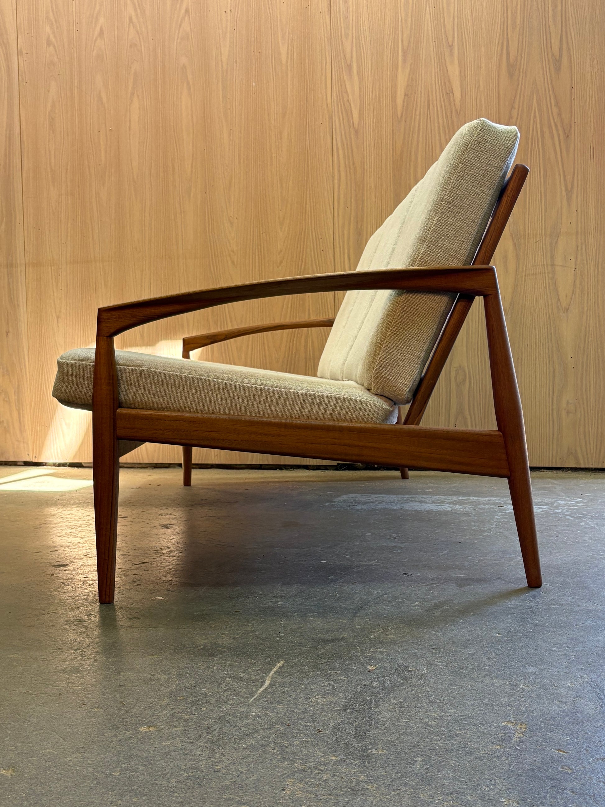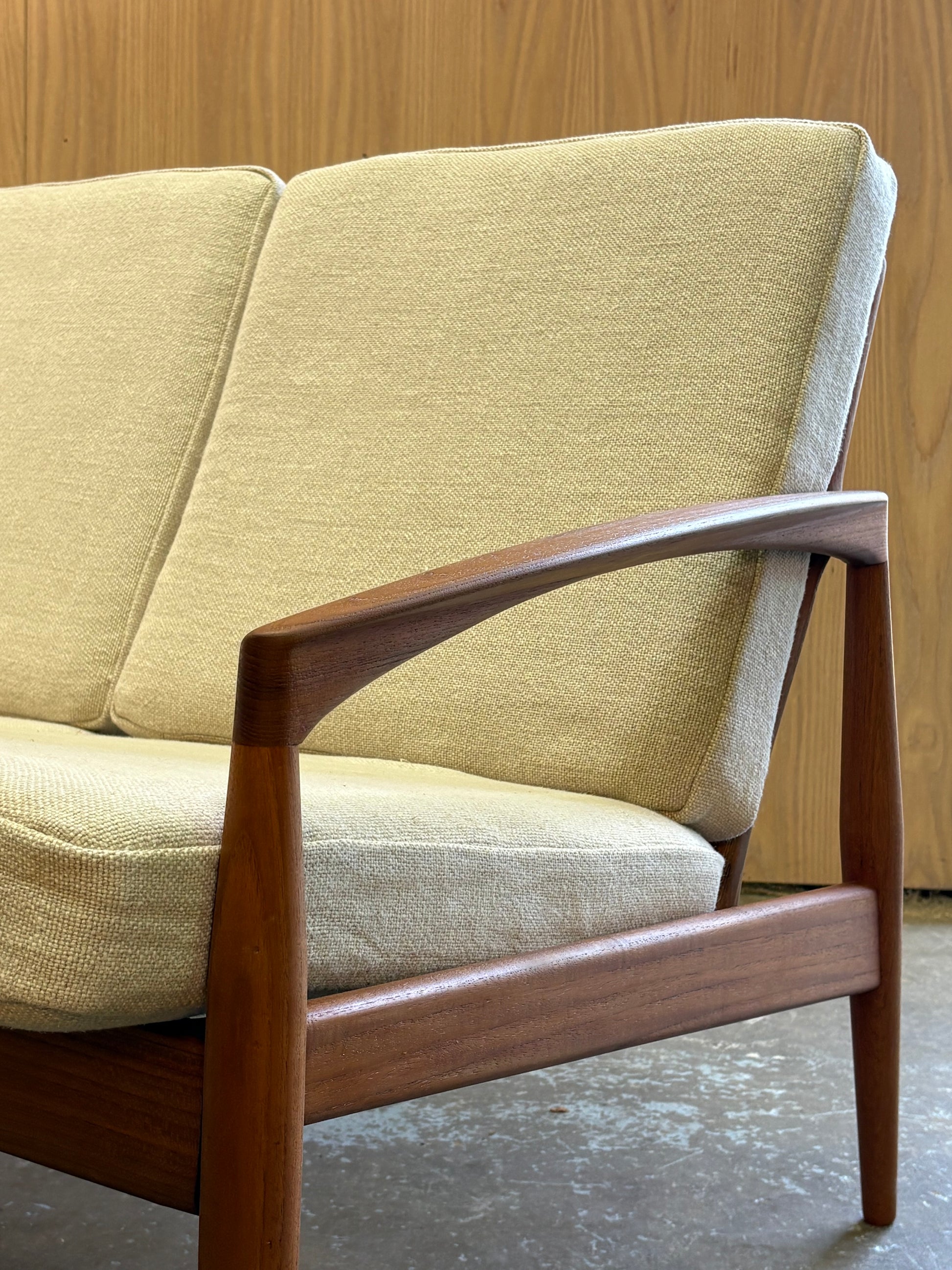 A Danish modern classic by Kai Kristiansen for Magnus Olesen, this 1960s “Paper Knife” sofa showcases Kristiansen’s signature sculptural armrests and refined joinery. Expertly restored by our team and freshly upholstered in a premium wool blend fabric, it’s as comfortable as it is elegant. The solid teak frame is in excellent condition, revealing warm grain and timeless craftsmanship. A standout piece of Danish design, ready to anchor any sophisticated interior.