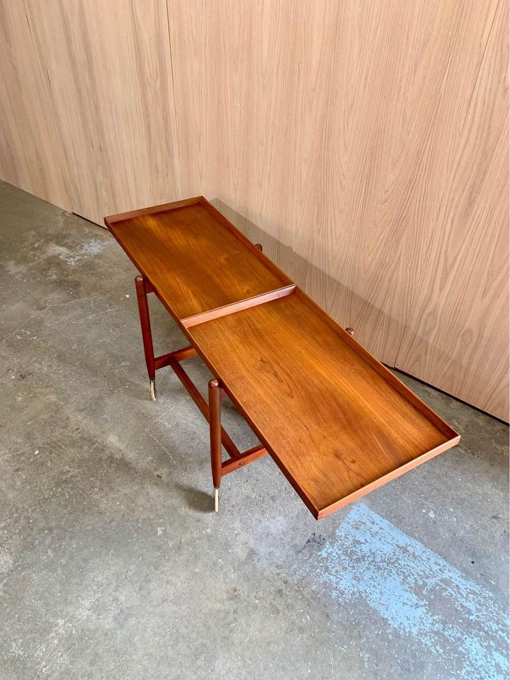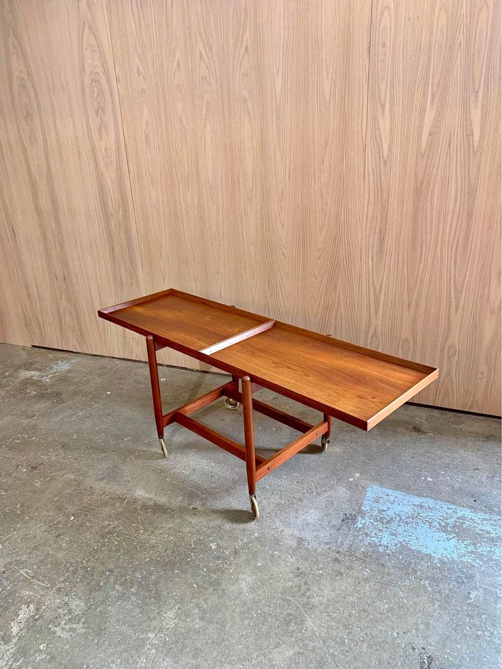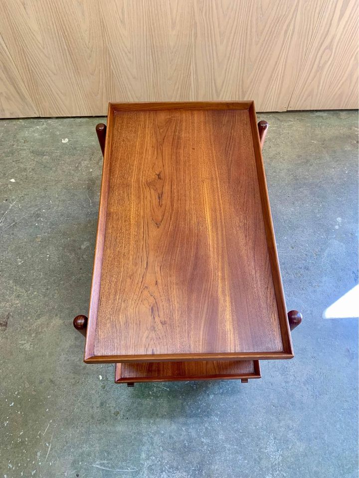 We are thrilled to present a stunning Danish teak serving cart designed by Poul Hundevad in the 1960s. This piece boasts an innovative design that allows the lower tier to be removed and placed on the top tier, creating a larger surface. With high-quality construction, freshly restored by our team, it is in excellent condition.
