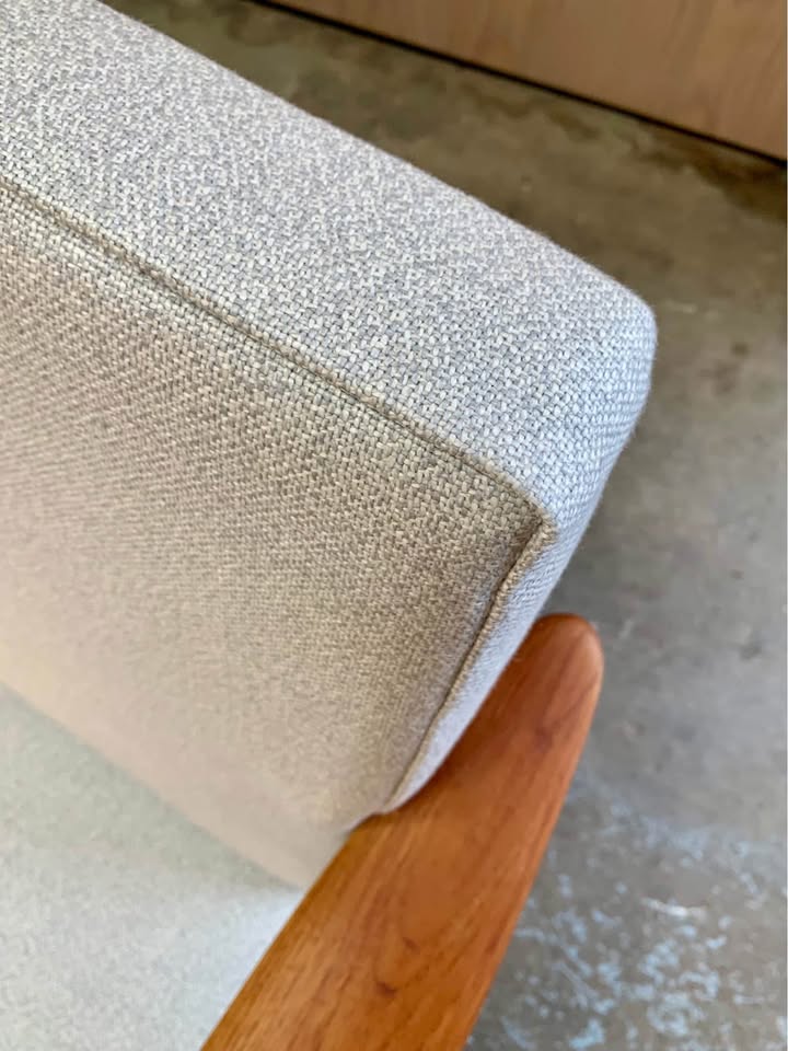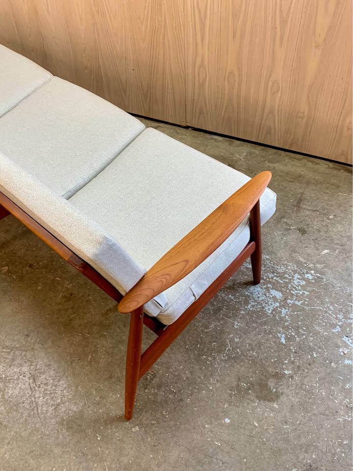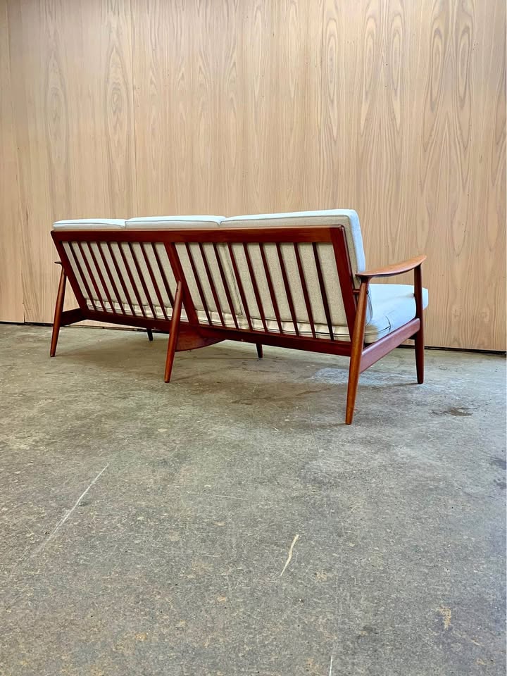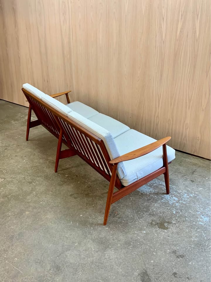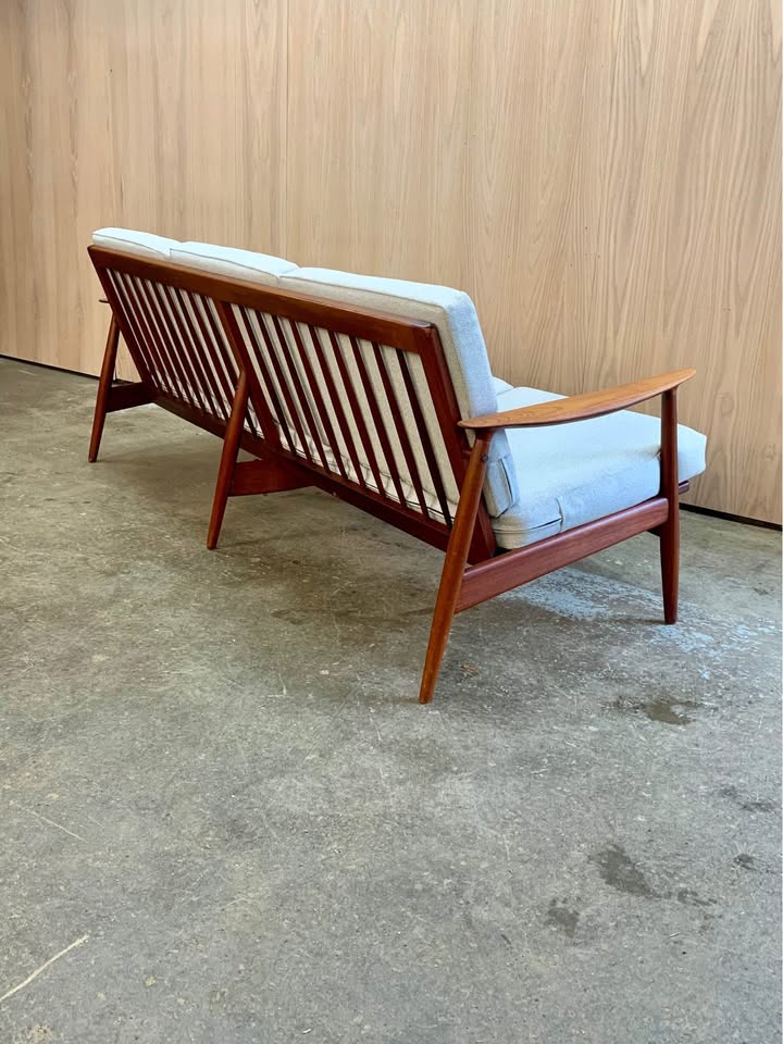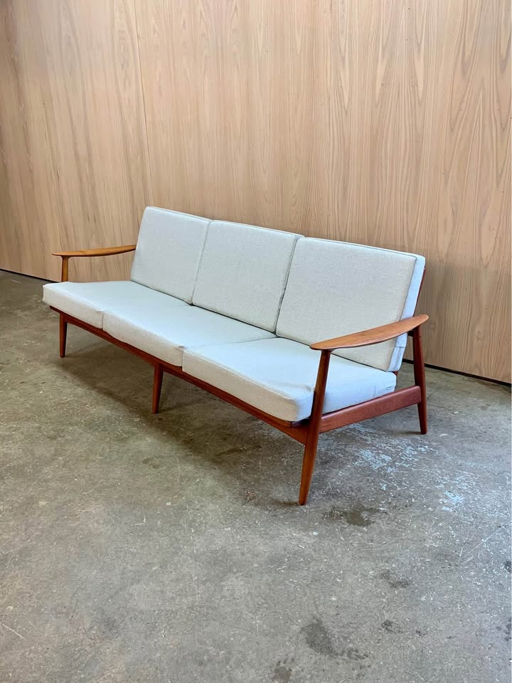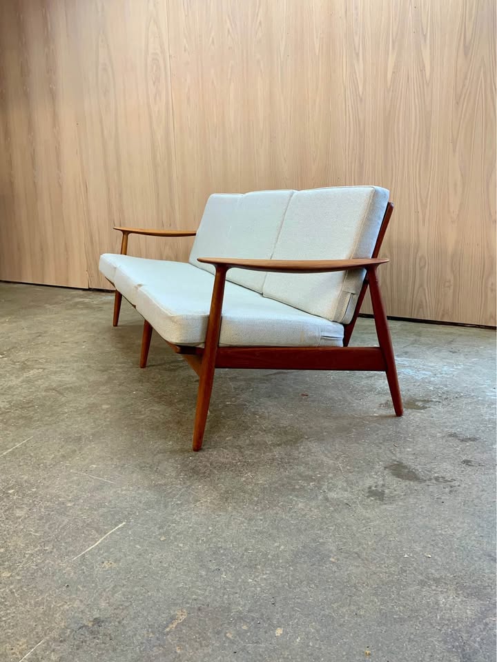 From an original family collection, we are delighted to present this stunning solid teak sofa, expertly crafted in Denmark during the 1960s. Featuring elegantly sculpted armrests, a compact design, and remarkably comfortable seating, this piece offers timeless charm for any space. Freshly upholstered in high-quality fabric and with its wood frame thoroughly cleaned and polished by our team, it now stands in magnificent condition, ready to elevate your home.