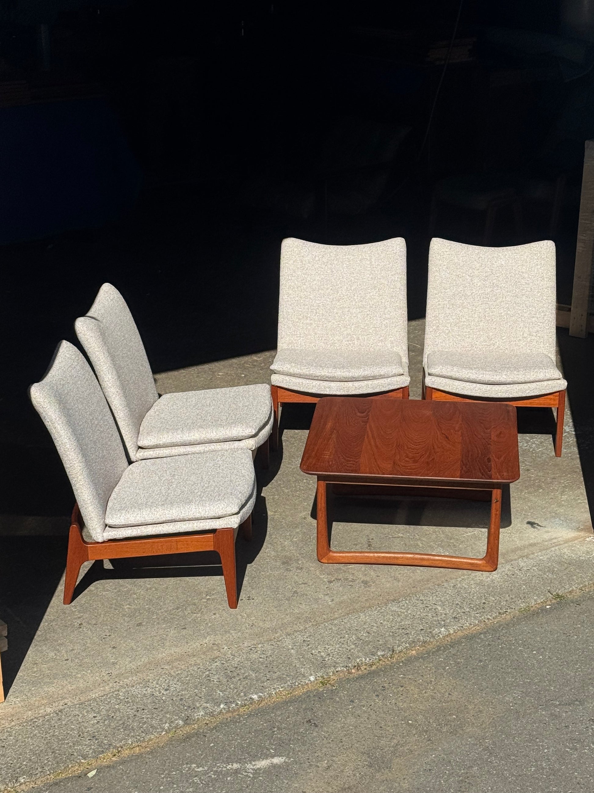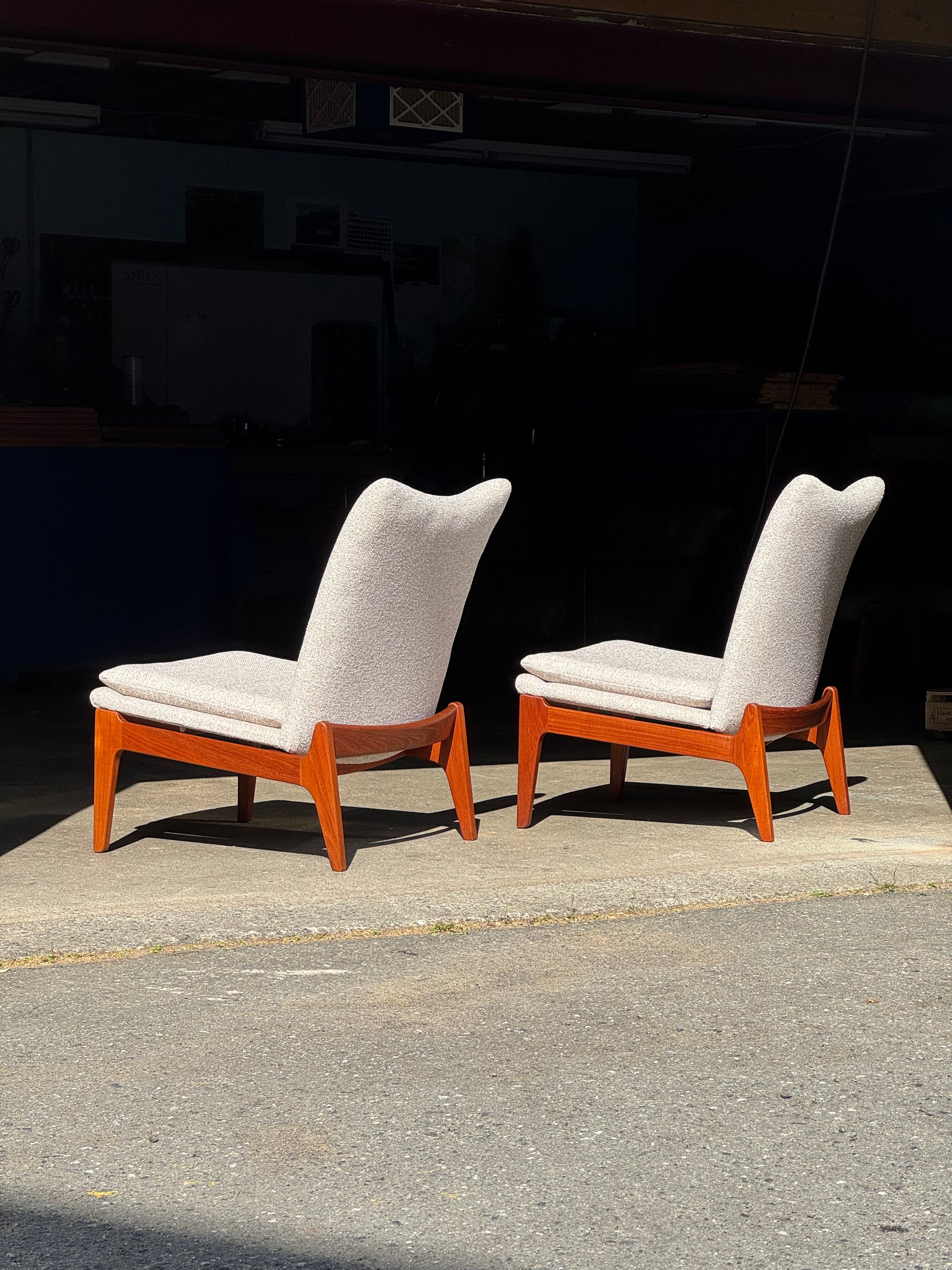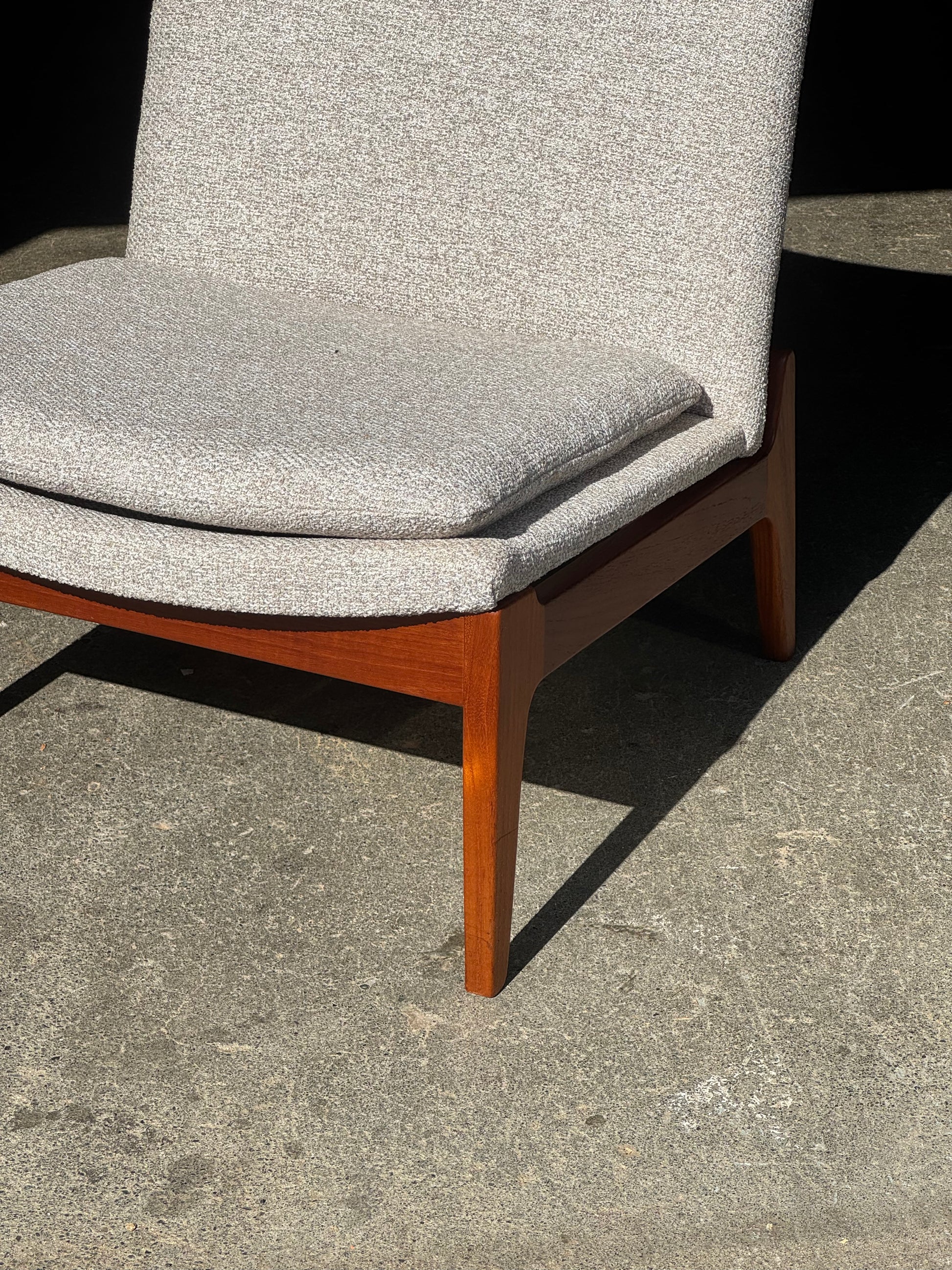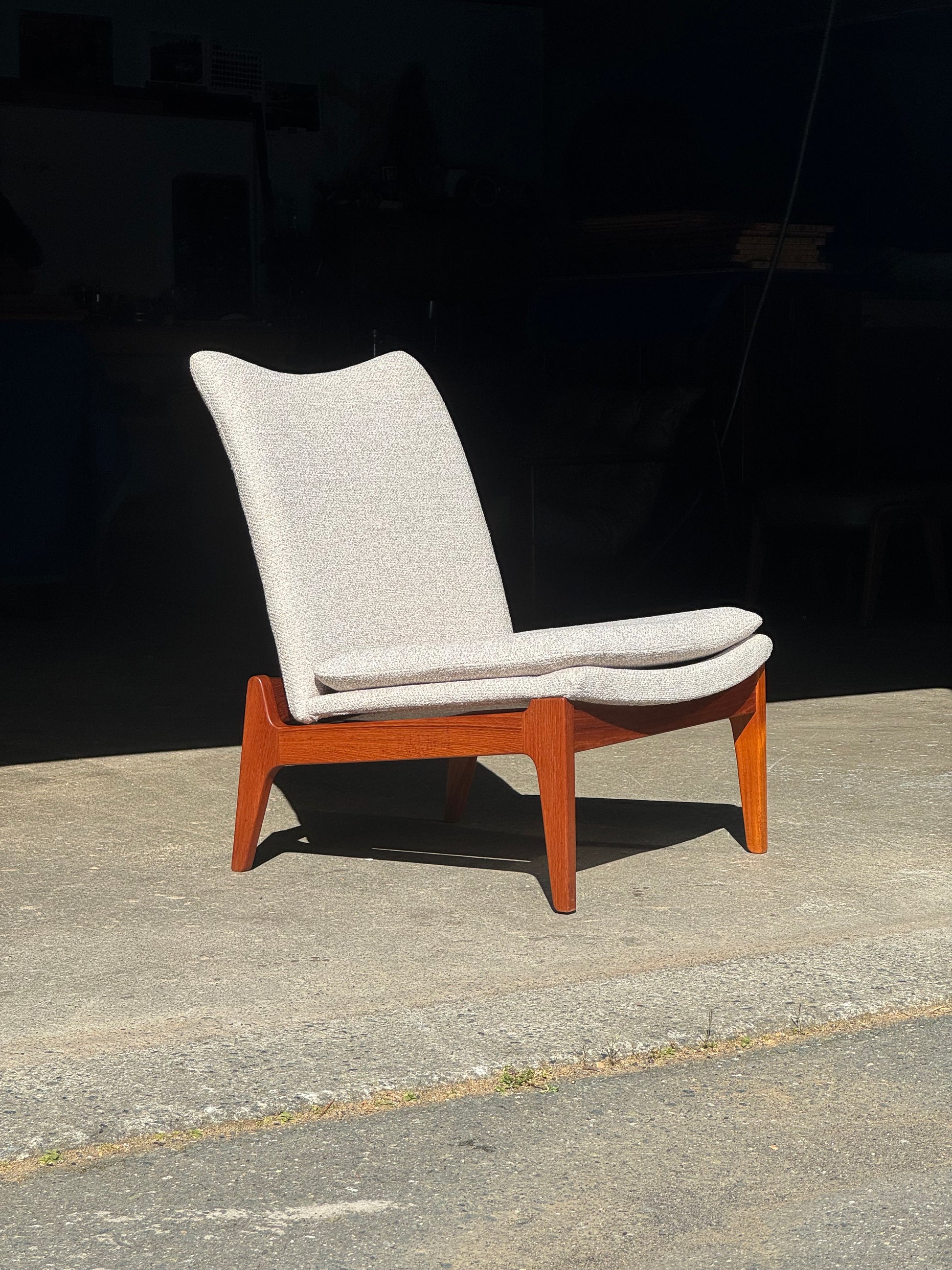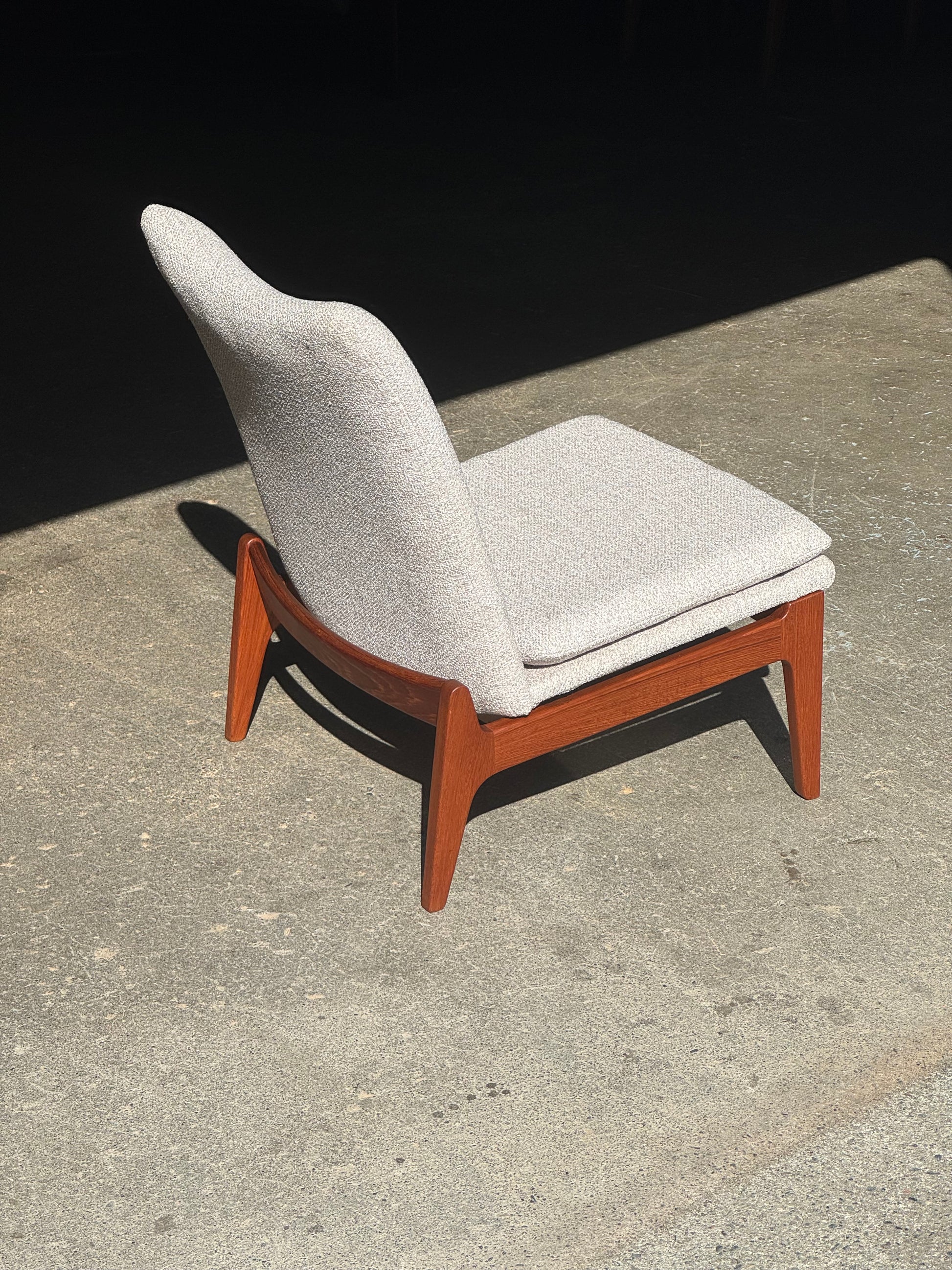 This example has been reupholstered in beige fabric. The teak frame is well preserved, with clean surfaces and solid joinery. The chair is in excellent condition and ready for use.