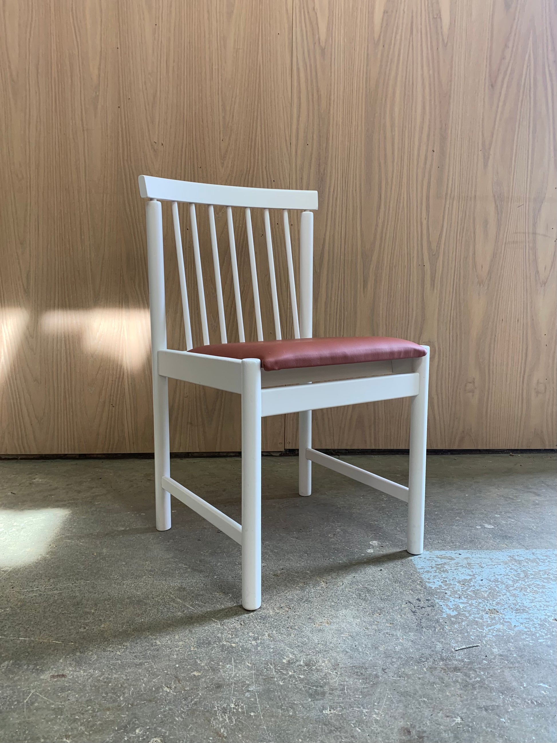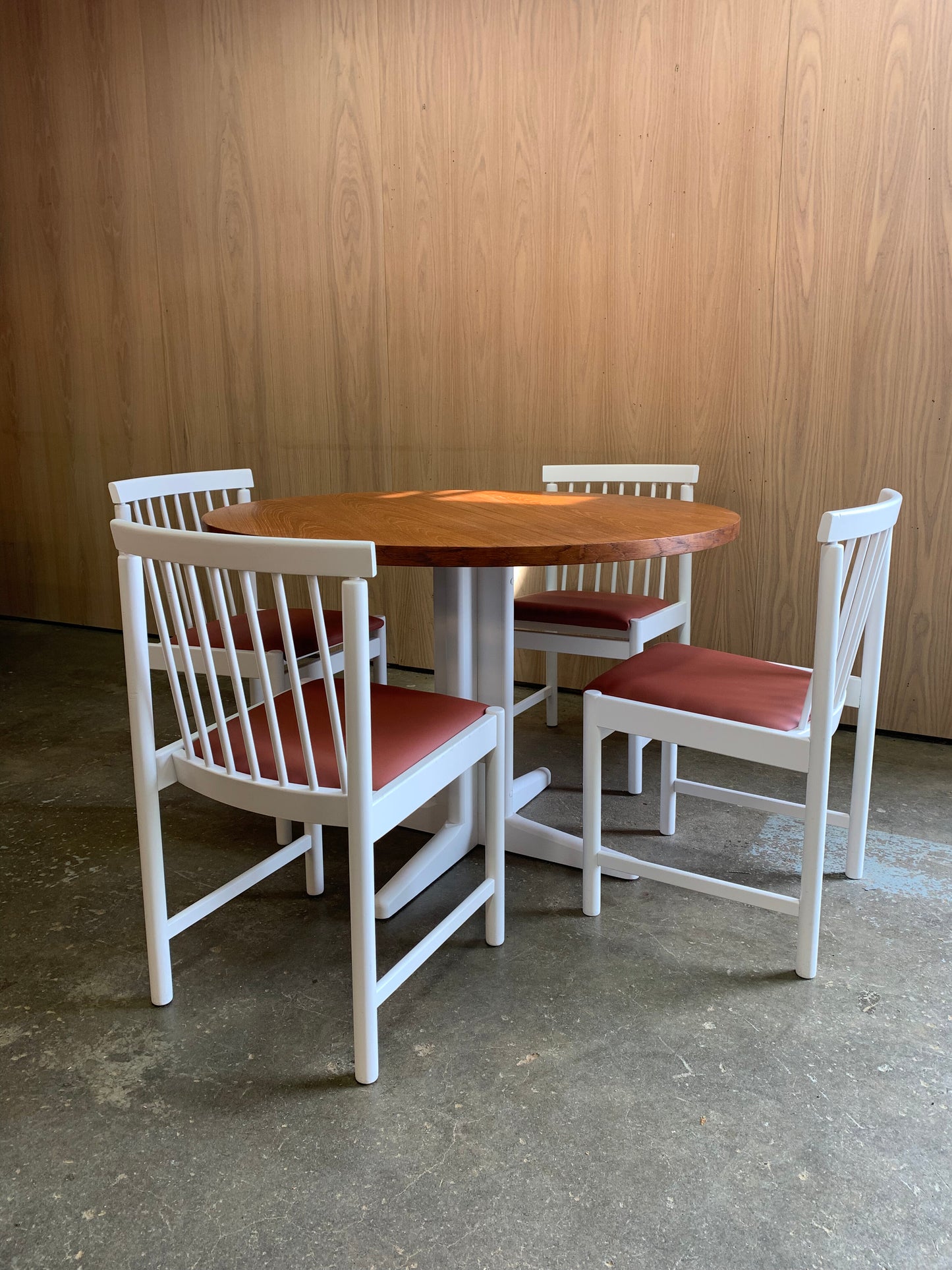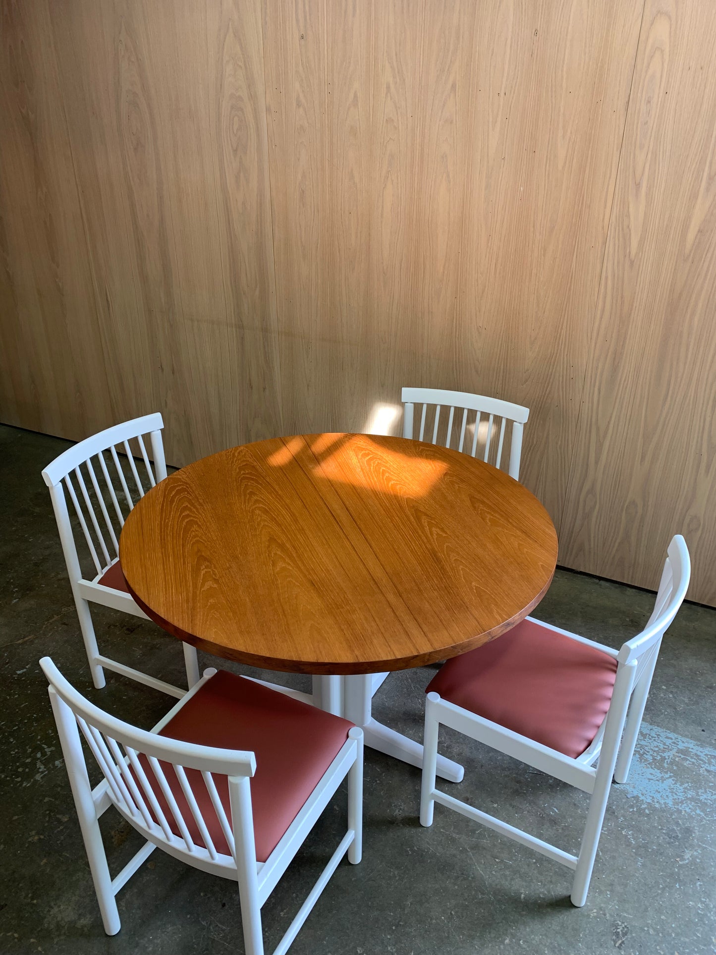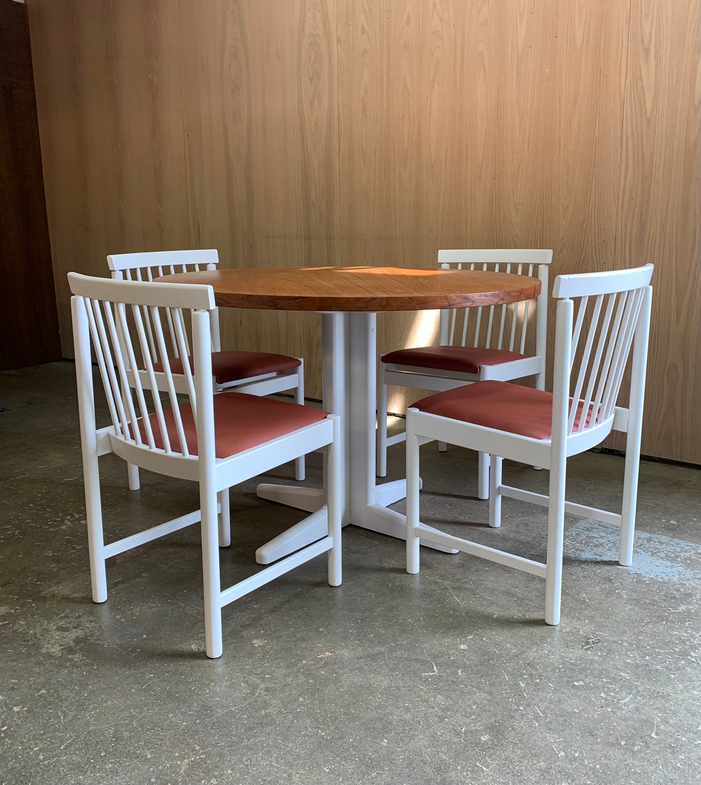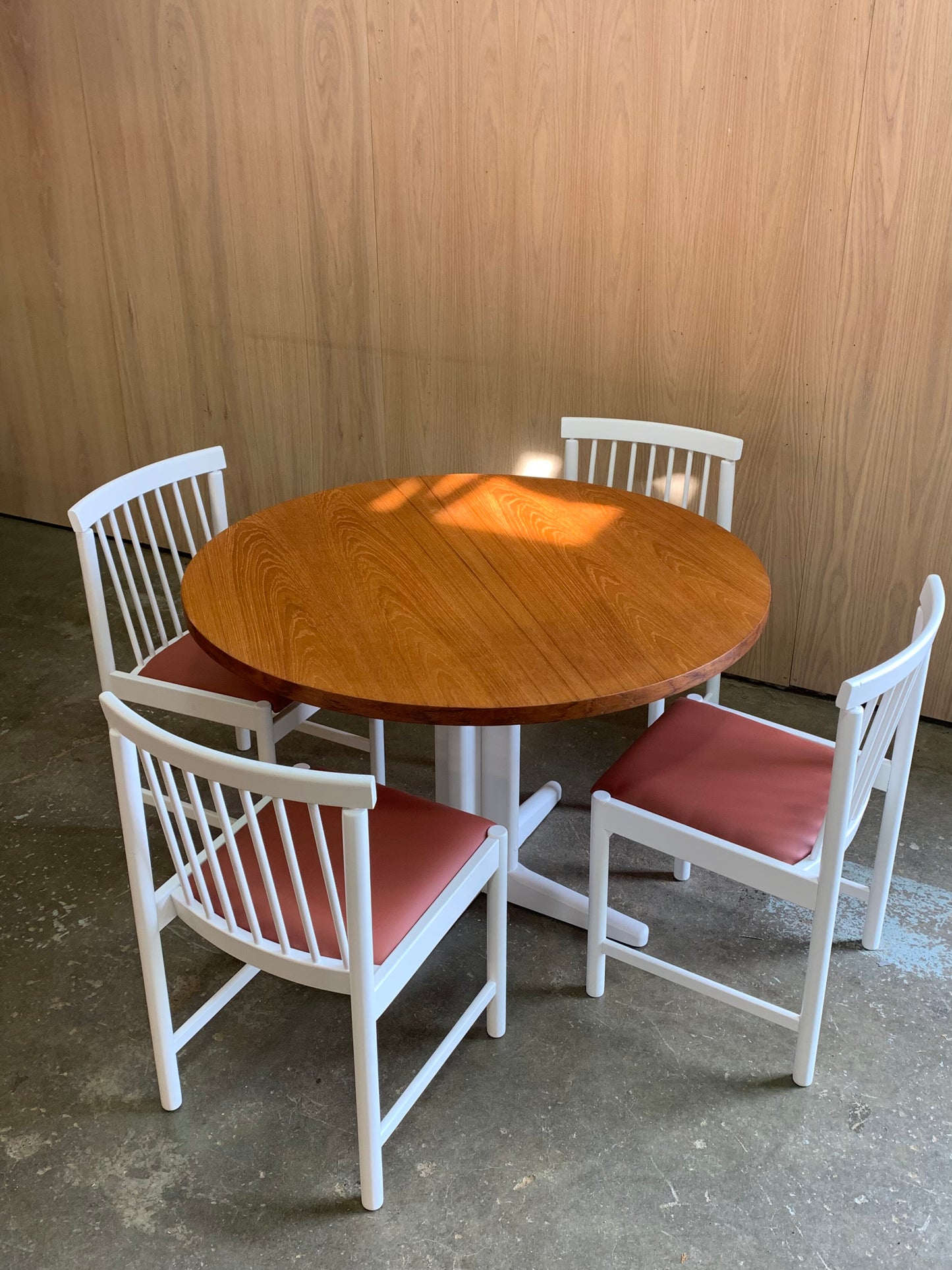 Don’t need the full set? The white lacquered spindle chairs pair beautifully with many of the teak dining tables we have in stock.