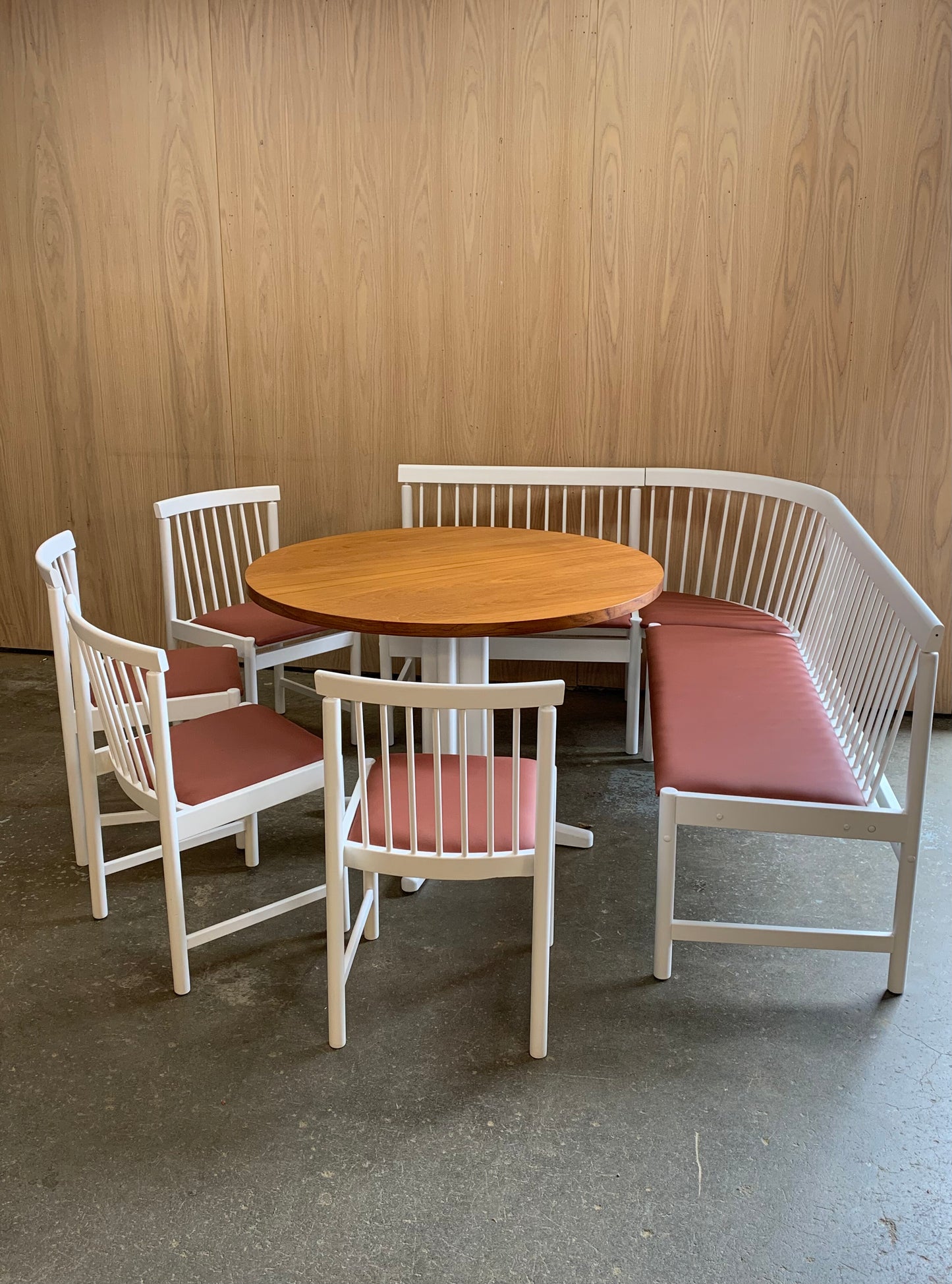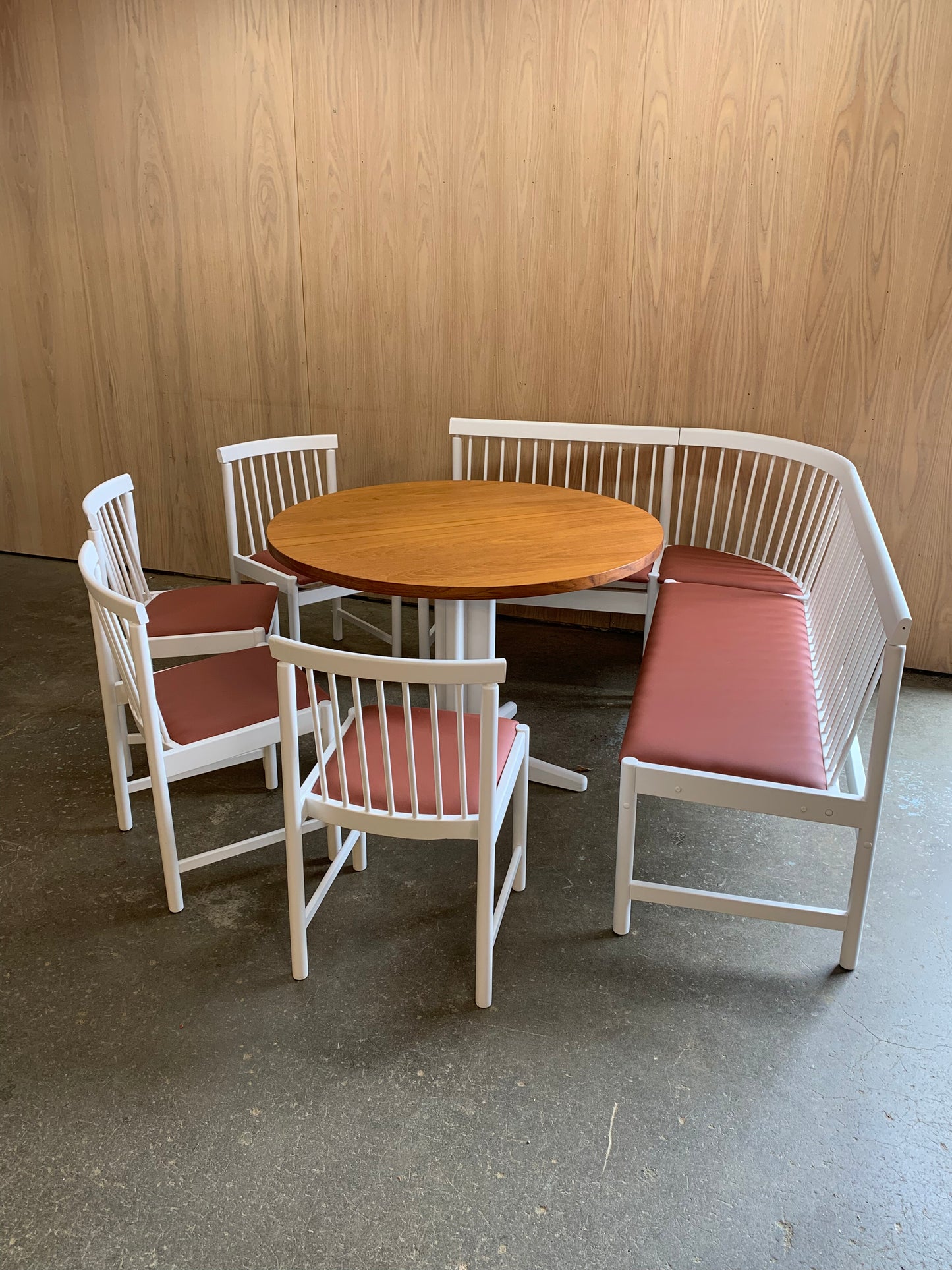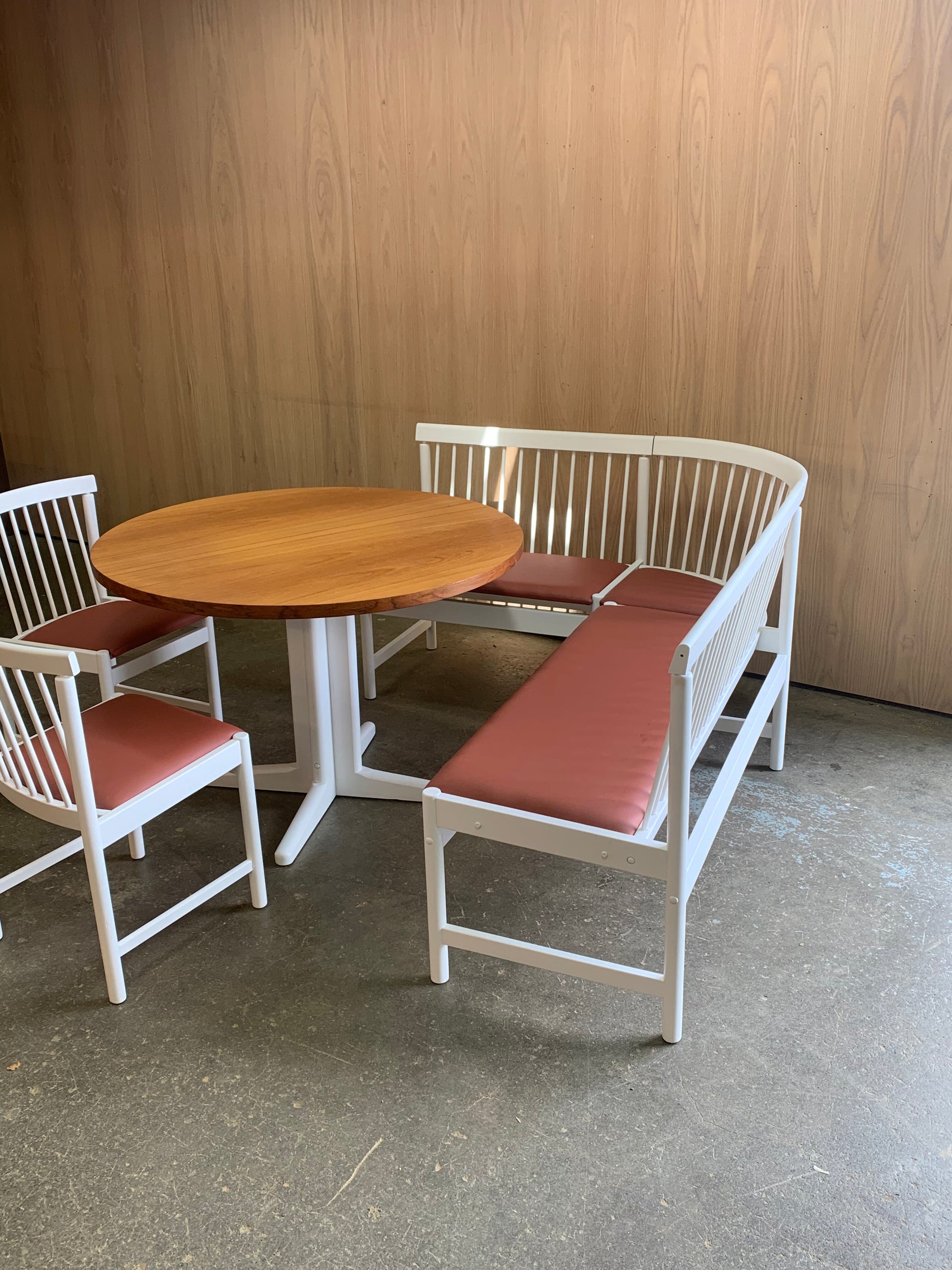 Freshly restored and in excellent condition throughout, the set seats up to ten in a surprisingly compact footprint — perfect for a kitchen corner, breakfast area, or even a compact commercial setting. The benches can also be used separately in an entryway, mudroom, or along a hallway wall, making this one of the most adaptable vintage sets we’ve come across.