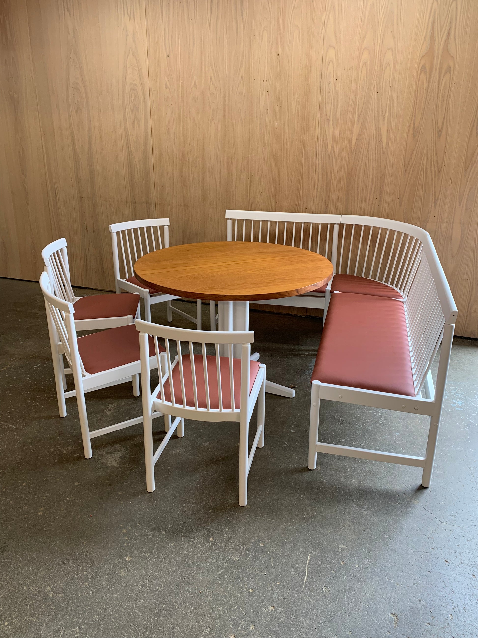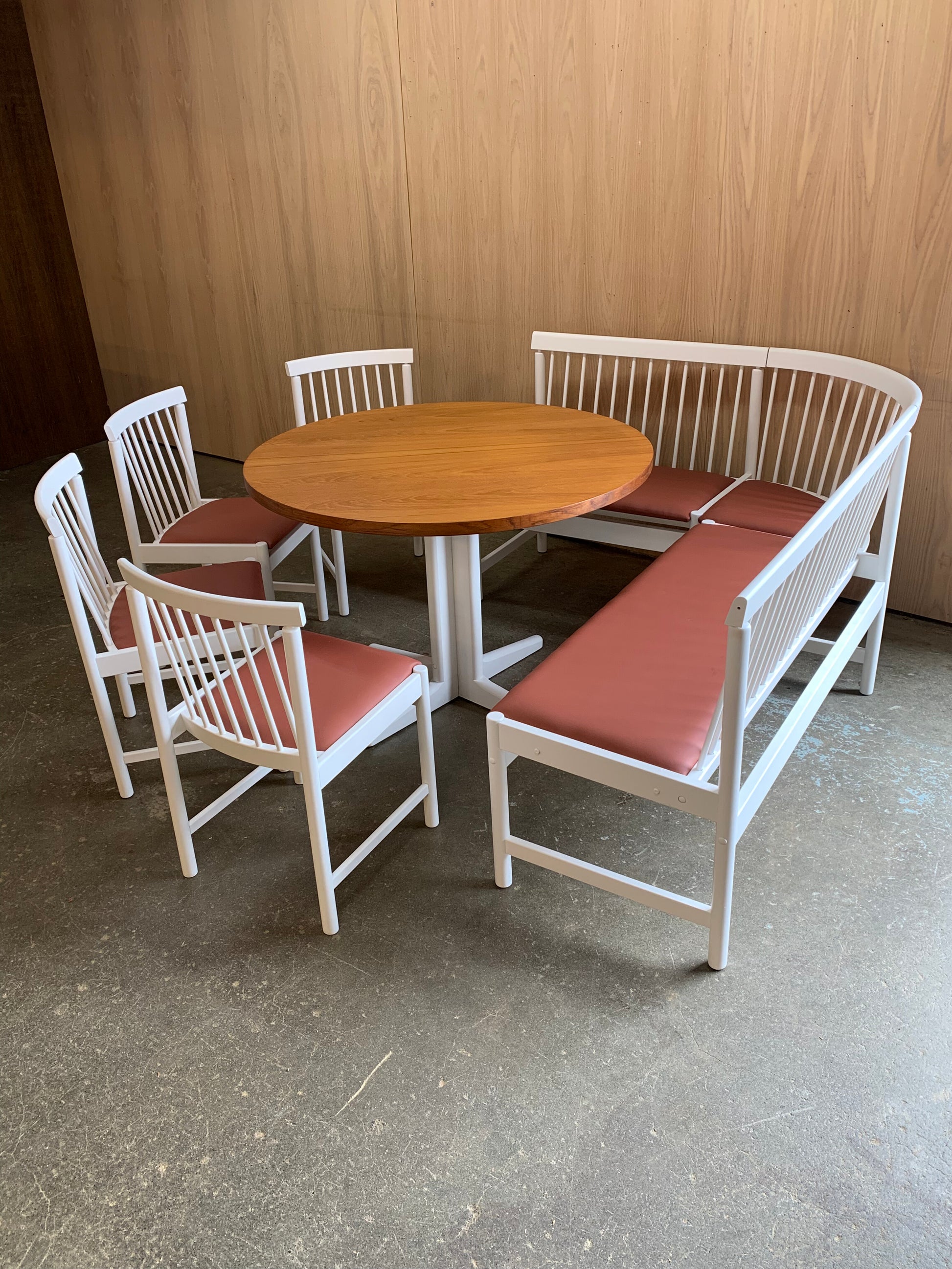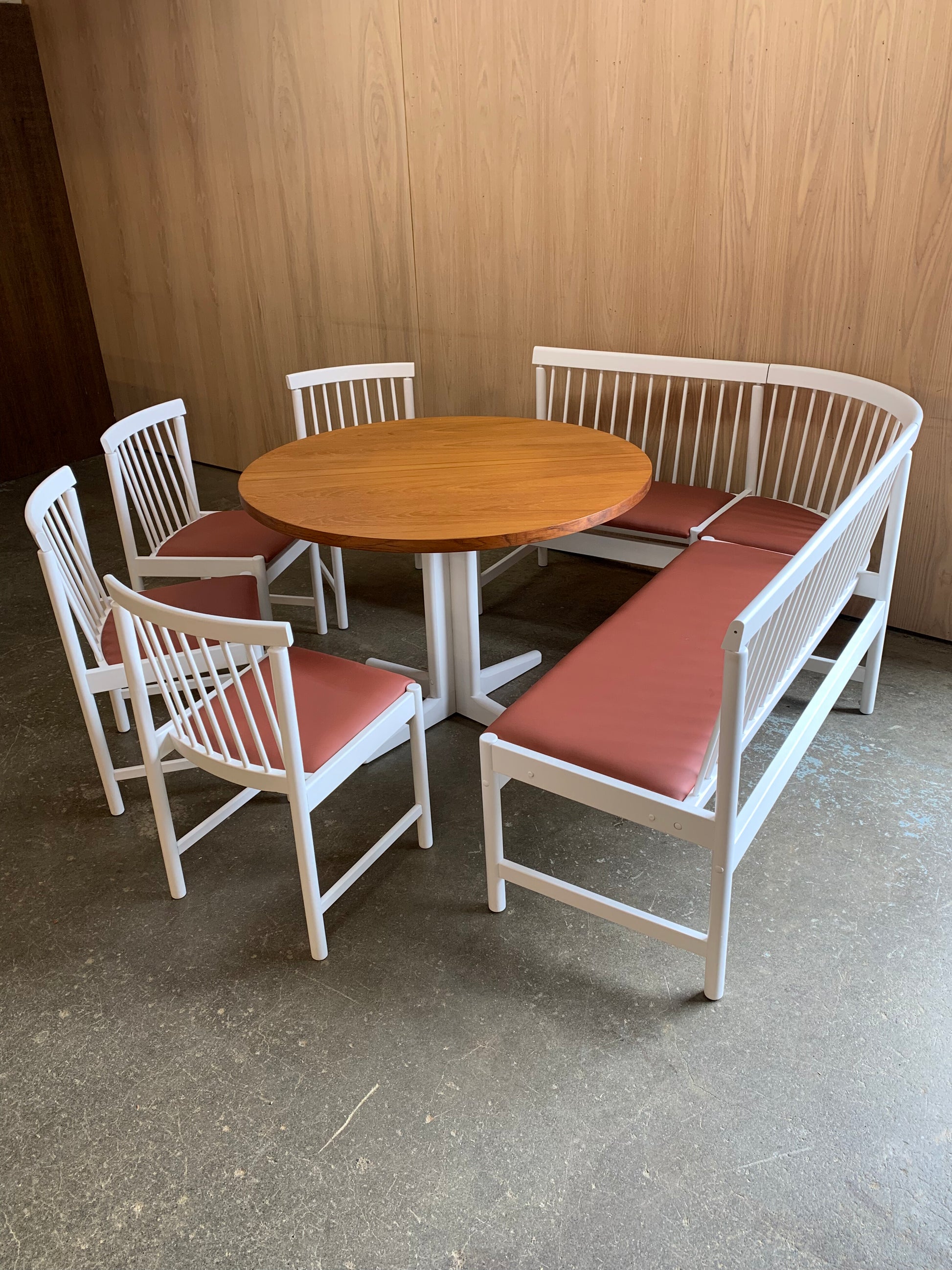 A rare and beautifully versatile dining set by Finnish maker Stika Lahti, dating to the 1960s. This charming suite includes a pair of spindle-back corner benches that form a cozy and intimate dining nook, complemented by four matching side chairs and a teak pedestal table.