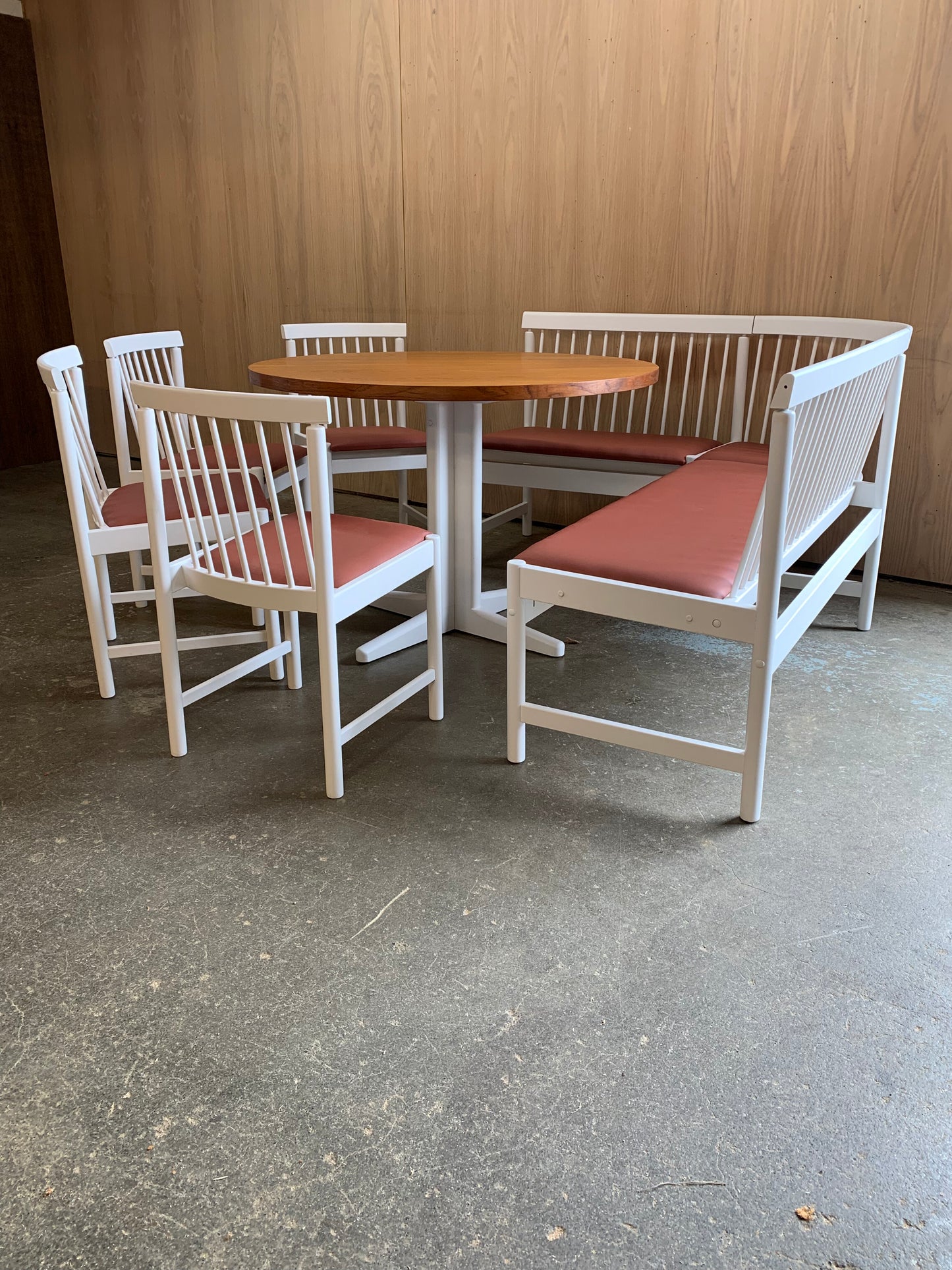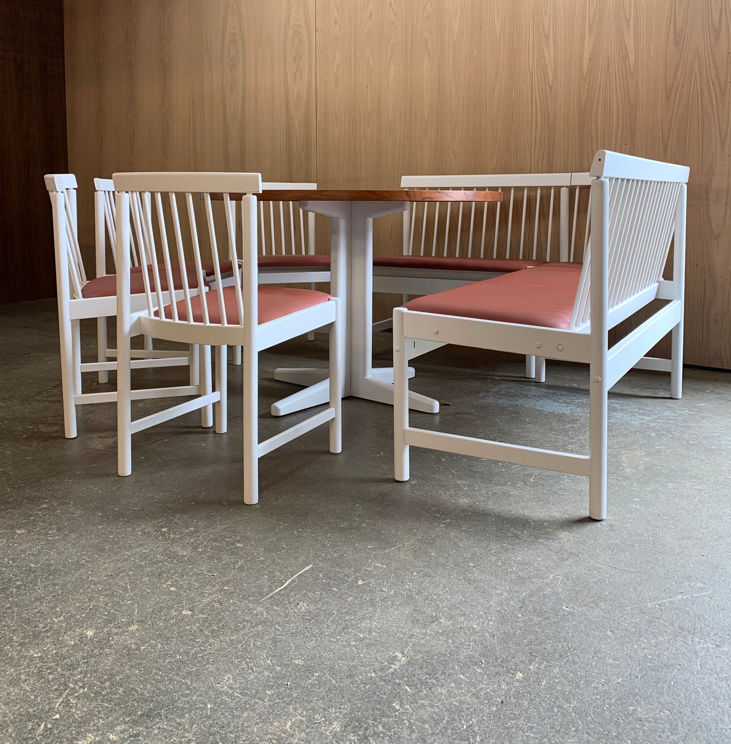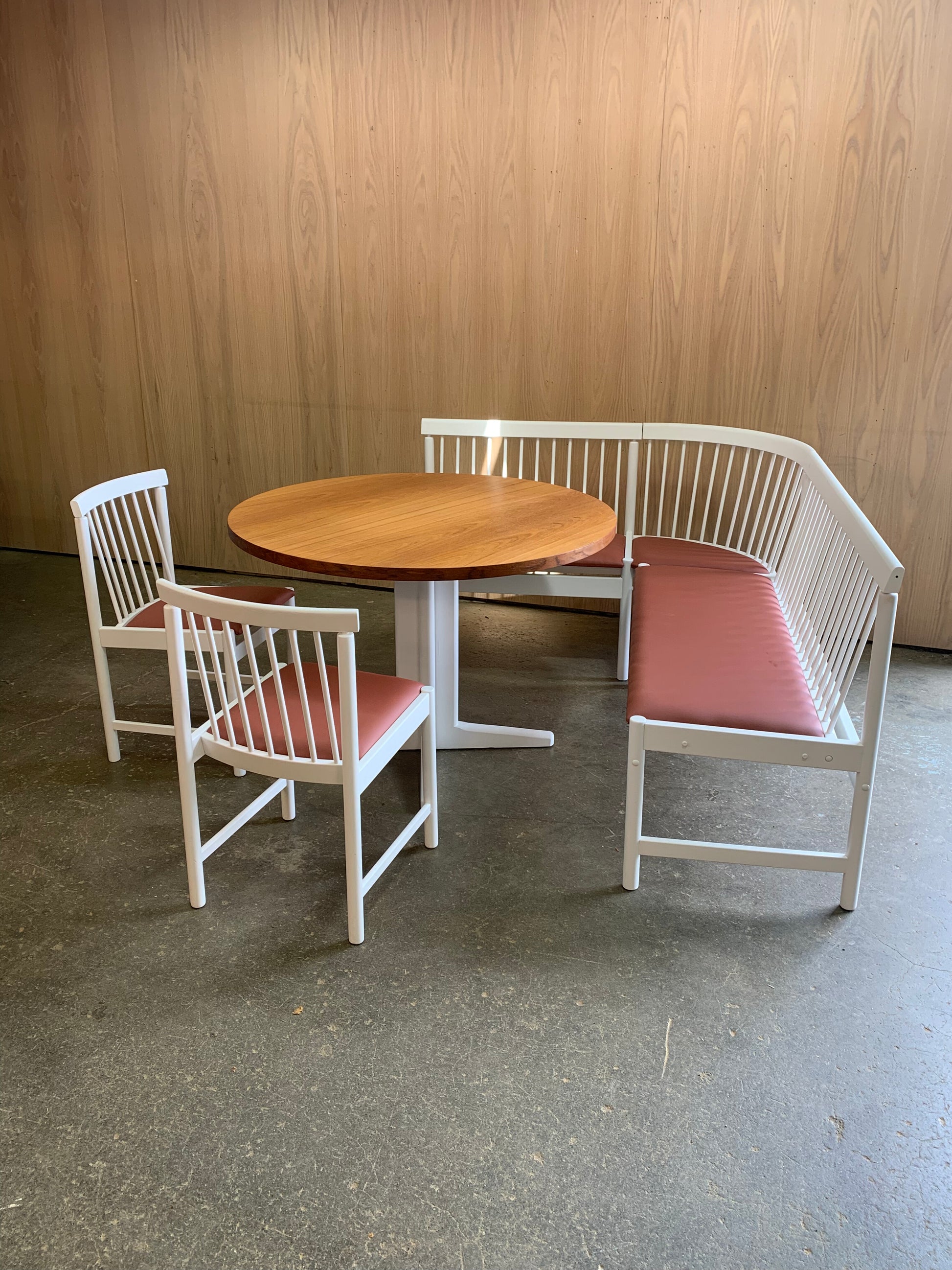 A rare and beautifully versatile dining set by Finnish maker Stika Lahti, dating to the 1960s. This charming suite includes a pair of spindle-back corner benches that form a cozy and intimate dining nook, complemented by four matching side chairs and a teak pedestal table.