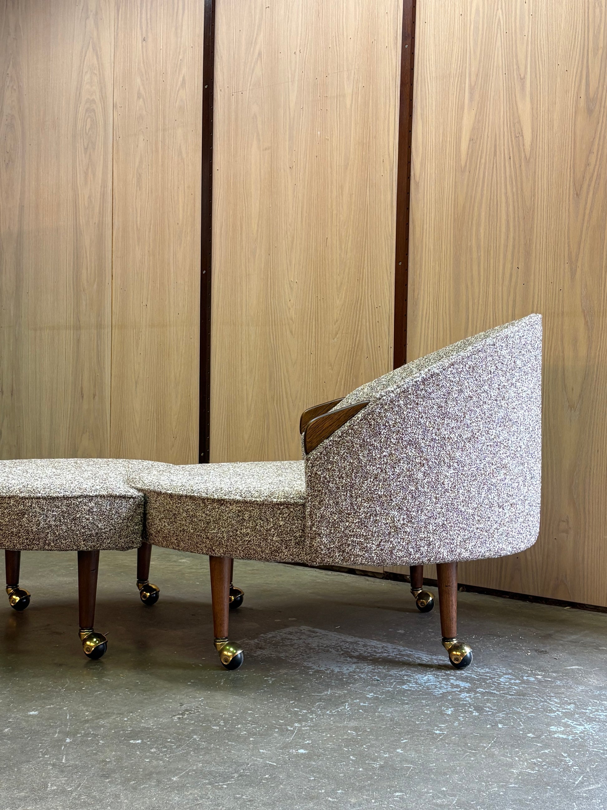 The generous, crescent-shaped seat and embracing backrest create a lounge experience that feels both playful and deeply comfortable. Subtle walnut arm details punctuate the soft curves, while the low, grounded stance and brass casters give the piece a quiet sense of glamour without tipping into excess. Paired with its matching ottoman, the Havannah invites you to truly settle in.