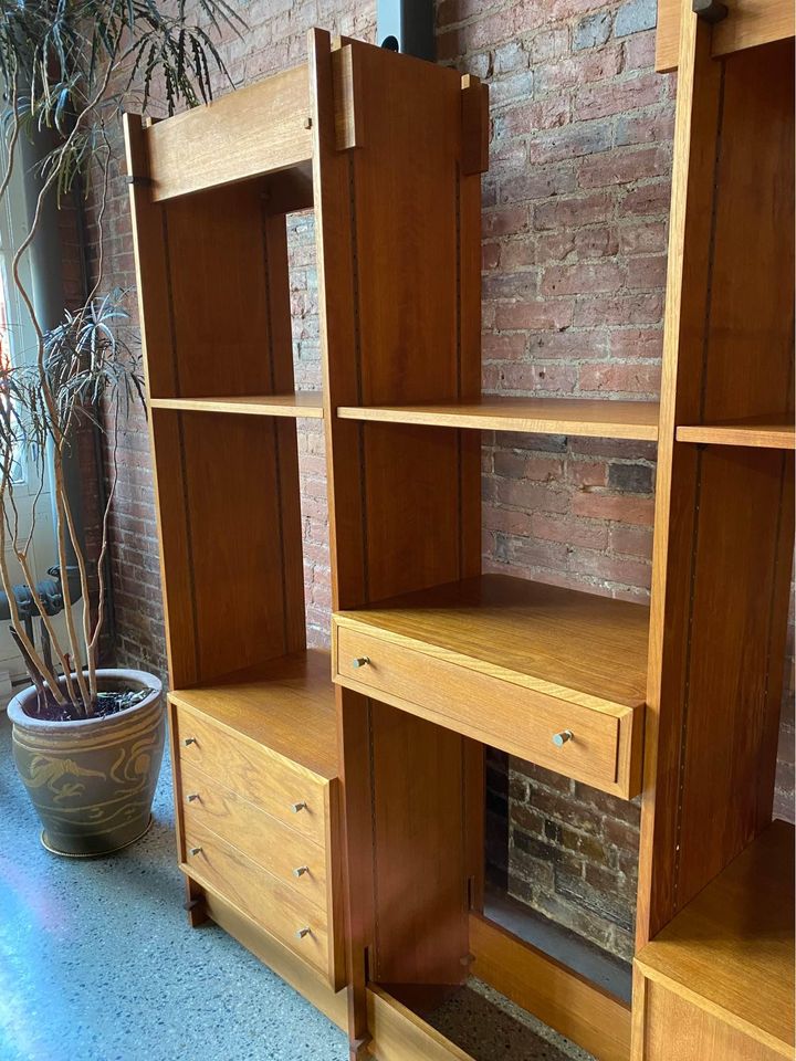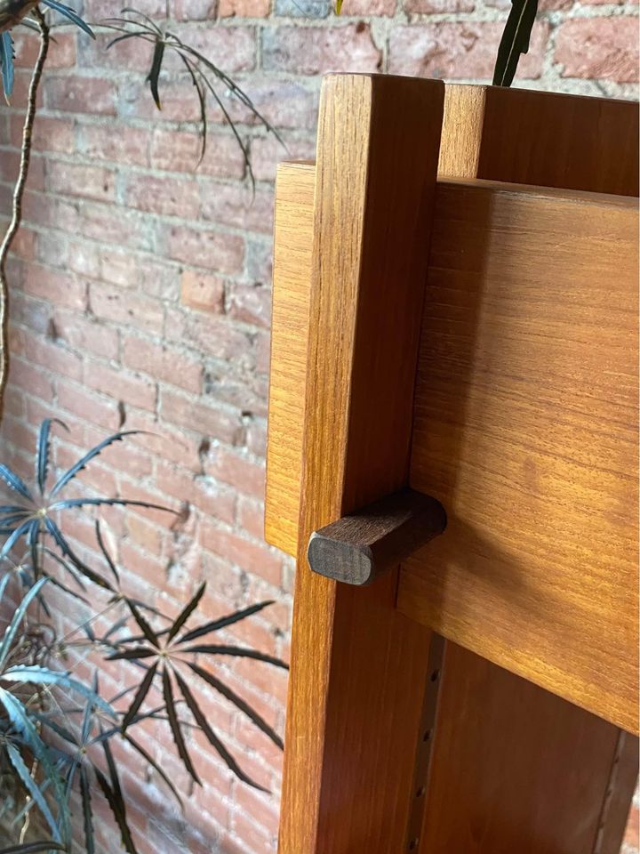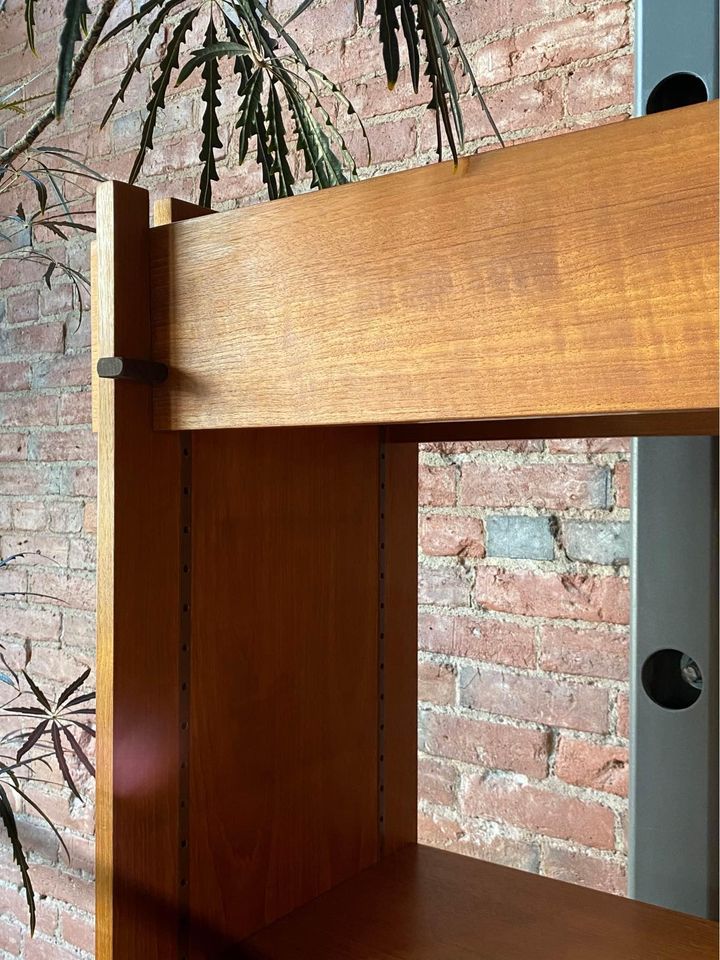 Nice quality teak wall system from the 1970s. This piece features a clever click together assembly with “tusk” tenons and no screws. It’s really sturdy and in excellent condition.