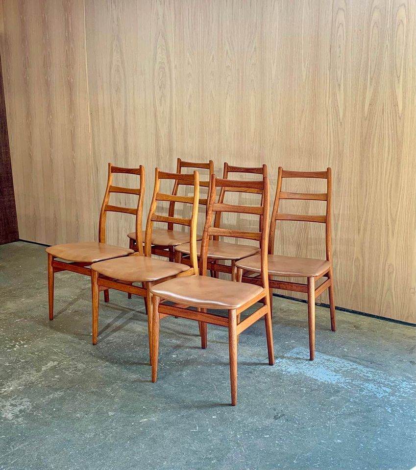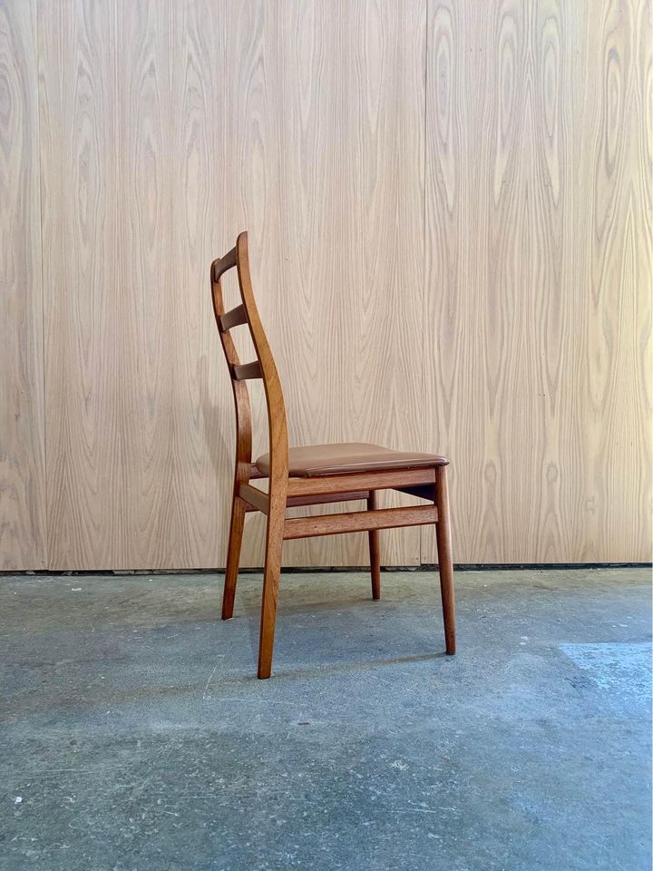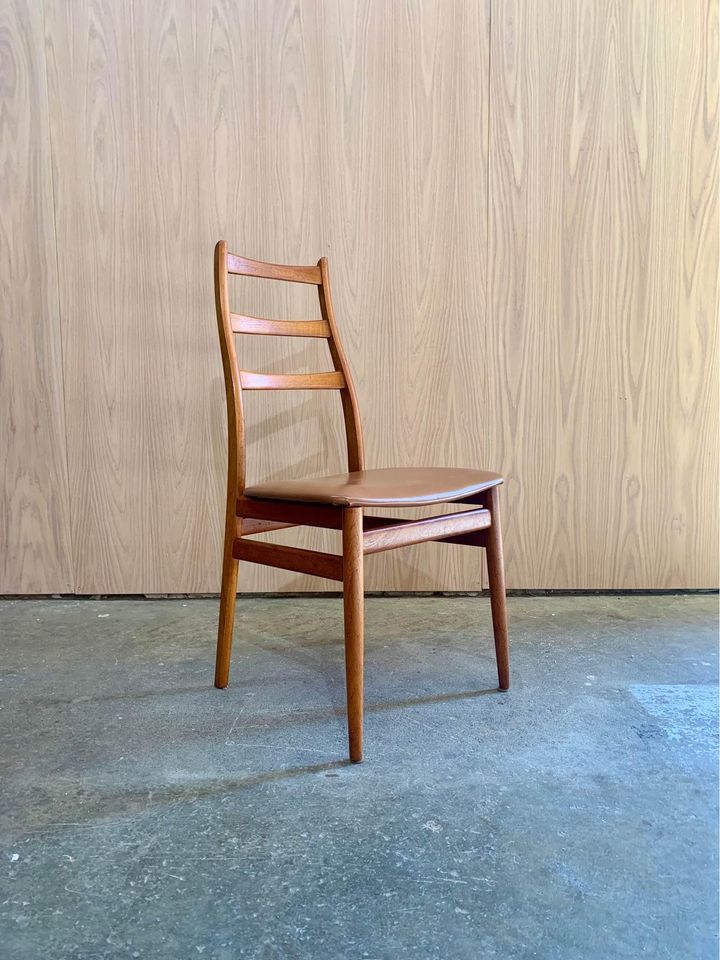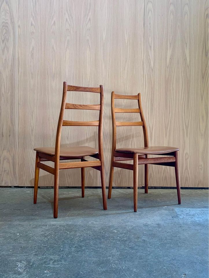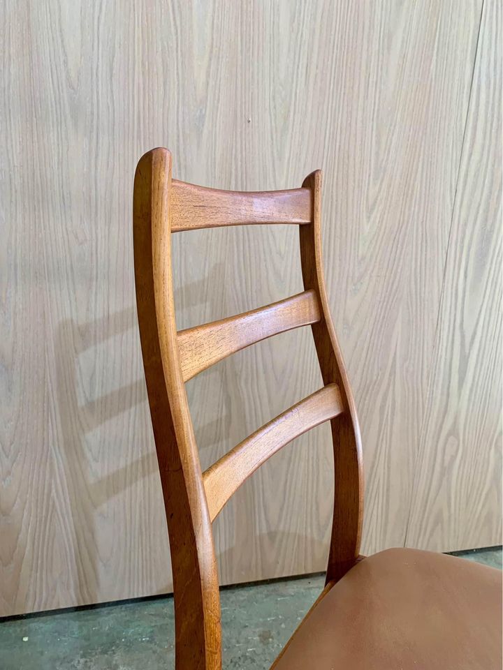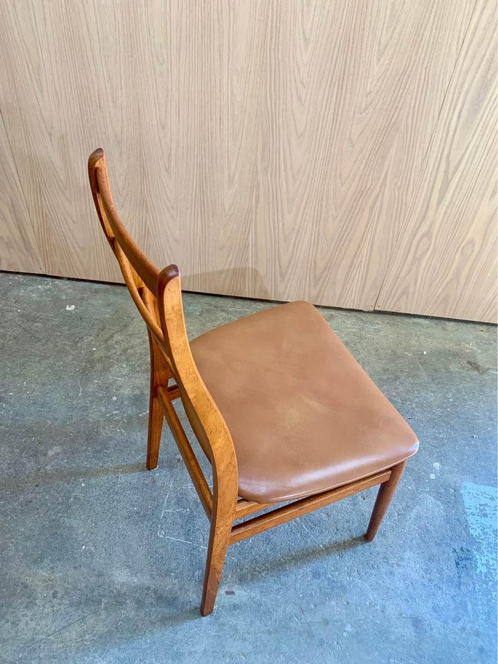 Fresh to the market is a sleek set of vintage teak dining chairs, crafted in Norway during the 1960s. These chairs boast elegantly sculpted frames with smooth angles and gentle curves throughout. Freshly restored with new leather and foam, they’re ready to bring grace and style for another 60 years.