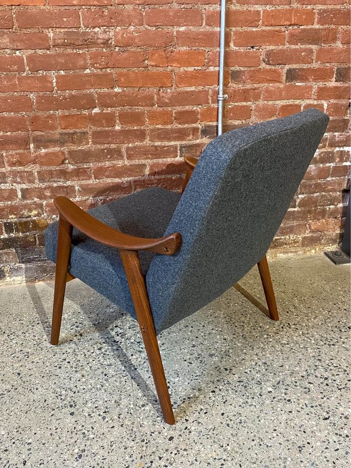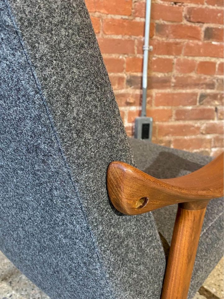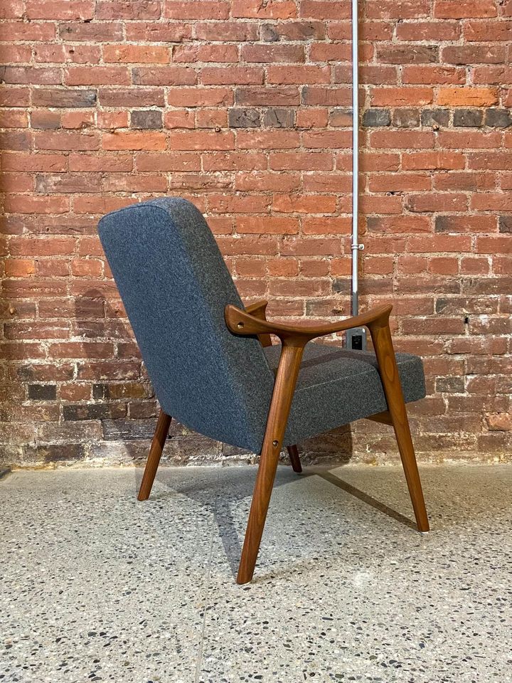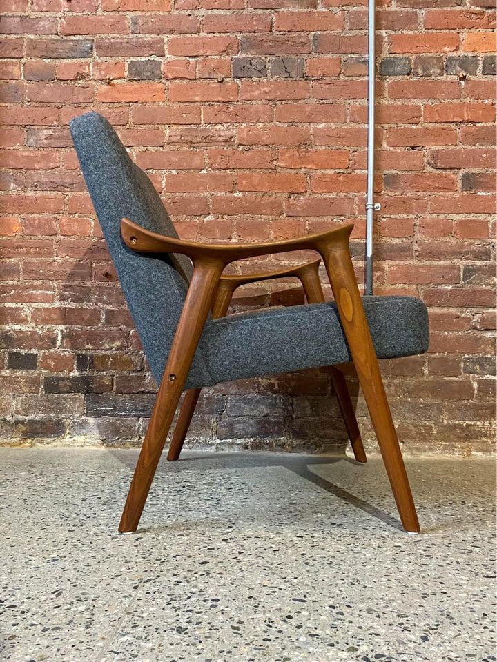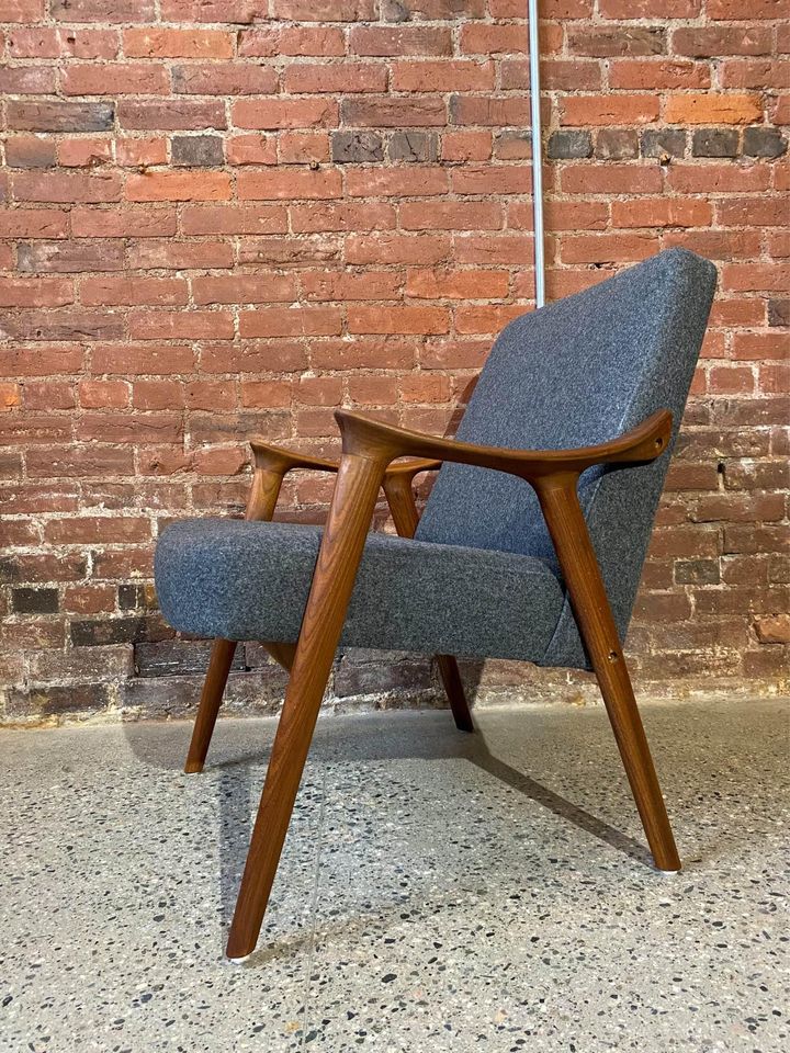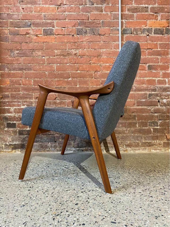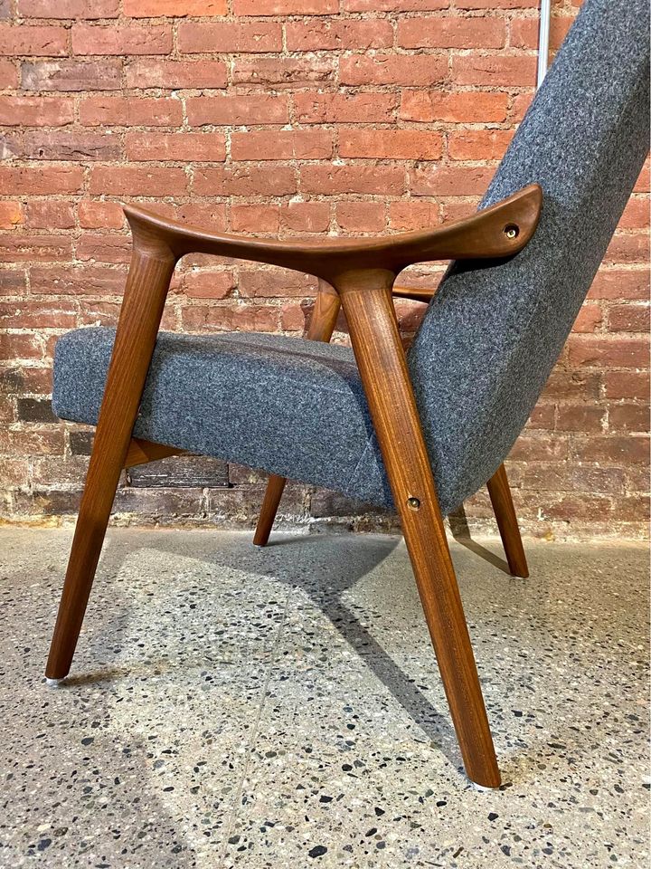Classic Scandinavian Modern 'Klarinett' lounge chair by Møre Lenestol Fabrikk A/S circa 1960s. This charming little piece is freshly restored with new foam and “Divina” fabric by Kvadrat Textiles. The condition is excellent.