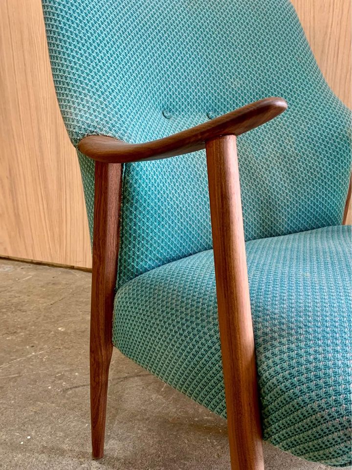 New to our collection is a striking Norwegian lounge chair from the 1960s, featuring a solid walnut frame and elegant mid-century lines. Despite its compact footprint, it offers a spacious and comfortable seat. Expertly restored by our team, this chair is in excellent condition.
