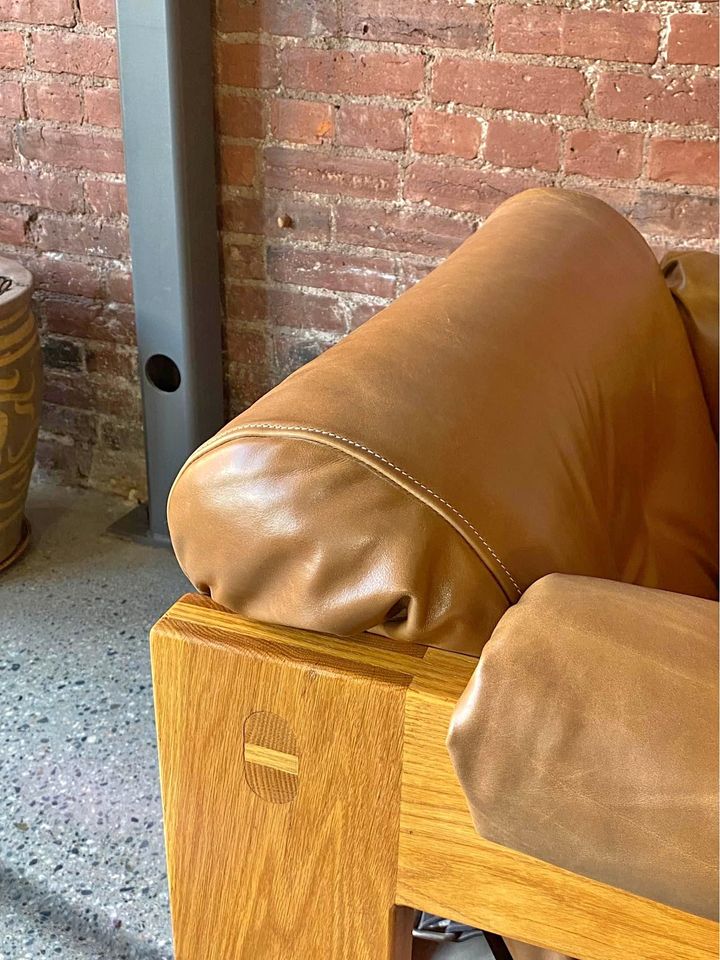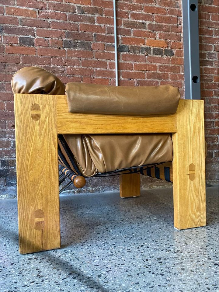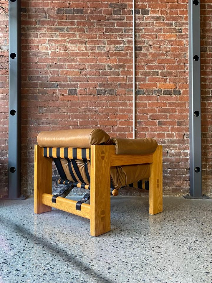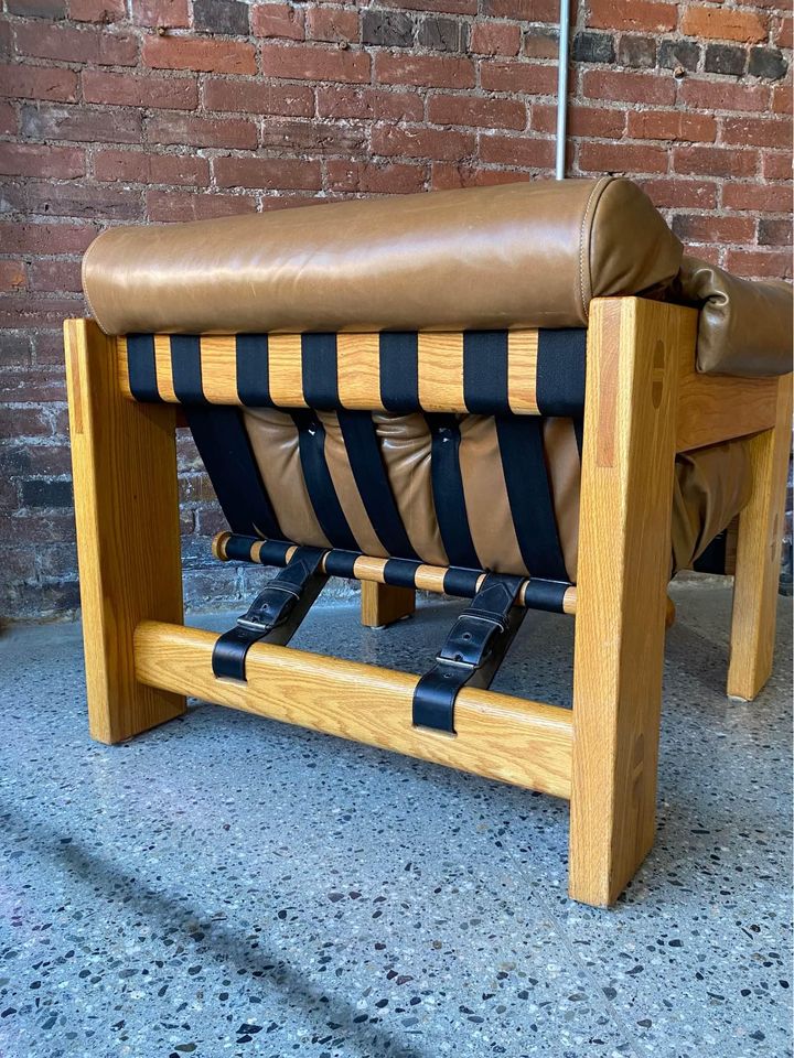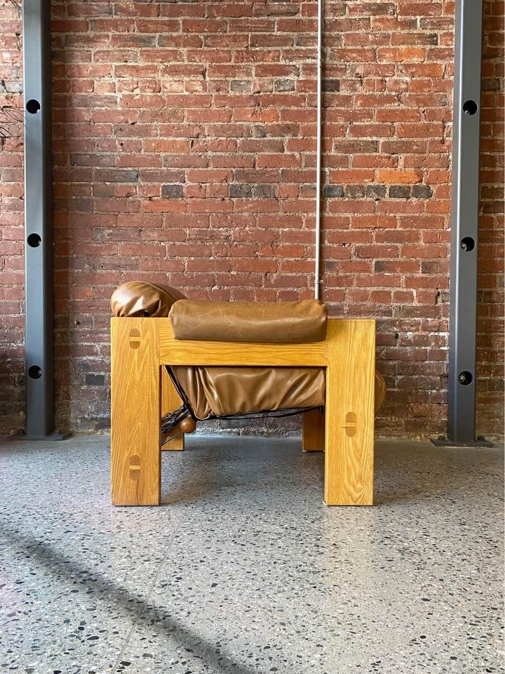 Incredibly high quality solid oak lounge chair with robust exposed joinery by Canadian designed Paul Arno. This piece is freshly restored with top grain aniline leather and is in fantastic condition (super comfy too!).