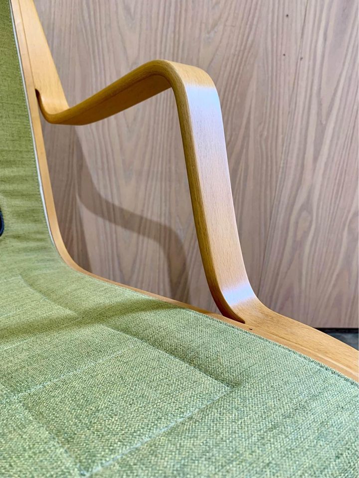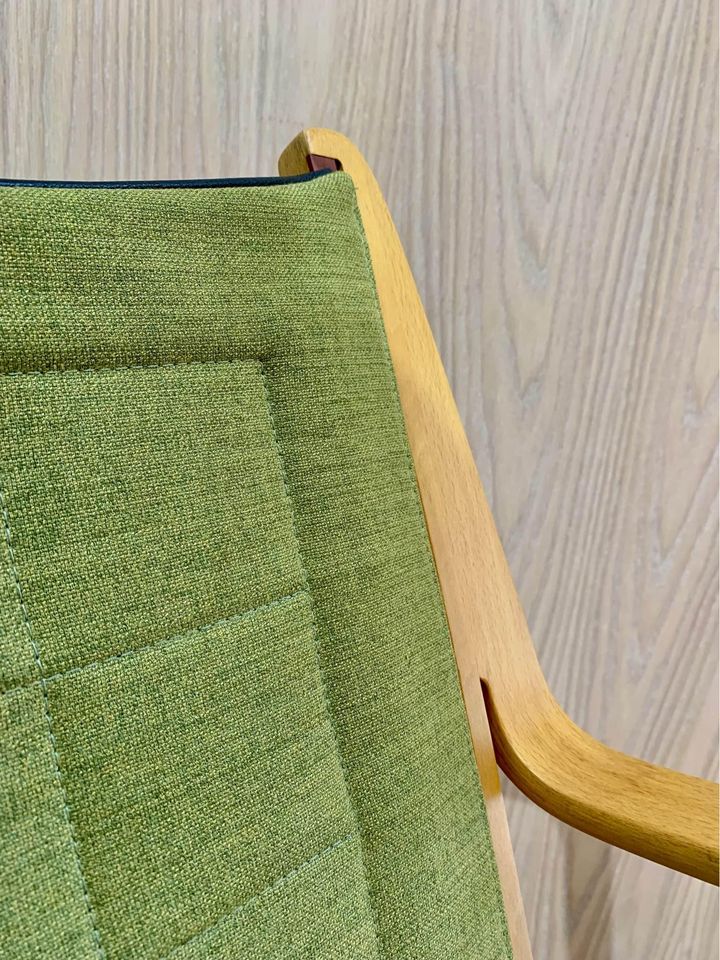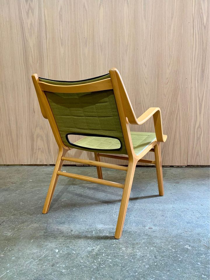 New to our collection is an exquisite "Axe" chair, designed by Peter Hvidt for Fritz Hansen. This rare variant features an upholstered seat complemented by elegant leather accents. Recently restored by our team, it is now in excellent condition.