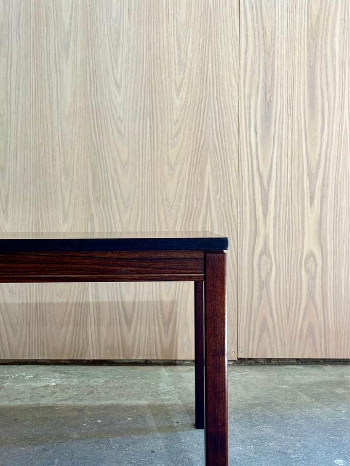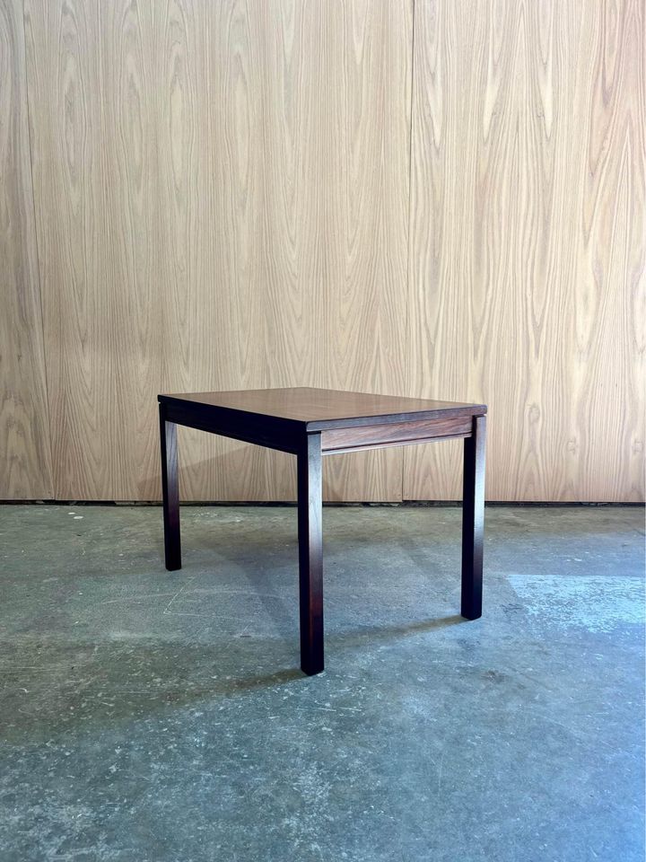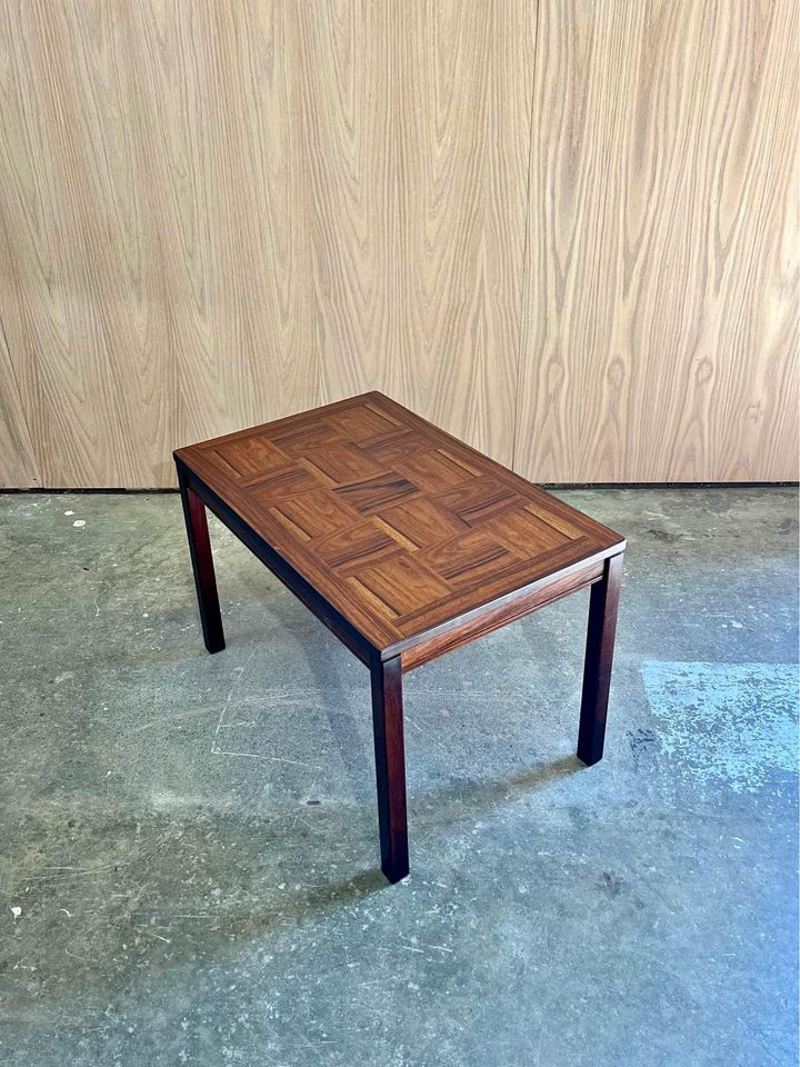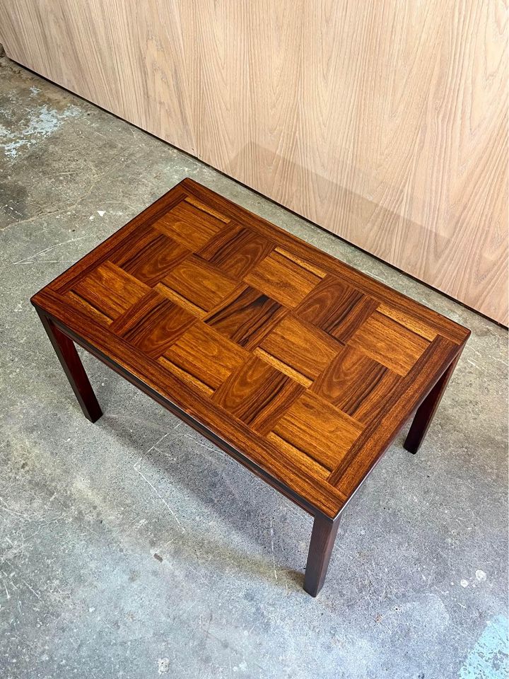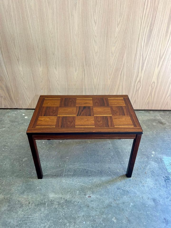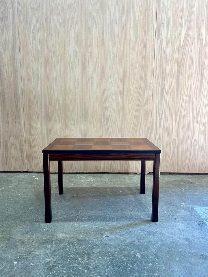 Introducing this 1960s rosewood side table by P.S. Heggen, made in Norway. Featuring a stunning checkerboard design with exquisite grain, this table exemplifies clean, simple lines and timeless Scandinavian design. Crafted with a rosewood veneer top and a solid rosewood base, it adds a touch of elegance to any living space.