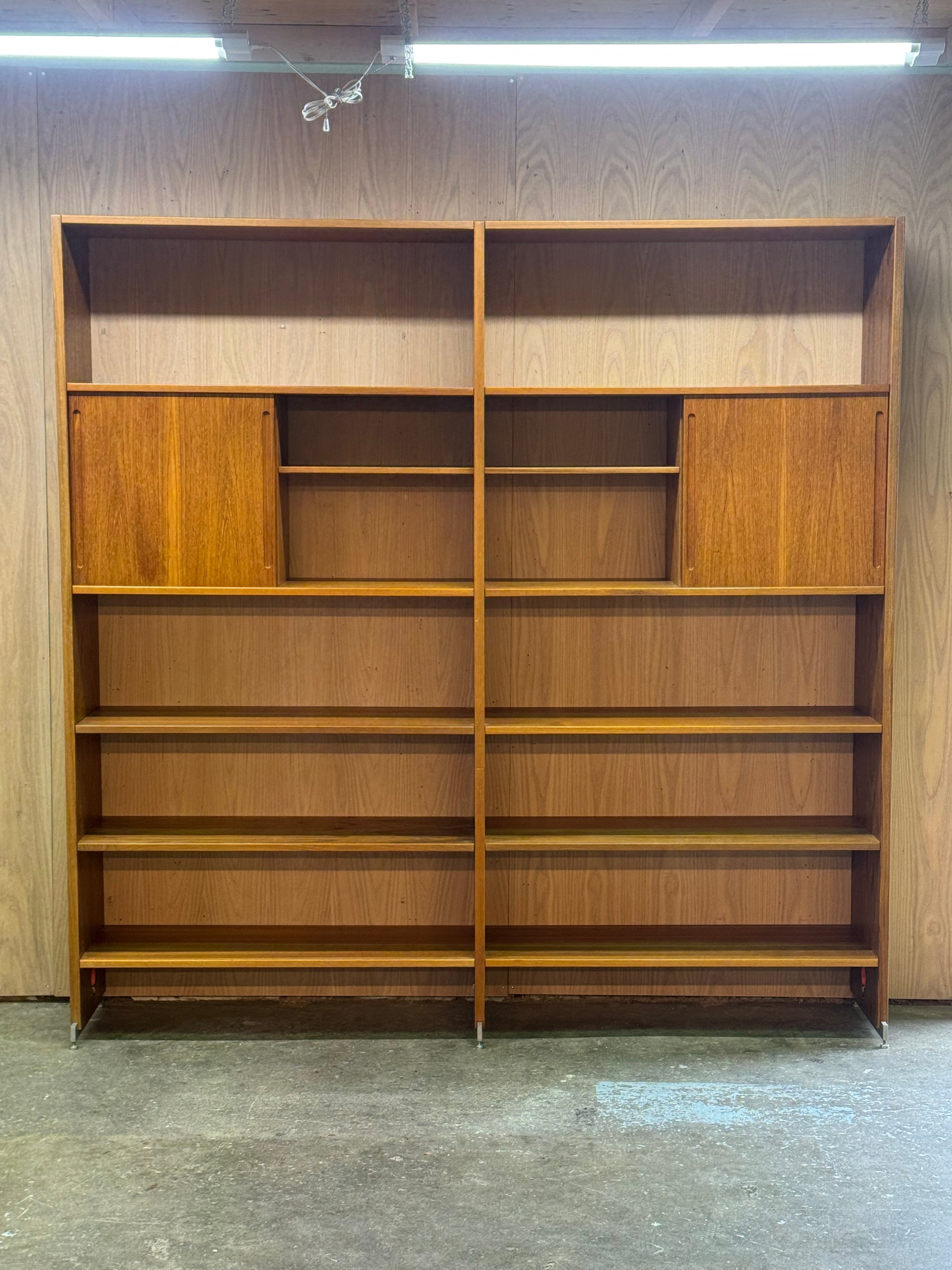 This RY wall unit was designed by Hans J. Wegner and produced by Ry Mobler in Denmark during the 1960s. The system is composed of two narrow modules, each measuring approximately 39.5 inches internally, forming a balanced and architectural composition.