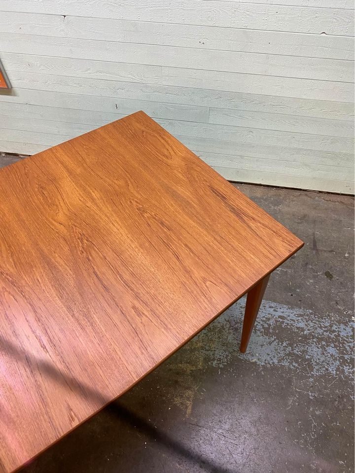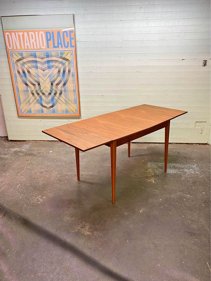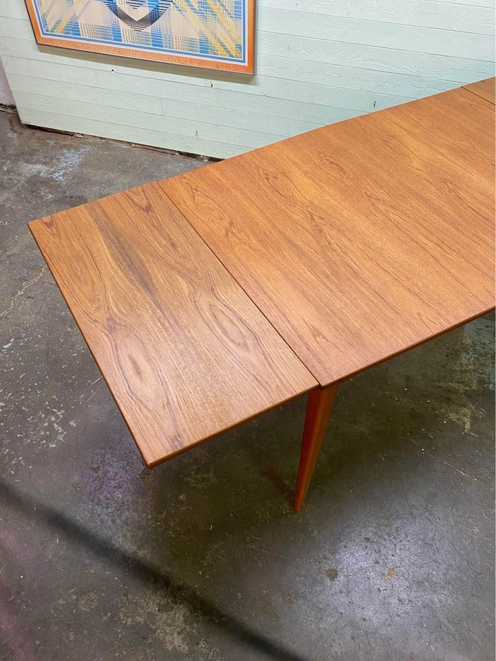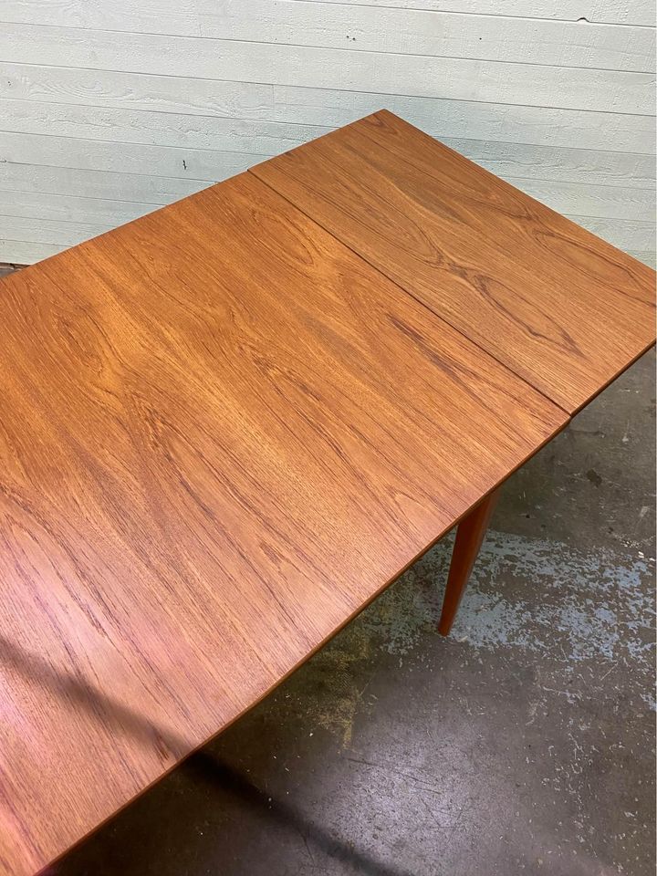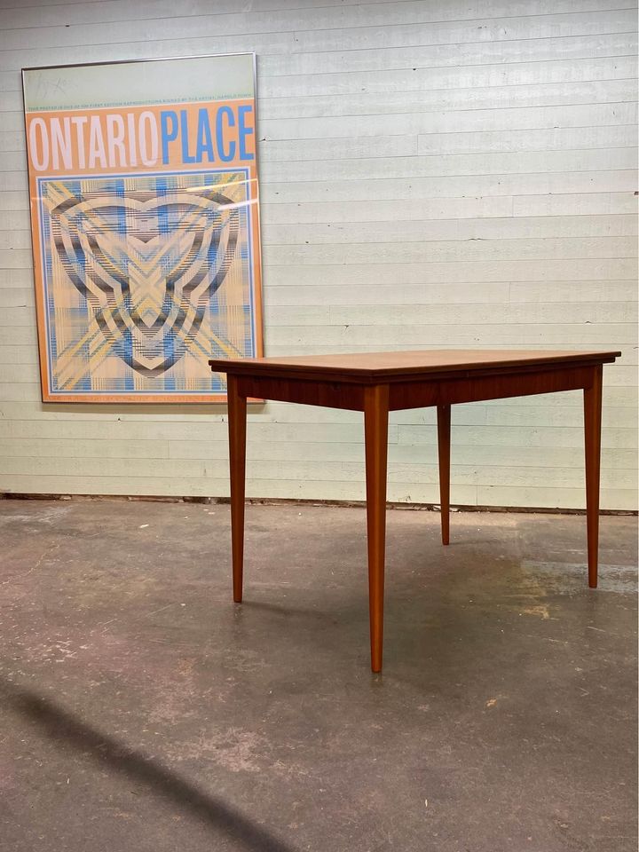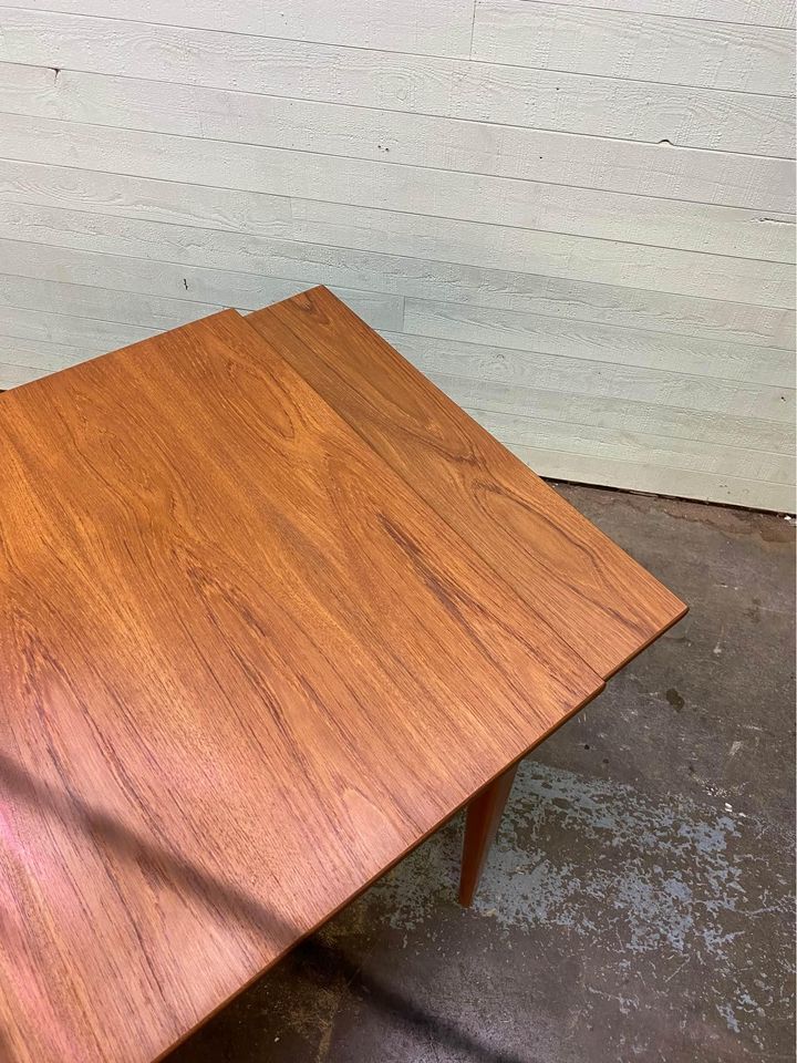 A distinctive small-scale Scandinavian teak dining table, this compact gem boasts two self-storing leaves, sleek straight tapered legs, and a subtly polygonal-shaped surface. Recently, our dedicated team conducted a meticulous restoration, ensuring it now stands in excellent condition.