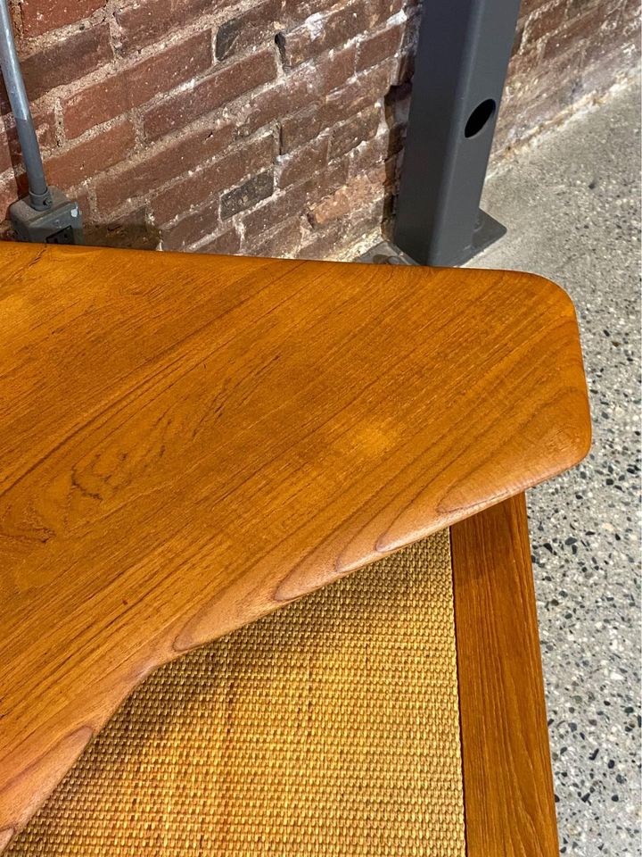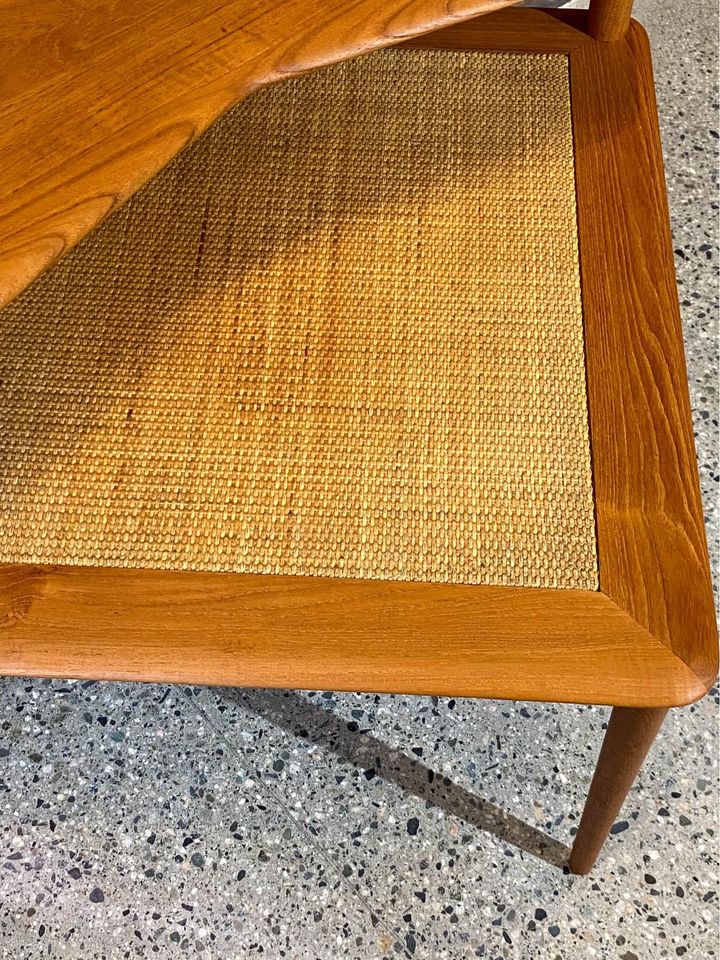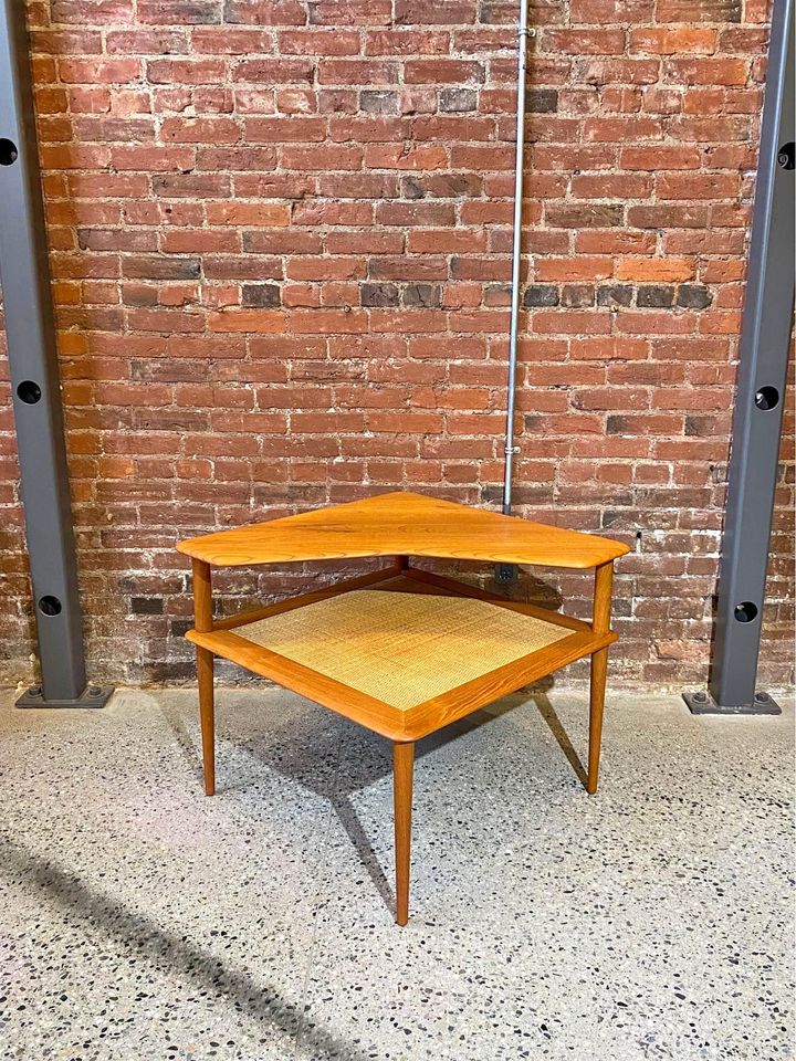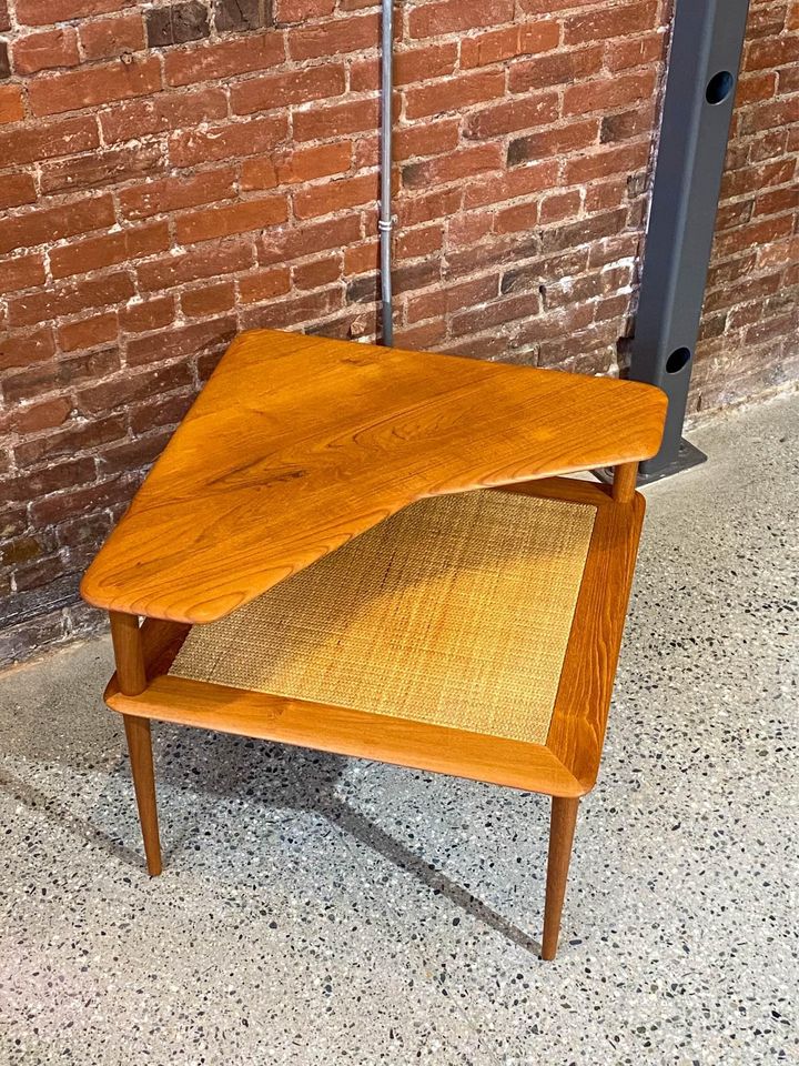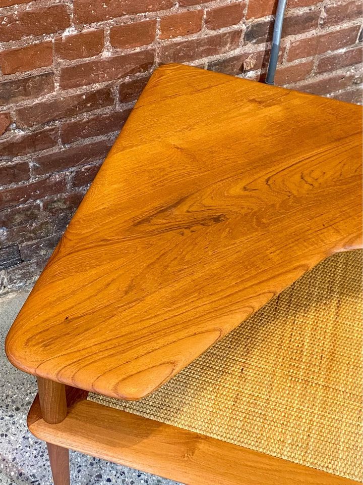 A delightful complement to contemporary interiors, this exquisite corner table, crafted by Peter Hvidt for France & Son during the 1960s, boasts a gracefully patterned solid teak top and an impeccably fashioned pleated rattan lower surface. Meticulously restored by our team, it now shines in excellent condition.