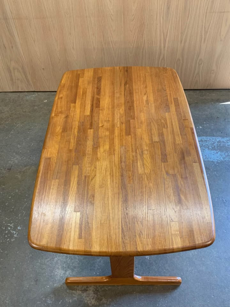A rare find from Canadian mid-century design, this 1960s solid teak dining table by RS & Associates of Montreal stands out for its clean lines, sculptural silhouette, and exceptional craftsmanship. Built from solid teak—not veneer—the tabletop features a rich parquet grain pattern that showcases the natural beauty and variation of the wood.