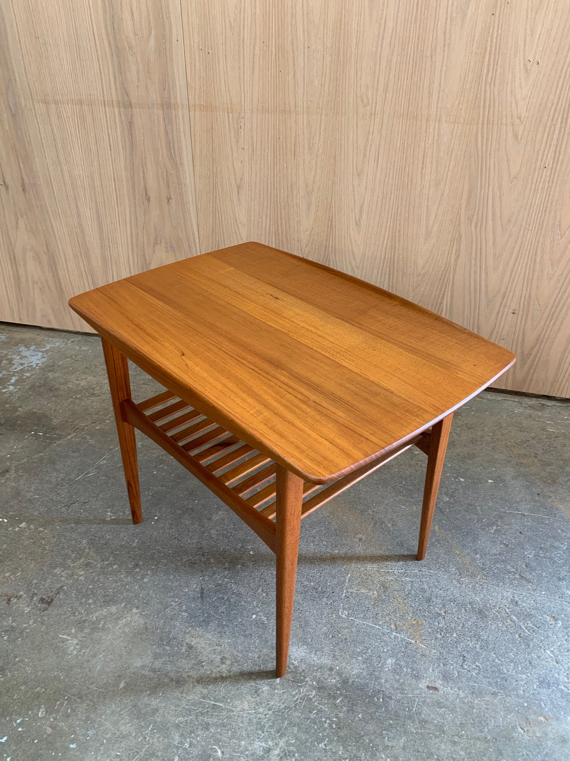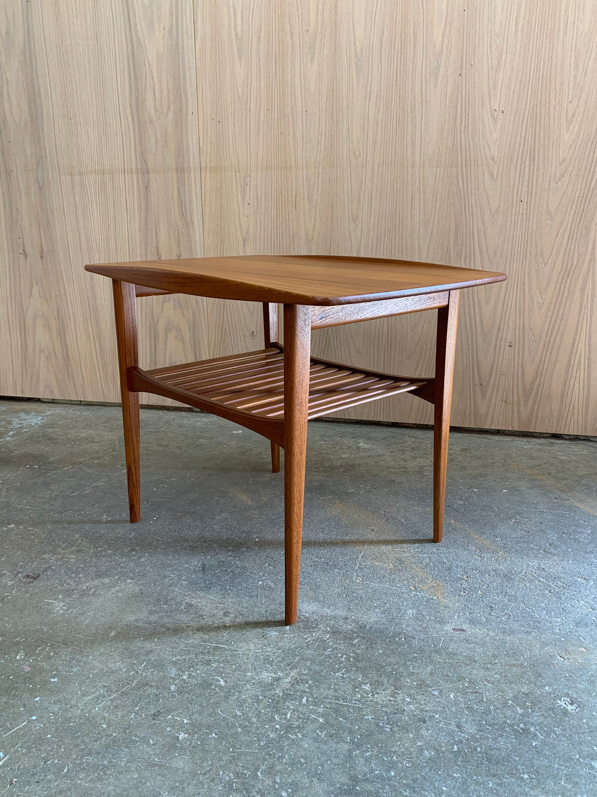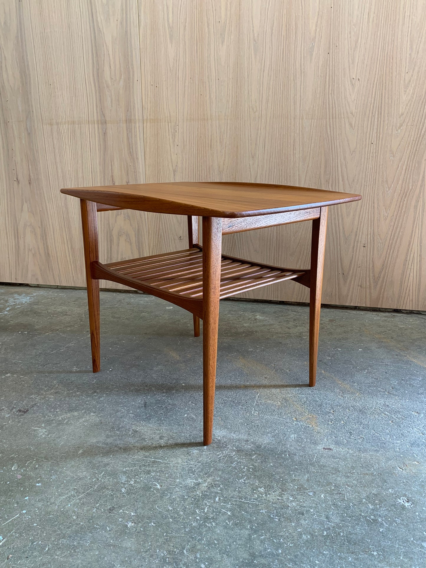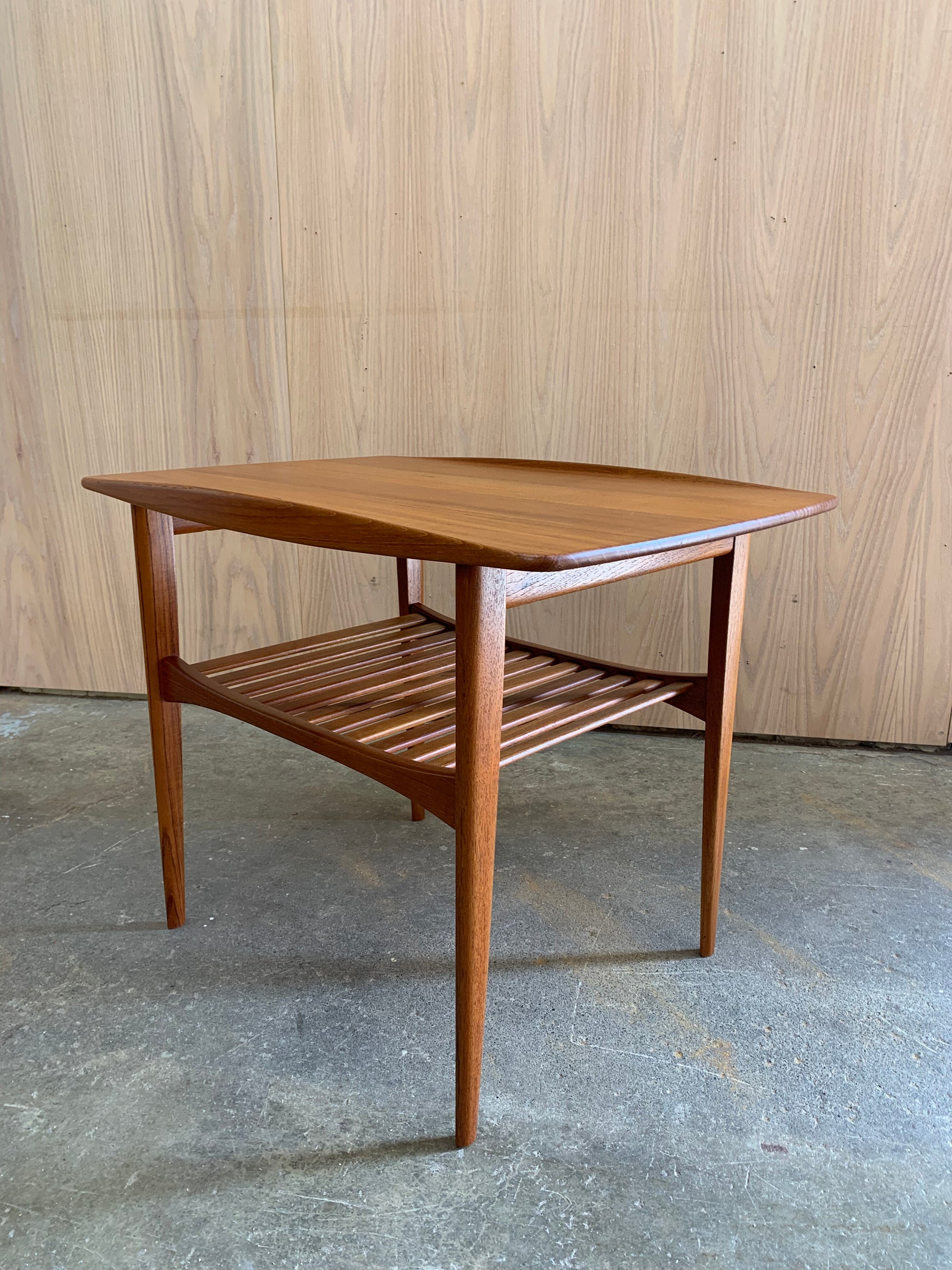 Designed by Edvard Kindt-Larsen and produced by France & Son, this 1960s solid teak side table is a quiet masterclass in Danish craftsmanship. The sculpted top features a softly flared edge that gives the piece an elegant lift, while the lower slatted shelf curves gently upward—perfectly engineered to keep magazines or books from sliding off.