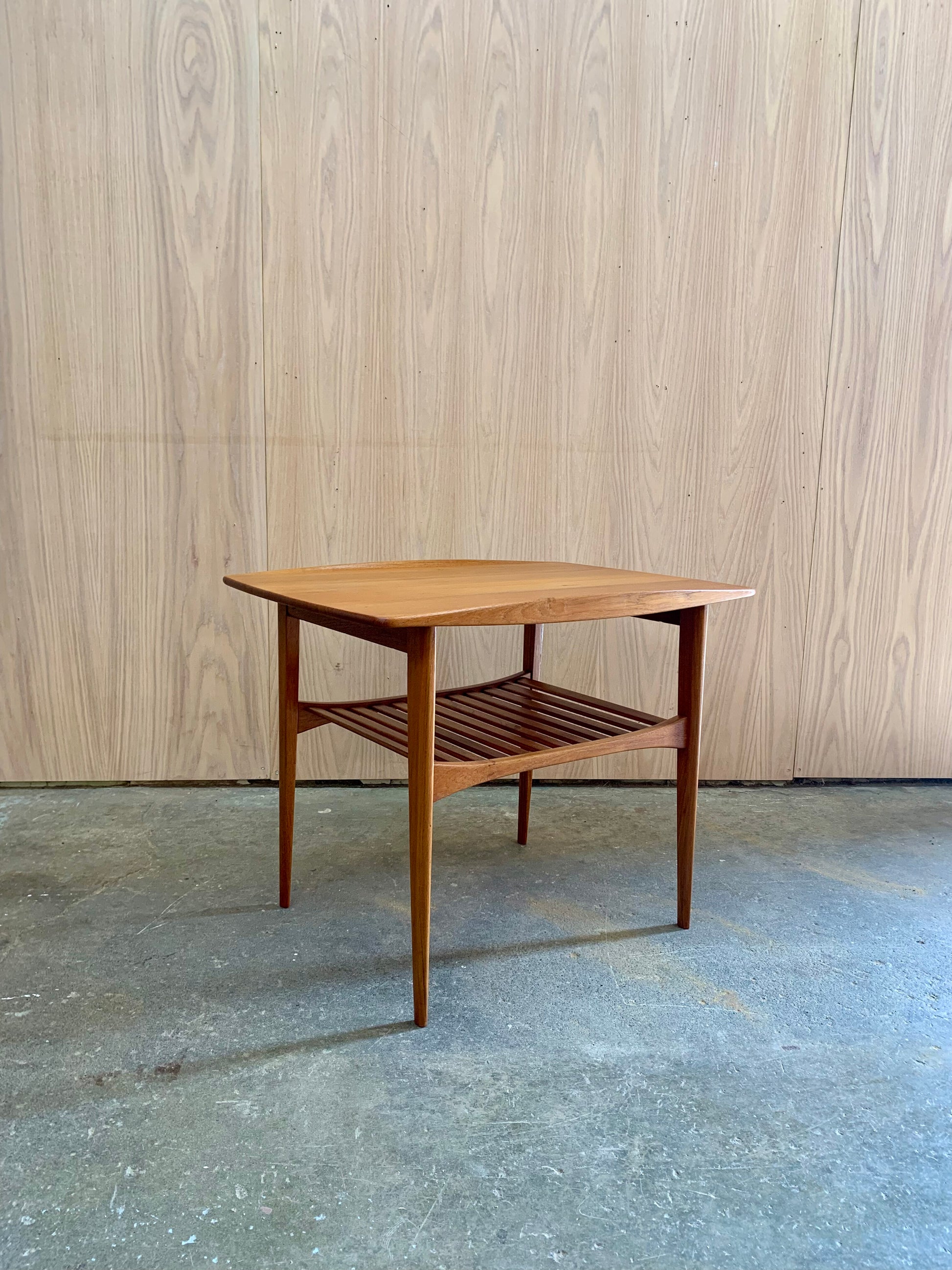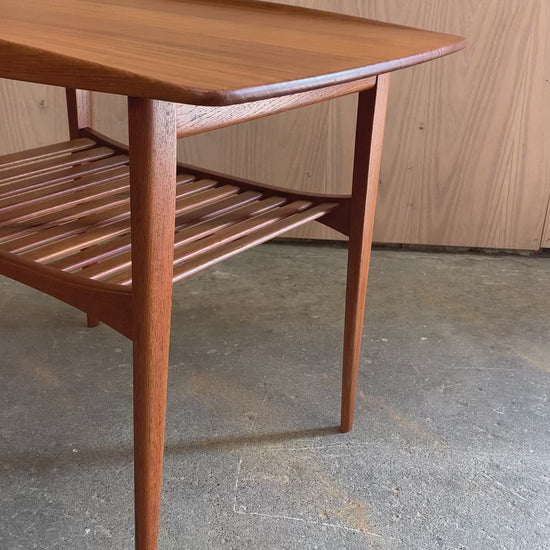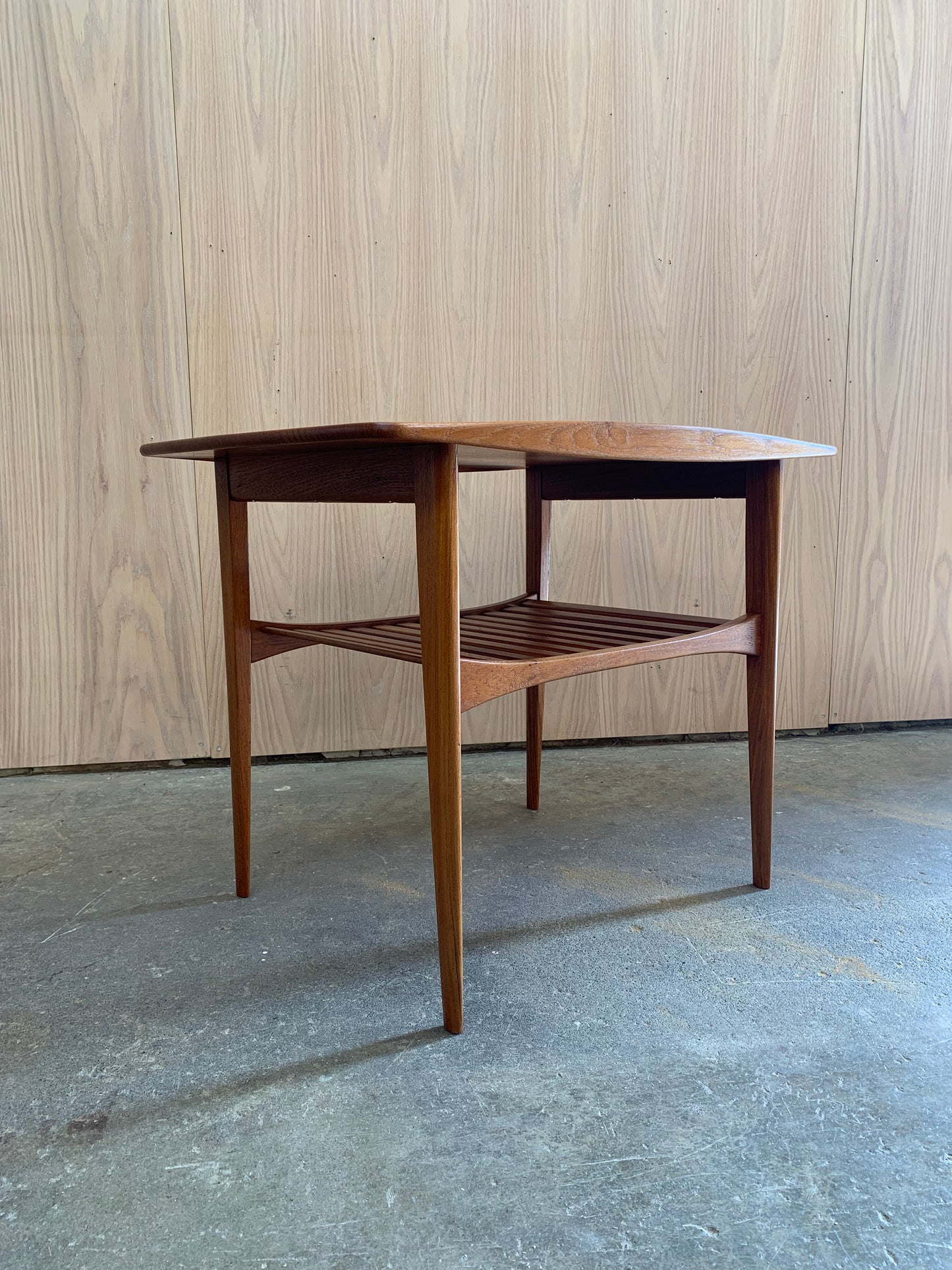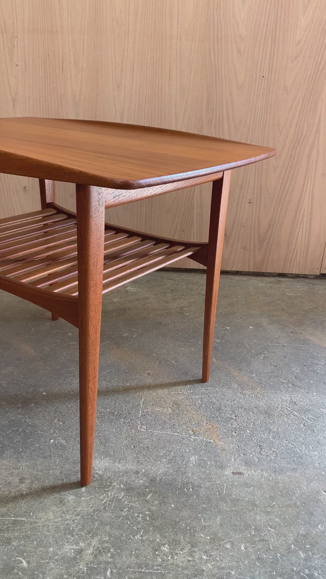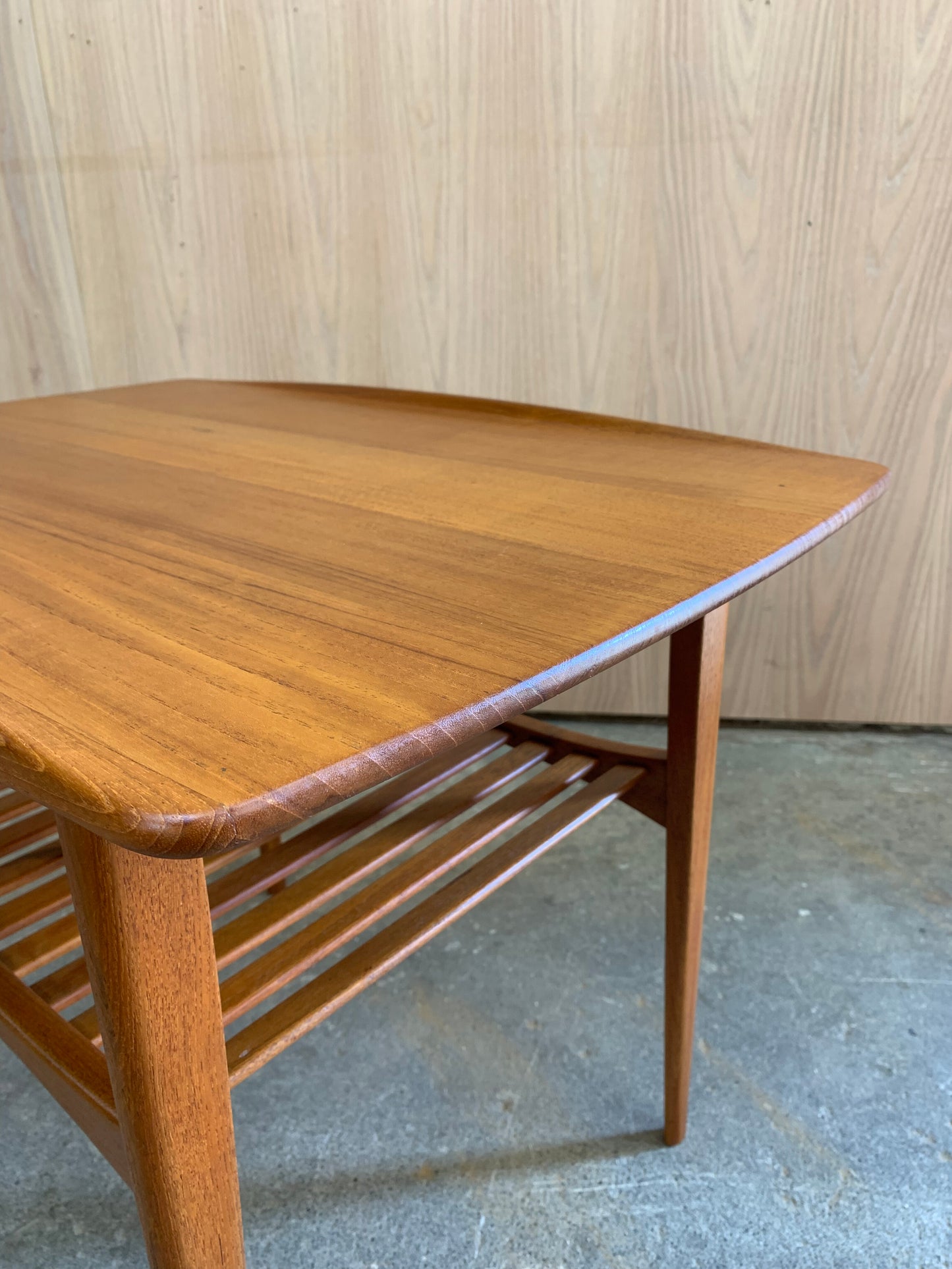 Designed by Edvard Kindt-Larsen and produced by France & Son, this 1960s solid teak side table is a quiet masterclass in Danish craftsmanship. The sculpted top features a softly flared edge that gives the piece an elegant lift, while the lower slatted shelf curves gently upward—perfectly engineered to keep magazines or books from sliding off.