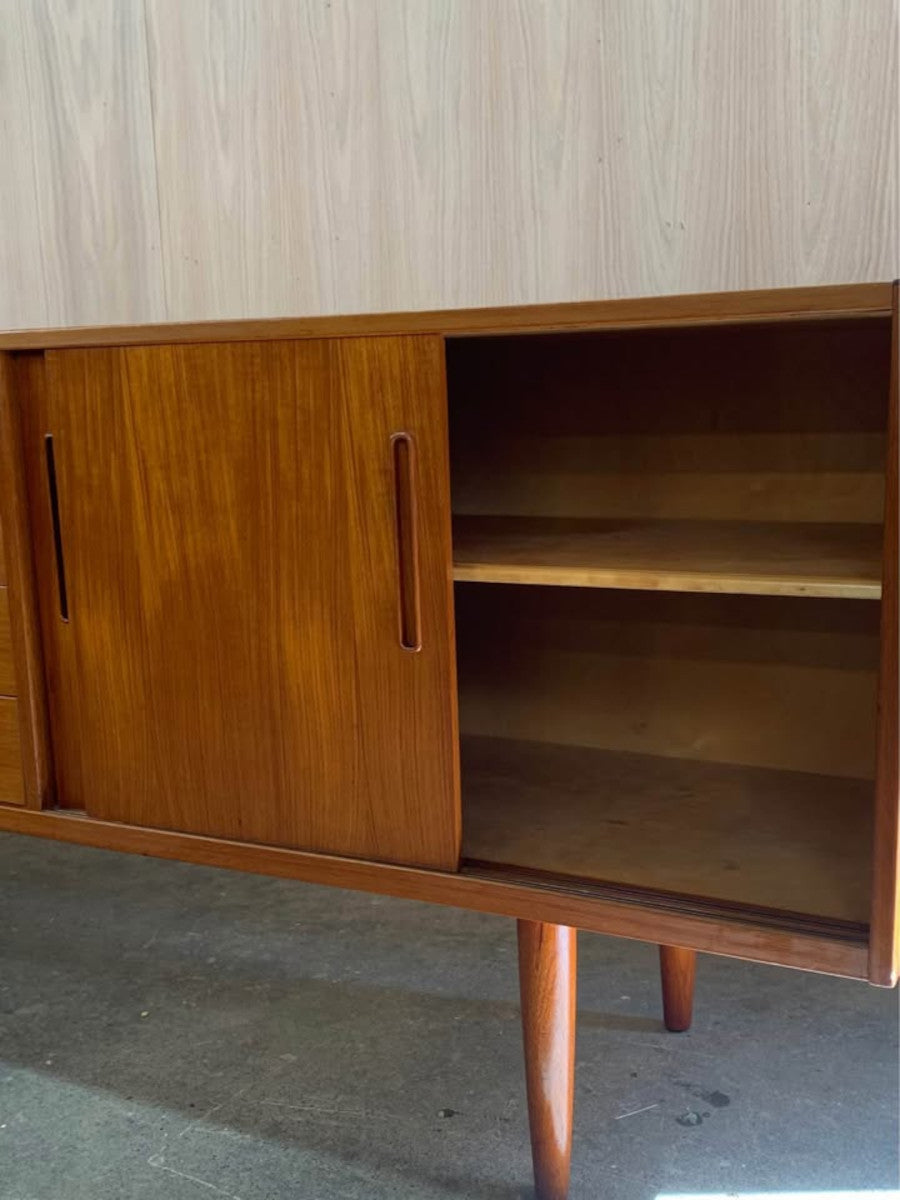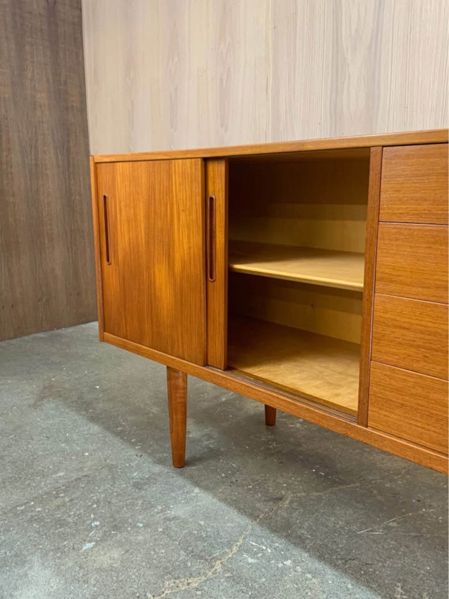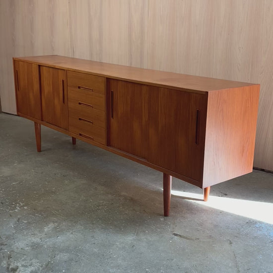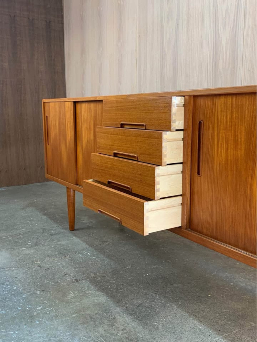 Designed by Nils Jonsson for Troeds of Sweden, this 1960s teak credenza is a prime example of Scandinavian modern design at its most functional and refined. Its clean lines, sliding doors, and sculpted recessed pulls create a balanced and timeless aesthetic, while the rich teak grain offers warmth and natural character.