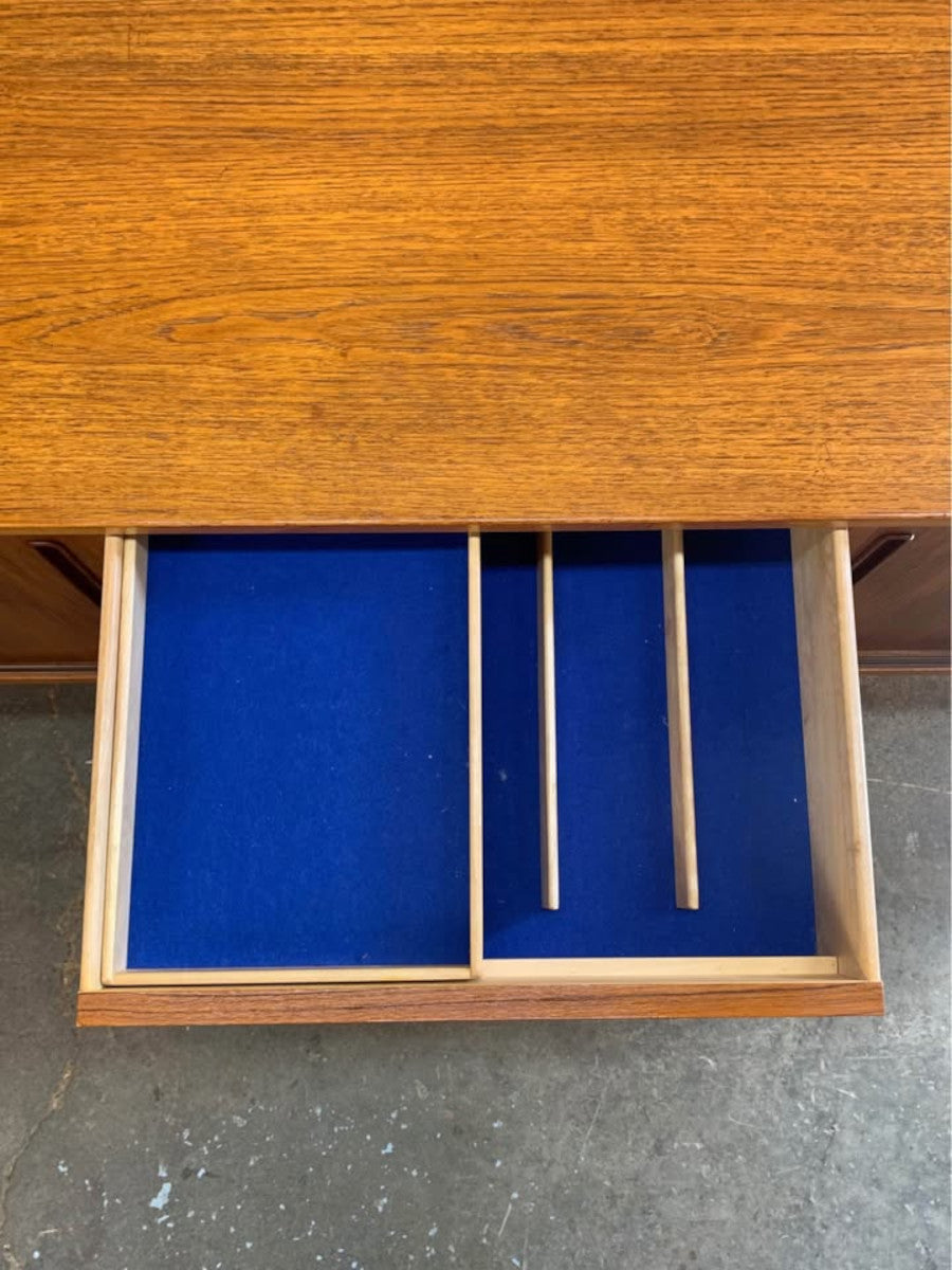 Inside, you’ll find a versatile mix of adjustable shelving and four dovetailed drawers — one of which includes a beautifully preserved felt-lined cutlery organizer. The piece sits on tapered solid wood legs, giving it a light and airy presence despite its generous storage capacity.