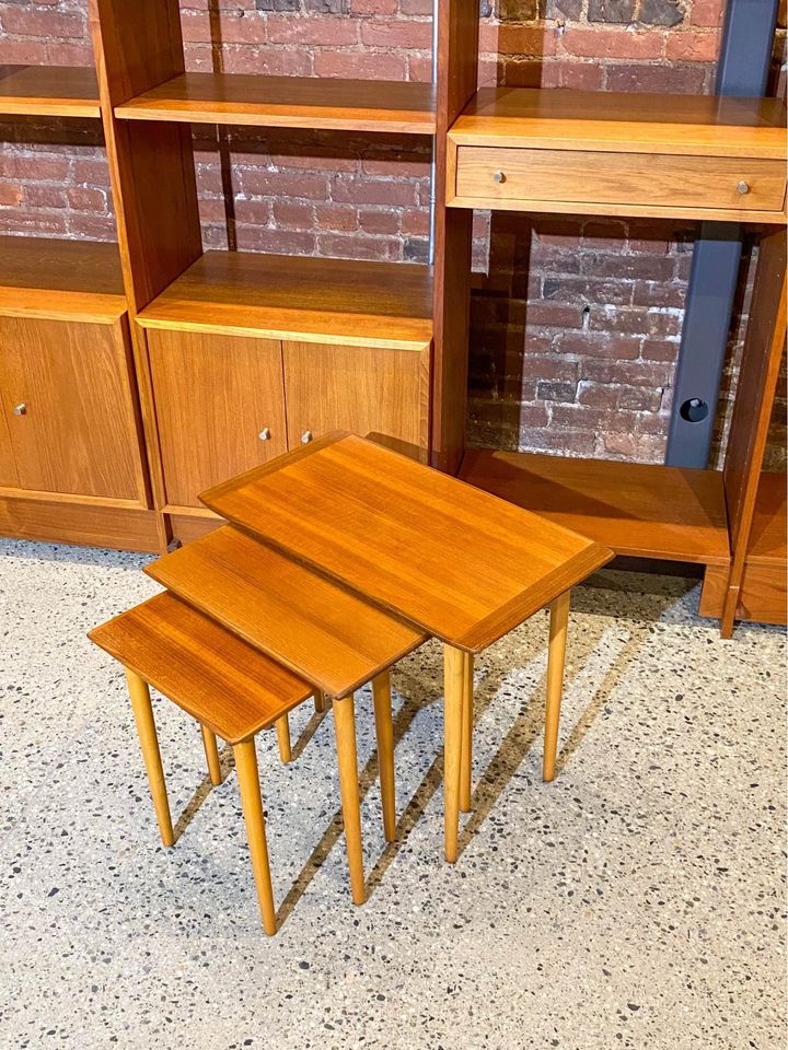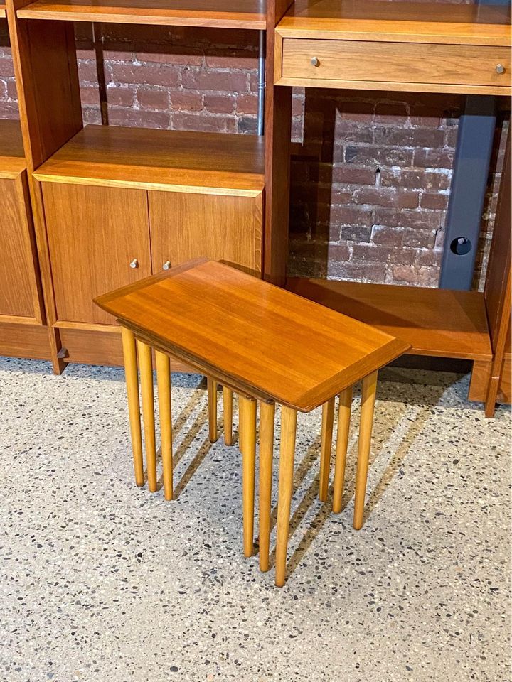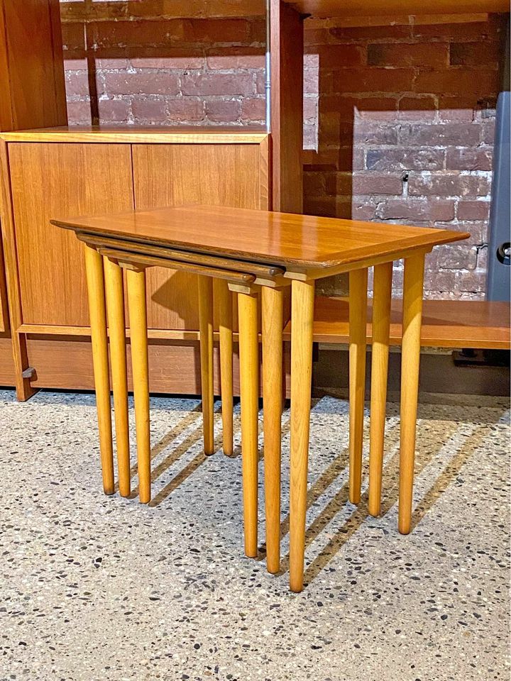 Beautiful and sleek set of three nesting tables circa 1960s. Excellent original condition with teak top and beech legs.