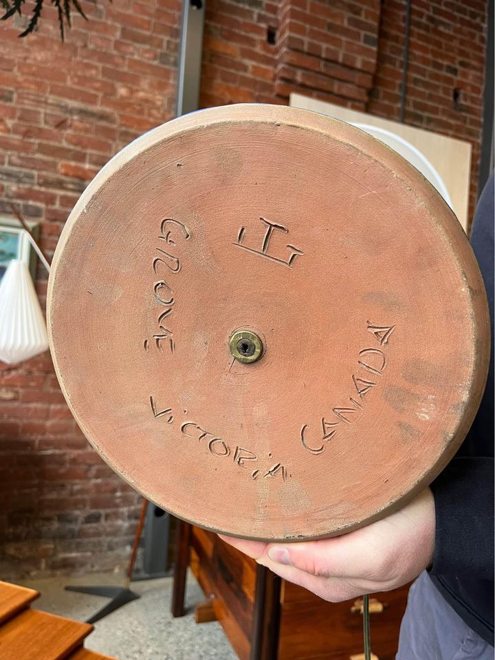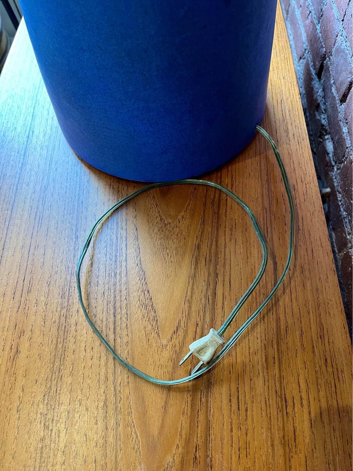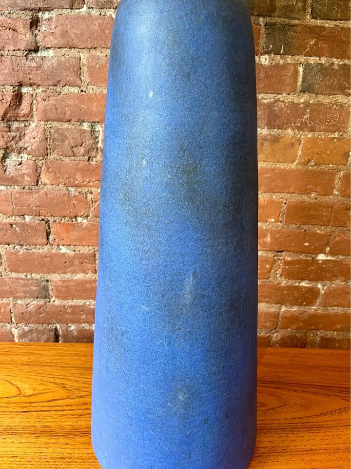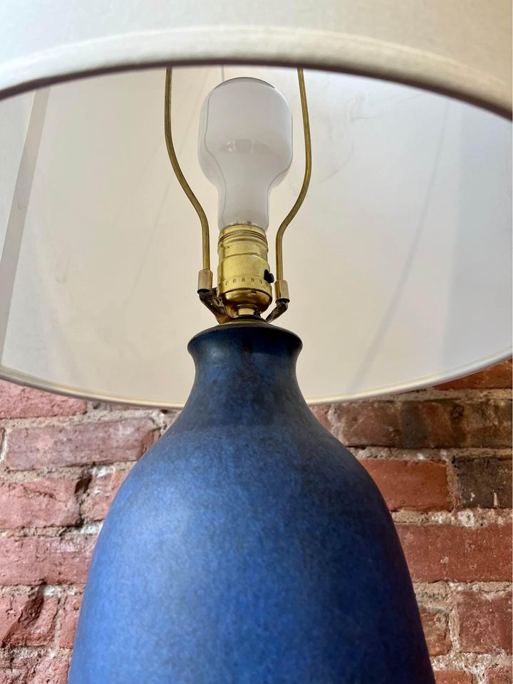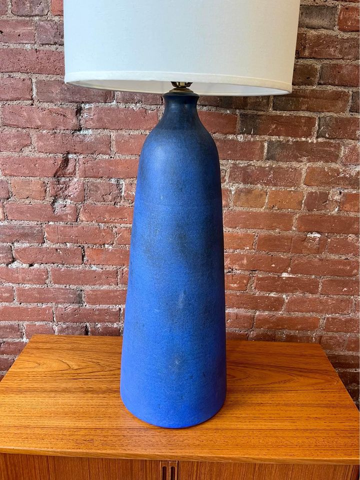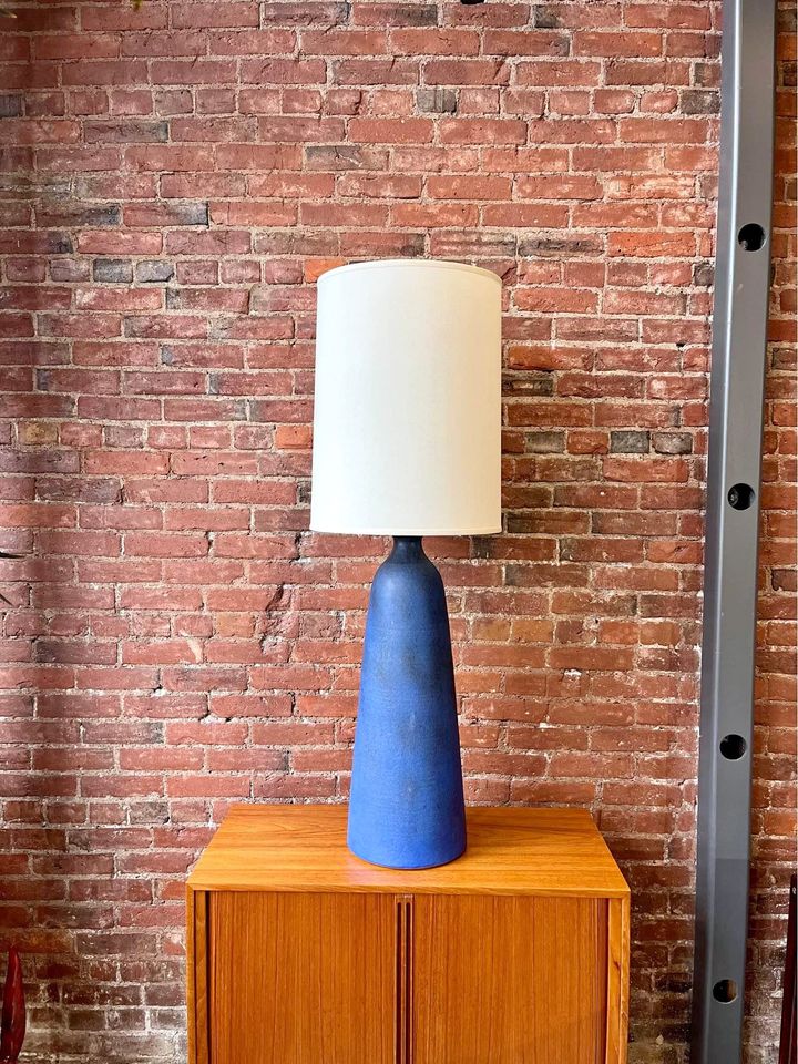 Introducing this 1960s table lamp by Jan and Helga Grove. A striking piece of Canadian craftsmanship, this lamp features a beautifully distressed cobalt blue base and adorned with a new shade to match the original. Jan and Helga Grove, renowned for their expertise in pottery and clay sculpting, have left an indelible mark on the Canadian art scene. For over forty years, their Grove Studio near Victoria has been a hub of creativity, producing modernist pottery celebrated for its classic forms, matte glazes, geometric motifs, and sgraffito decorations. Please check the dimensions beforehand, as this lamp commands attention with its generous size.
