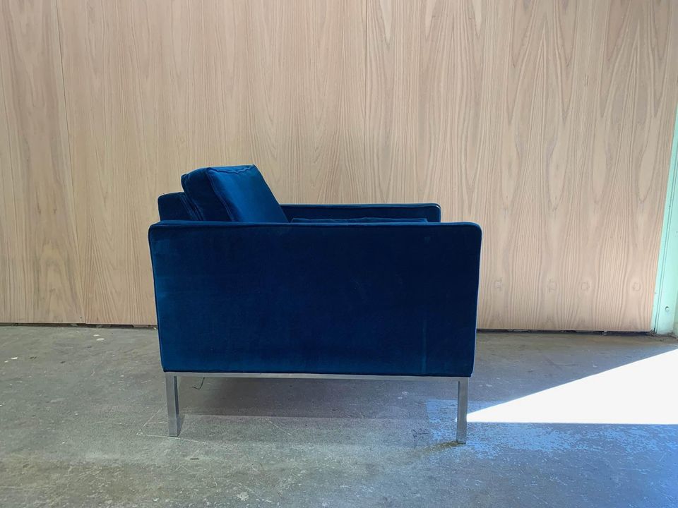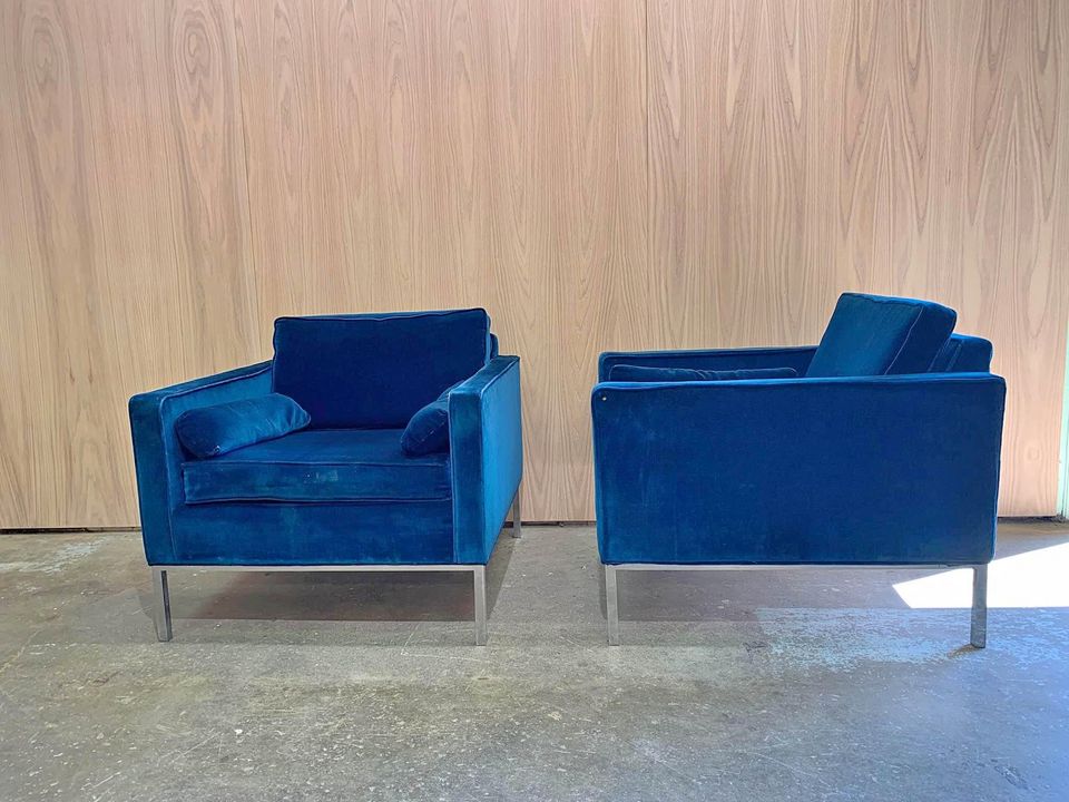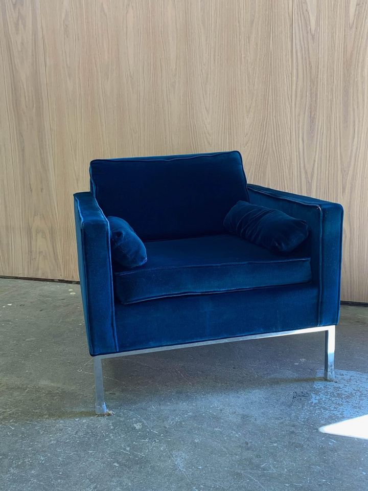 We are excited to announce the latest addition to our inventory: a vintage pair of velvet easy chairs with sleek steel bases circa 1968. These beautiful chairs are reminiscent of designs by Florence Knoll or Steelcase, but we are unable to substantiate at this time. We do know however, they were purchased in 1968, they’re upholstered in blue velvet, and they’re super cool.