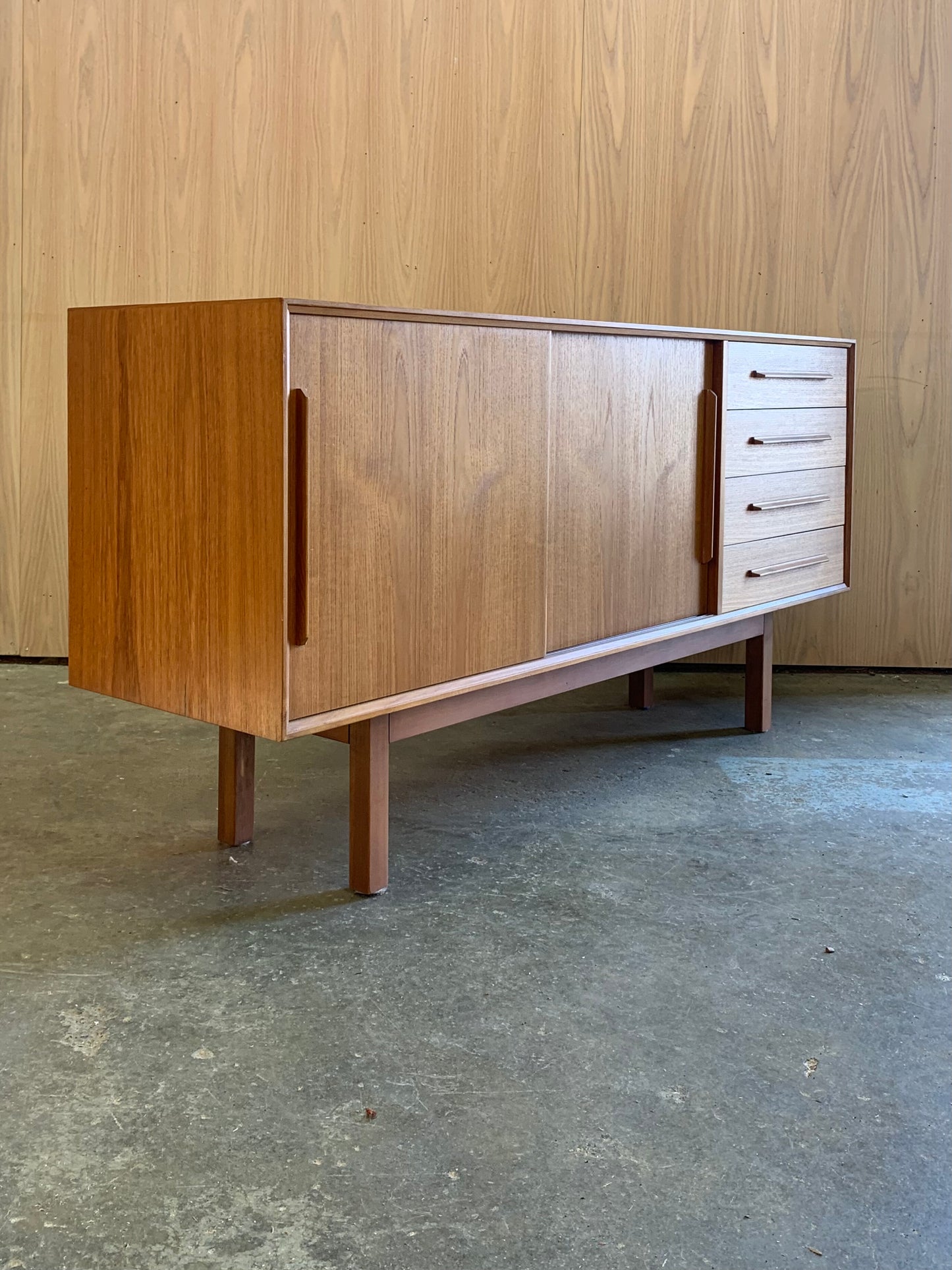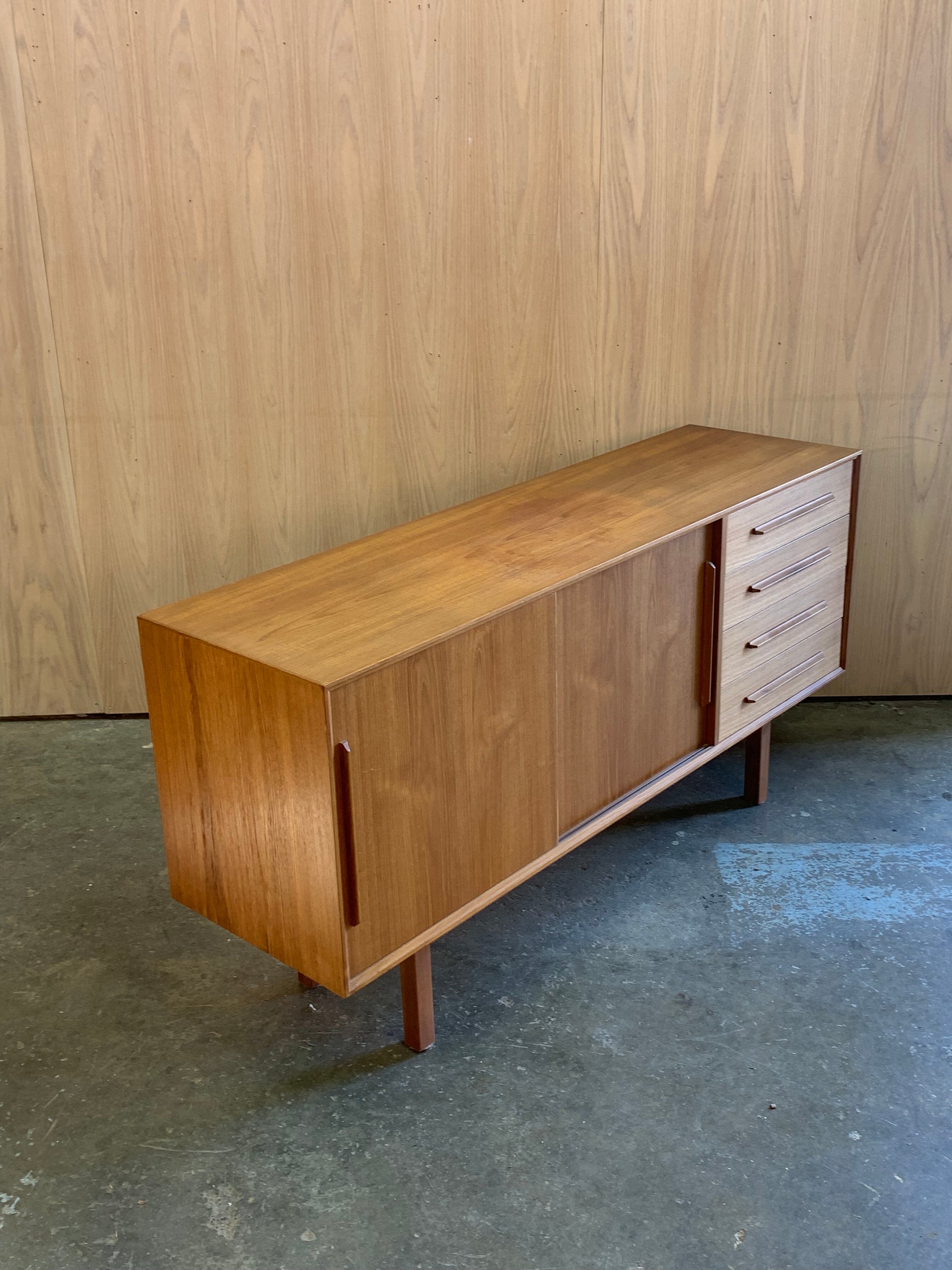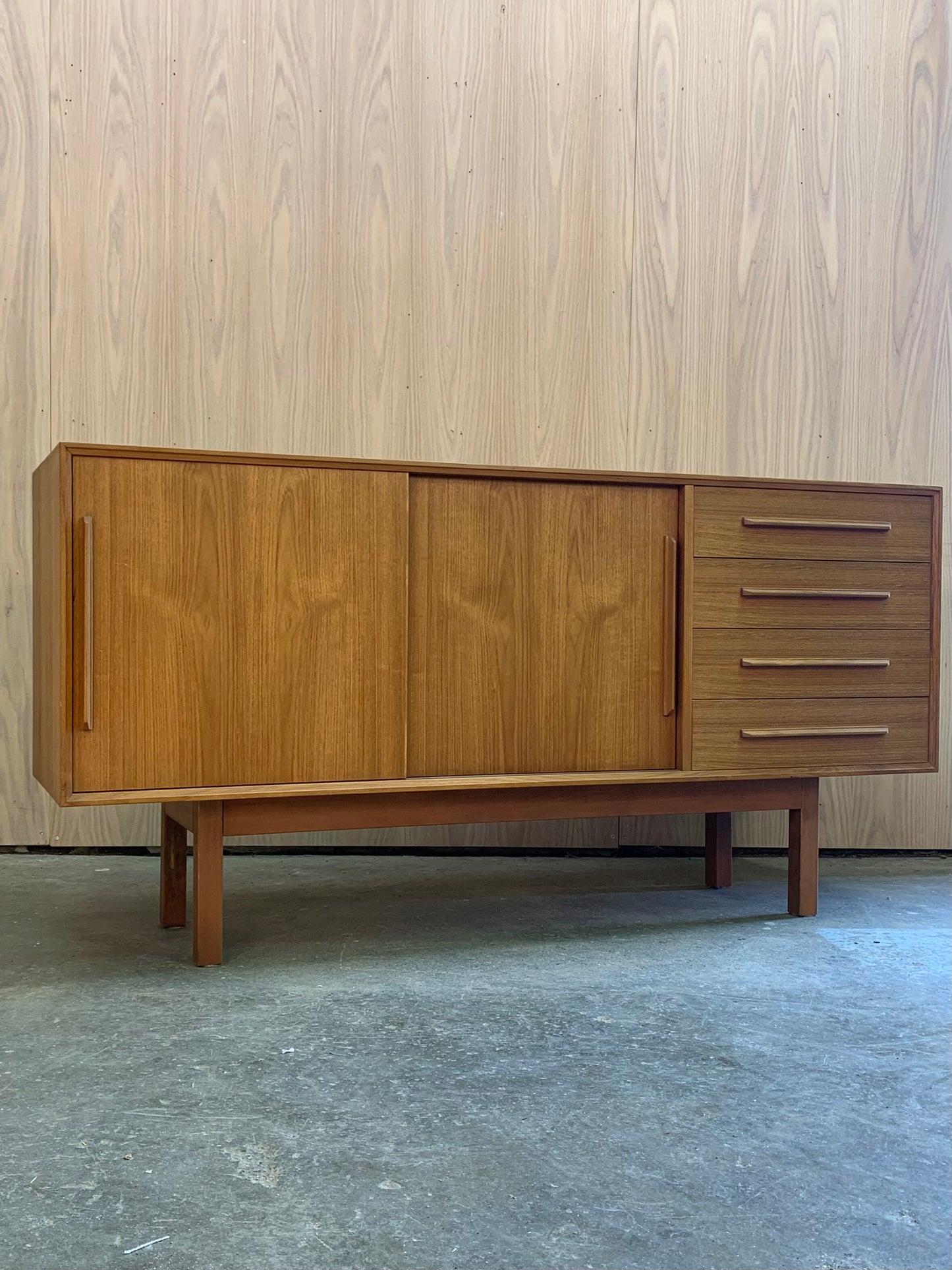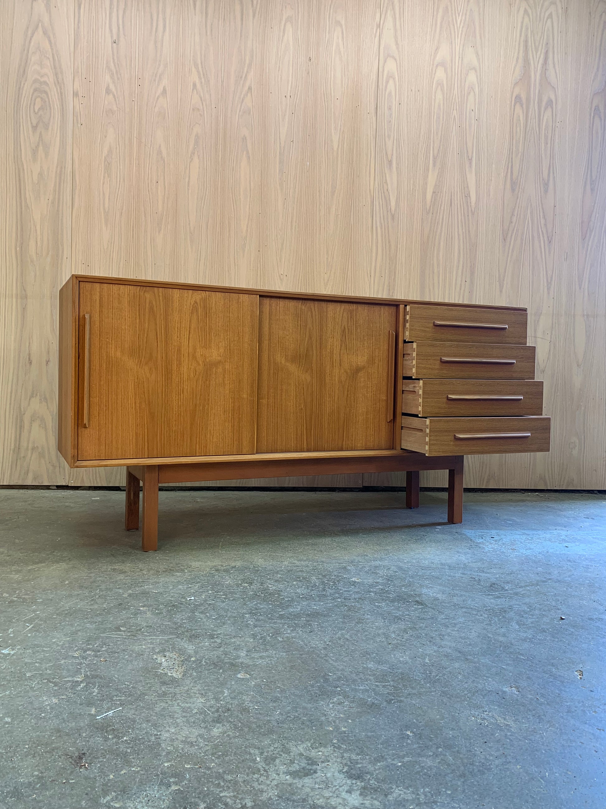 A clean-lined and beautifully proportioned 1960s Danish teak credenza featuring solid wood dovetail joinery on the drawer fronts and sculpted recessed pulls. The sliding doors reveal adjustable shelving, offering flexible storage alongside four smoothly gliding drawers. Warm teak grain throughout and solid craftsmanship make this a timeless piece. In very good vintage condition with minor marks consistent with age and use.