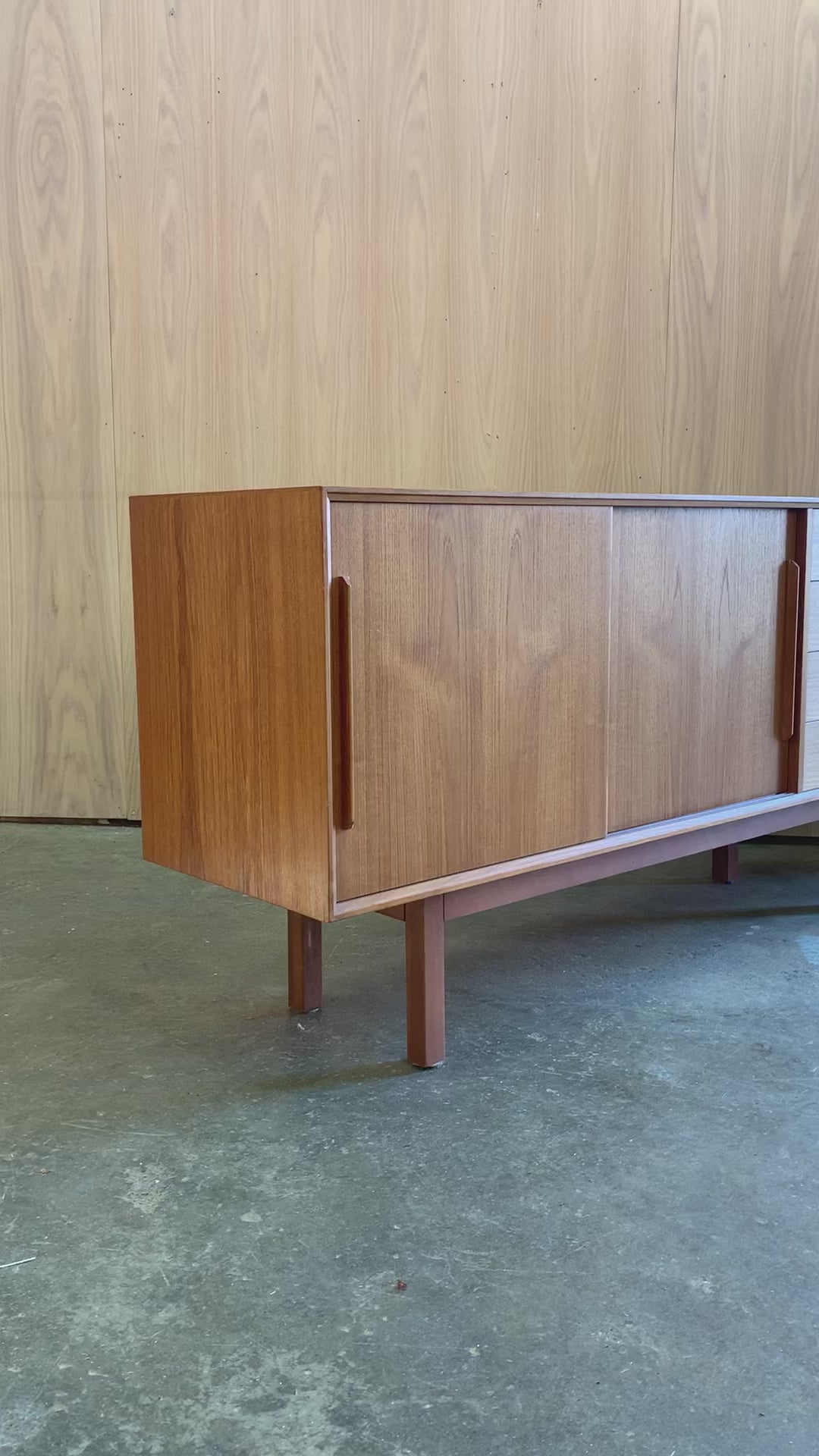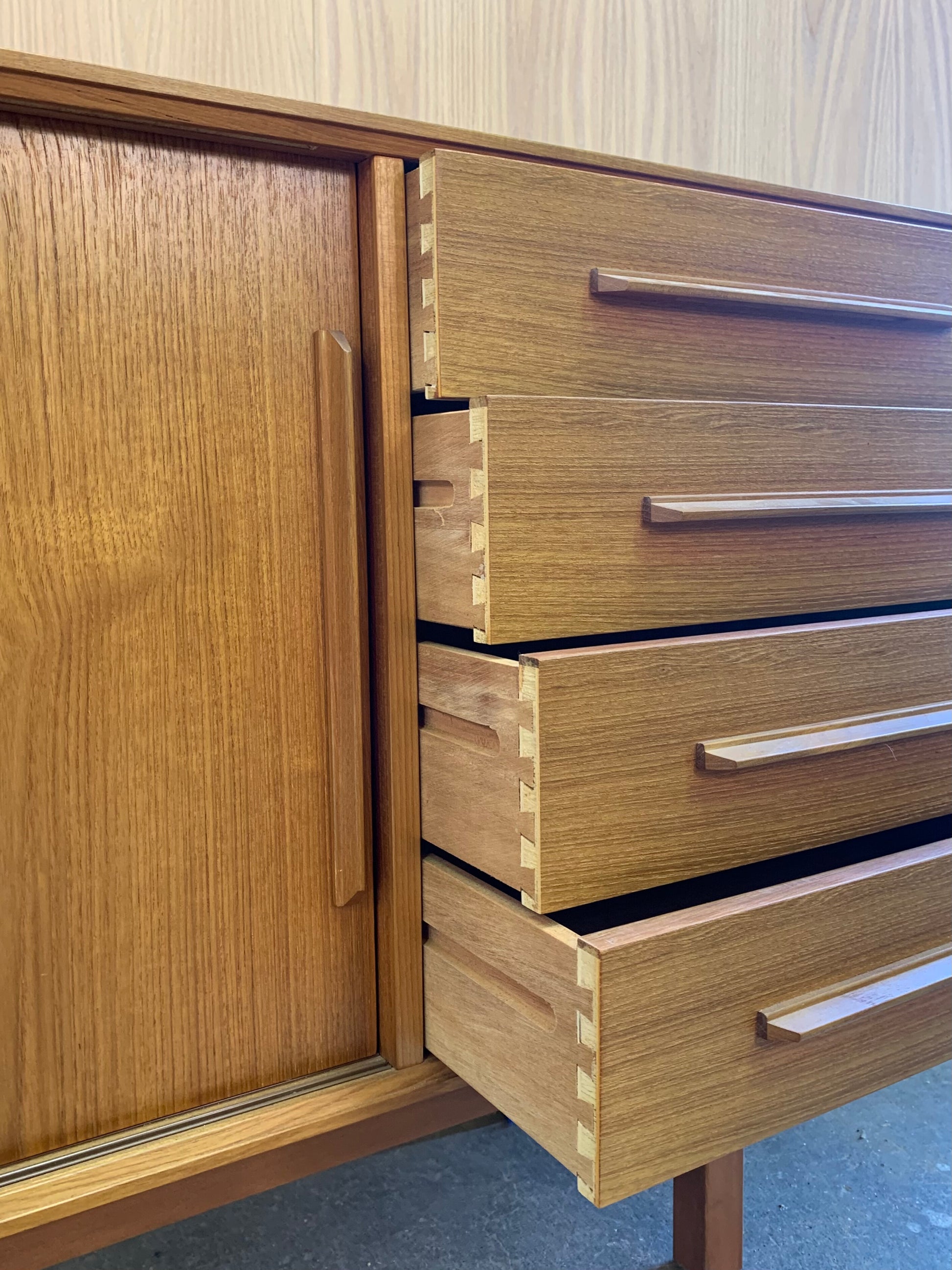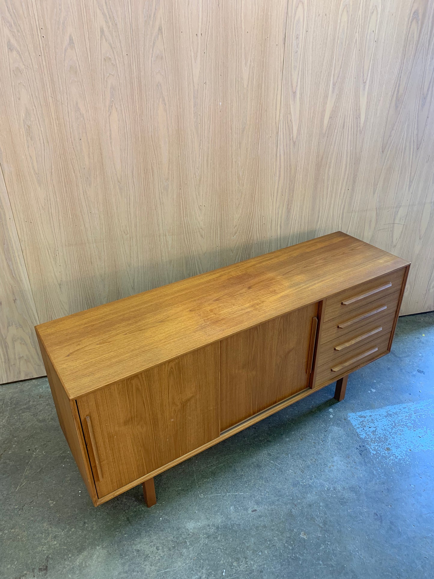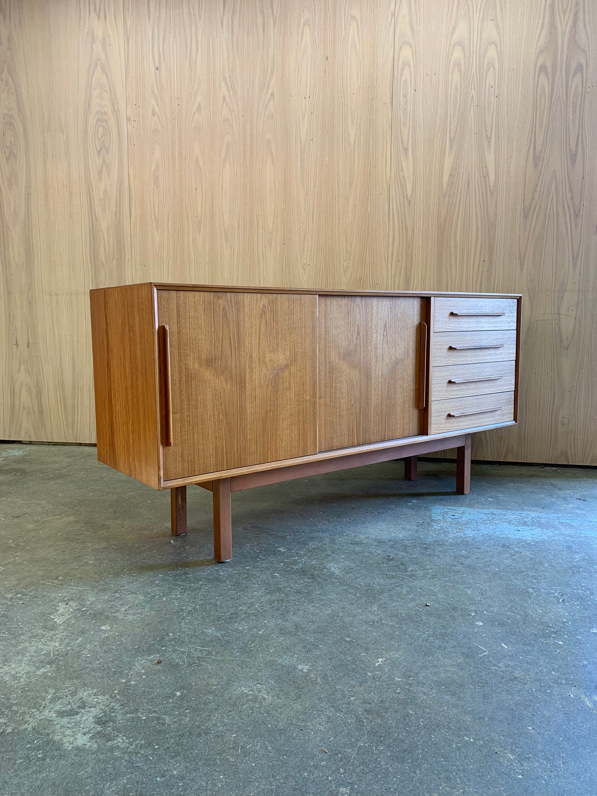 A clean-lined and beautifully proportioned 1960s Danish teak credenza featuring solid wood dovetail joinery on the drawer fronts and sculpted recessed pulls. The sliding doors reveal adjustable shelving, offering flexible storage alongside four smoothly gliding drawers. Warm teak grain throughout and solid craftsmanship make this a timeless piece. In very good vintage condition with minor marks consistent with age and use.