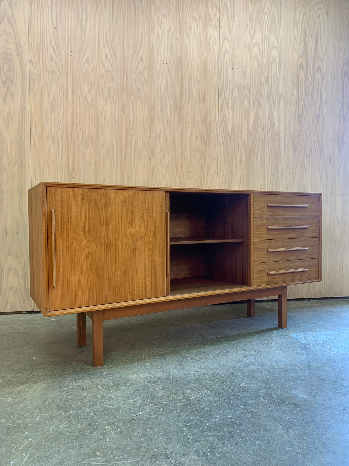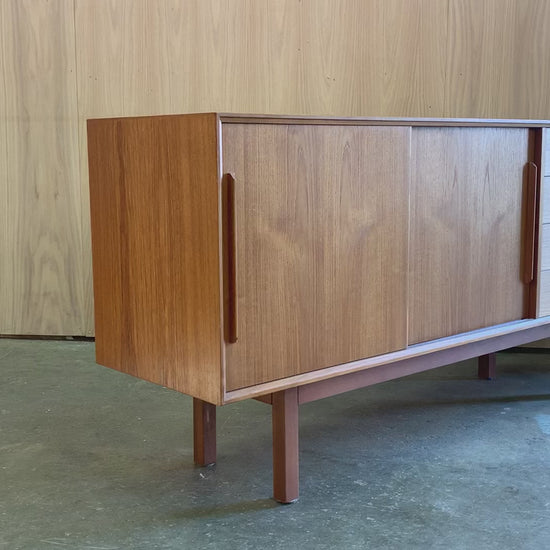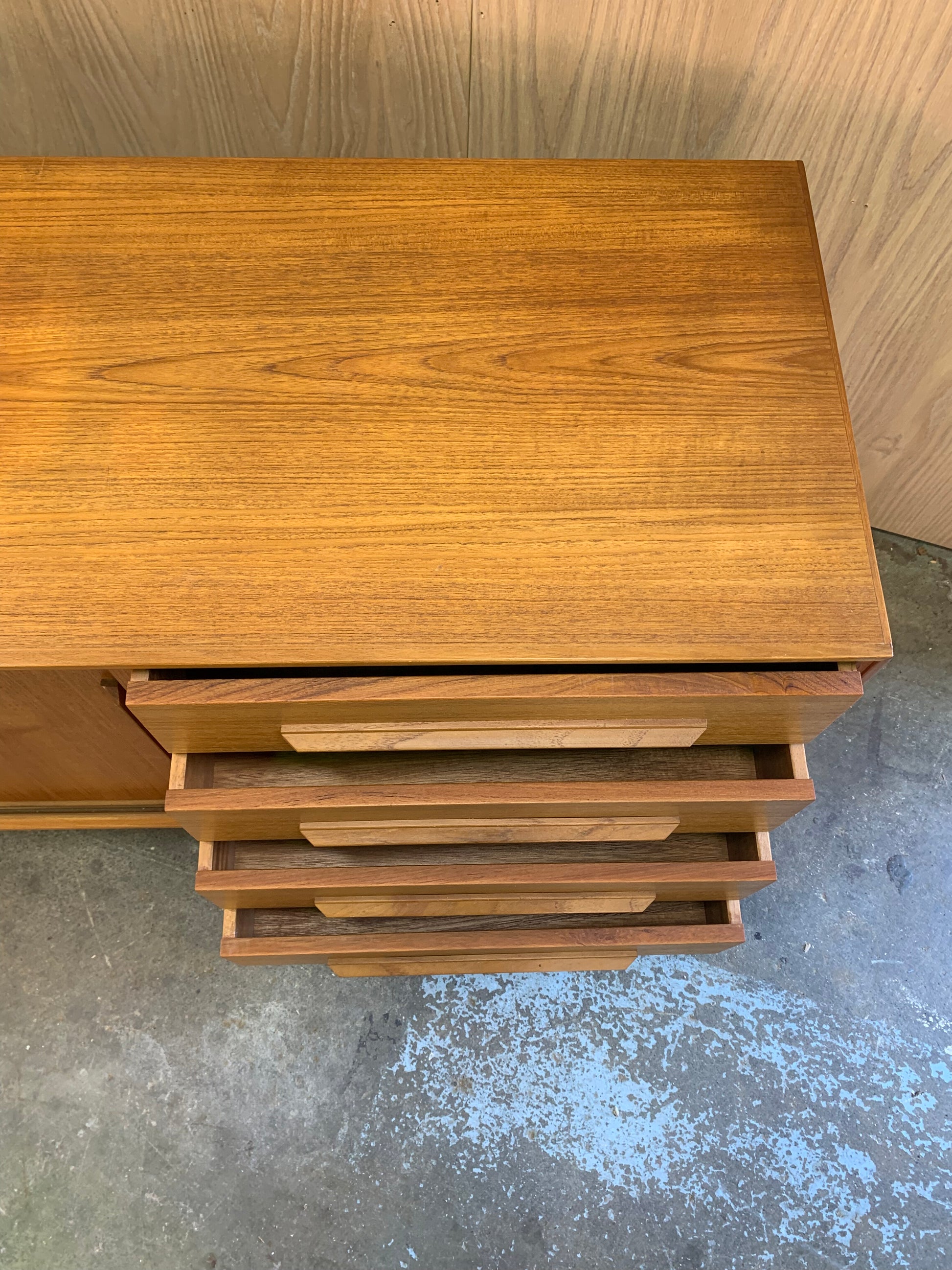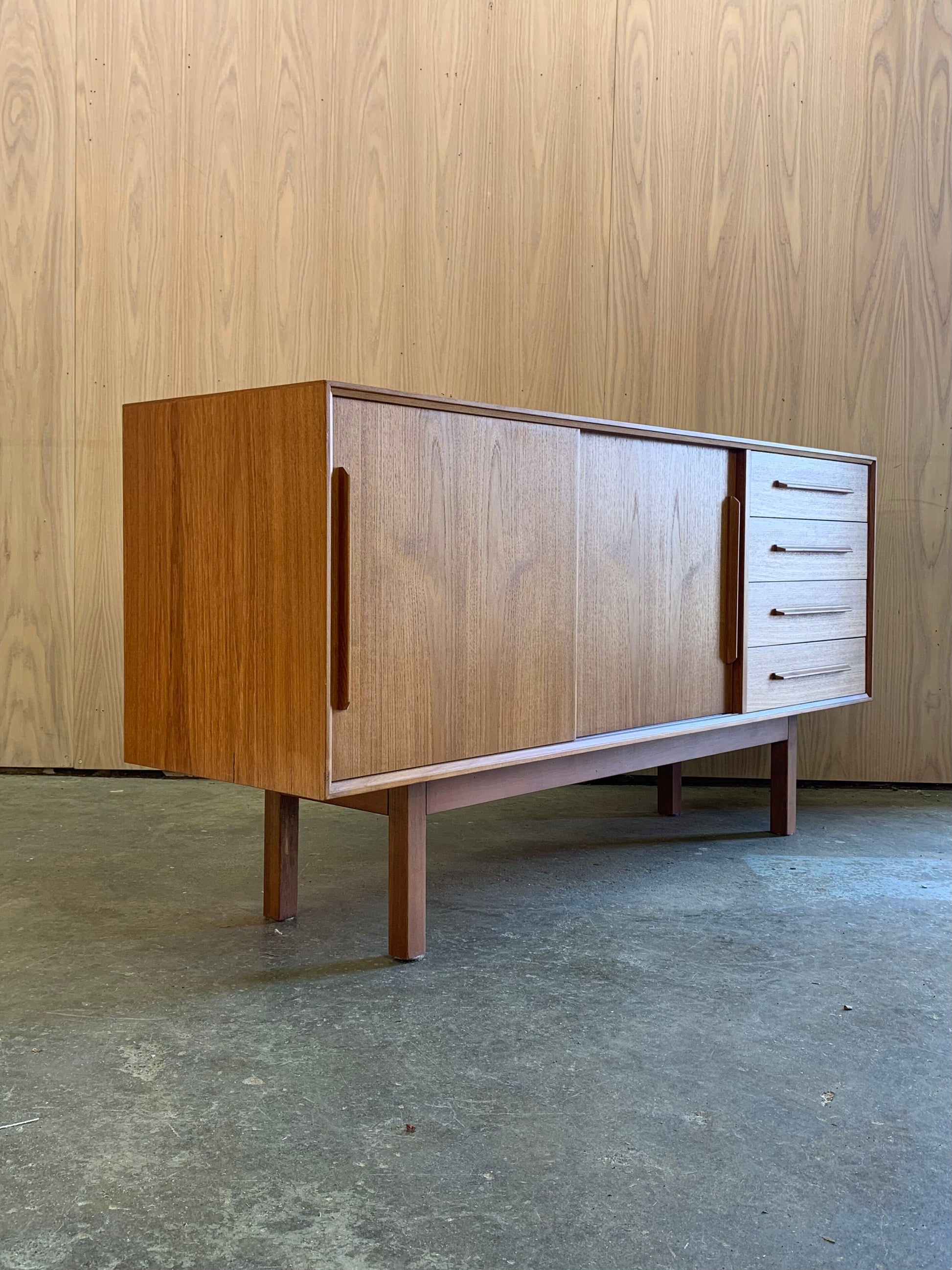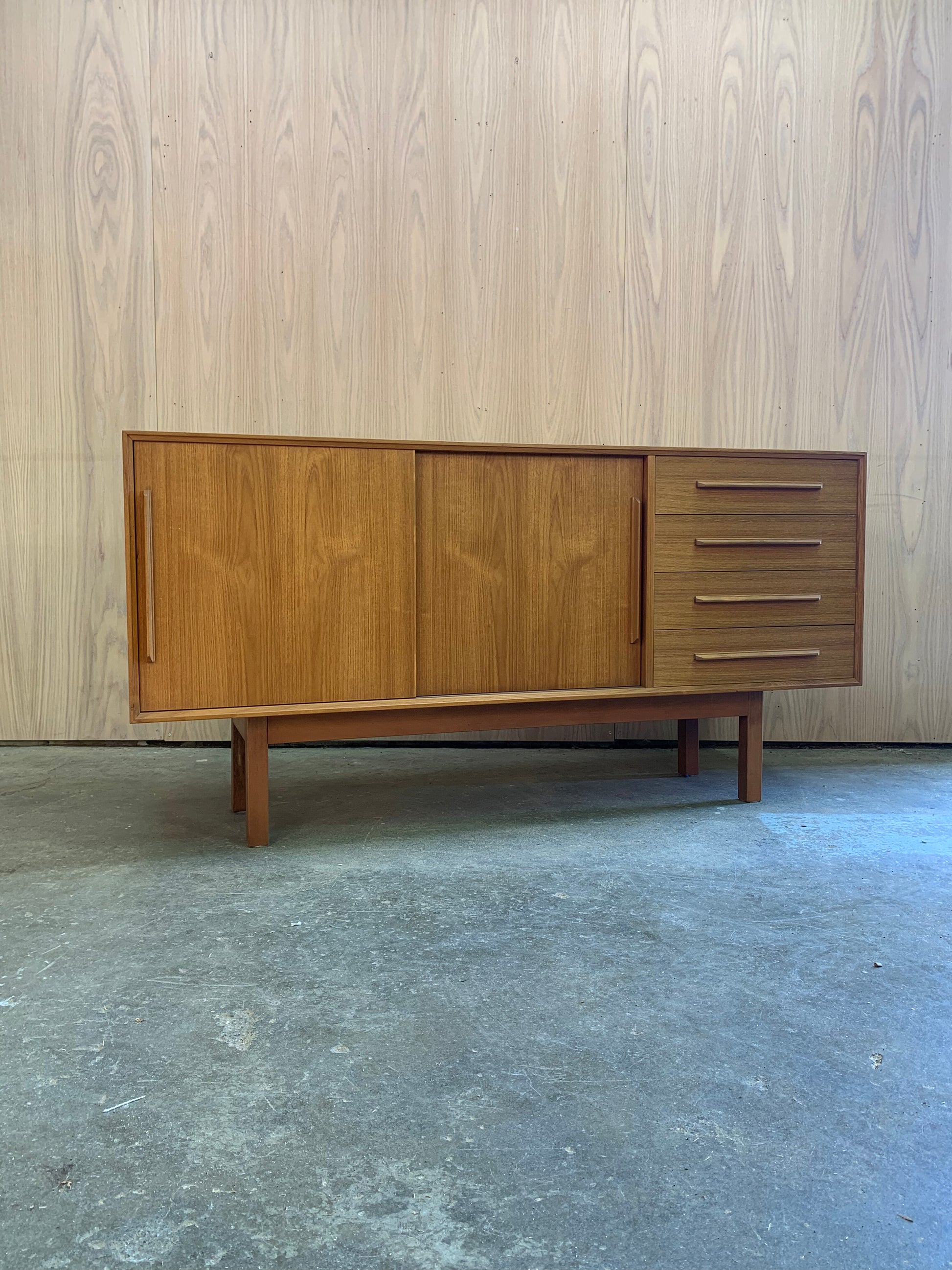 A clean-lined and beautifully proportioned 1960s Danish teak credenza featuring solid wood dovetail joinery on the drawer fronts and sculpted recessed pulls. The sliding doors reveal adjustable shelving, offering flexible storage alongside four smoothly gliding drawers. Warm teak grain throughout and solid craftsmanship make this a timeless piece. In very good vintage condition with minor marks consistent with age and use.