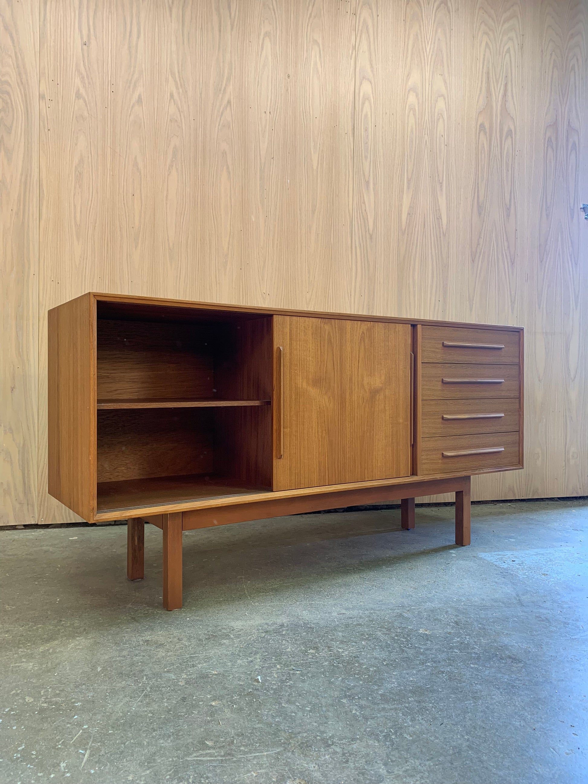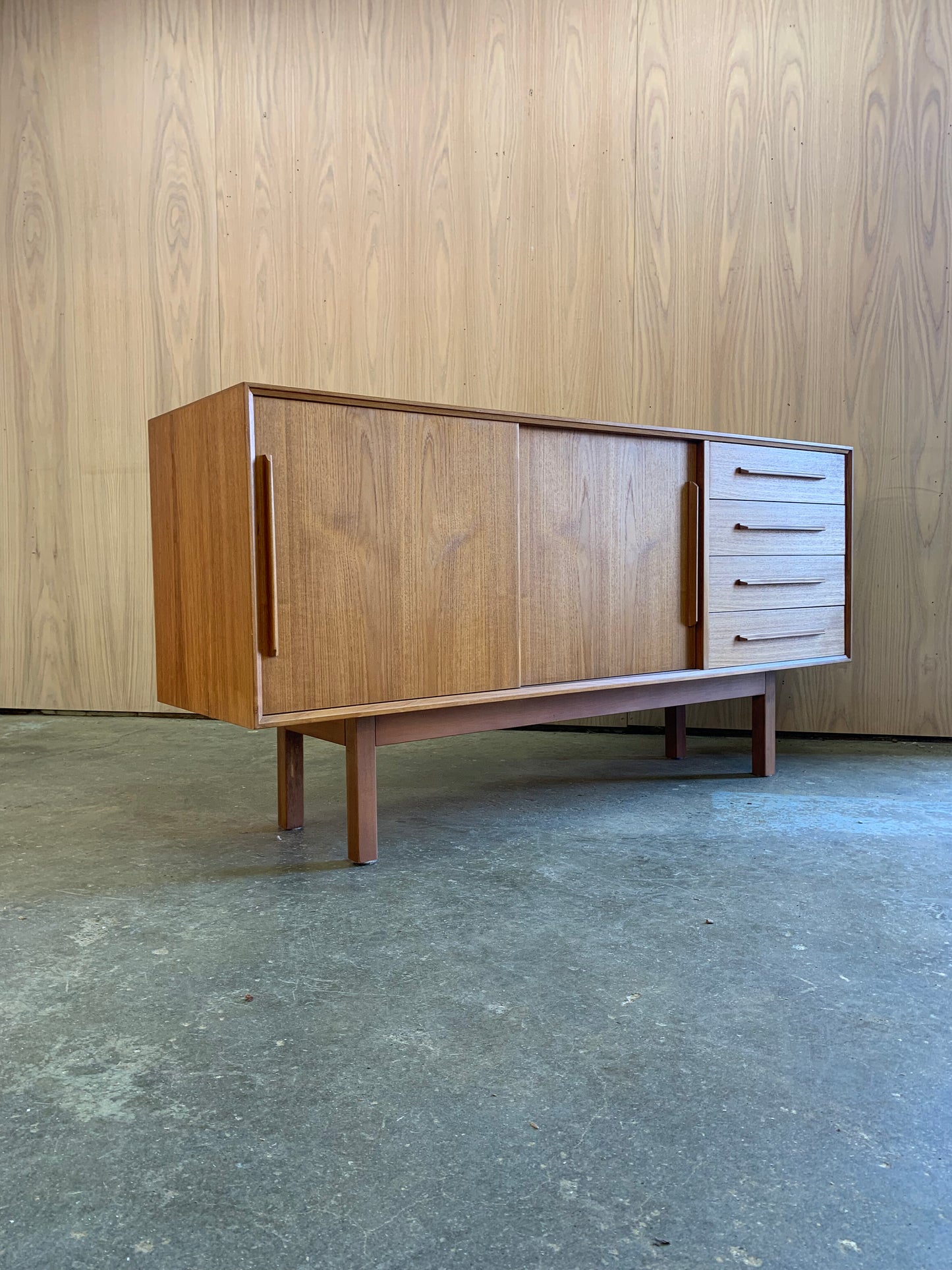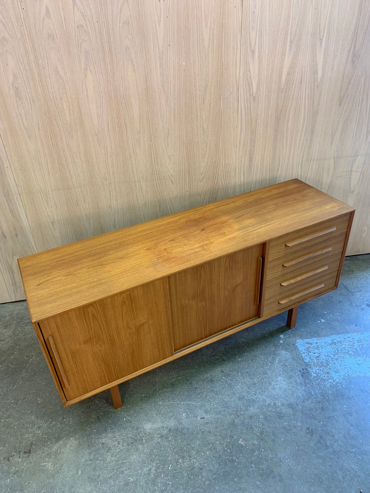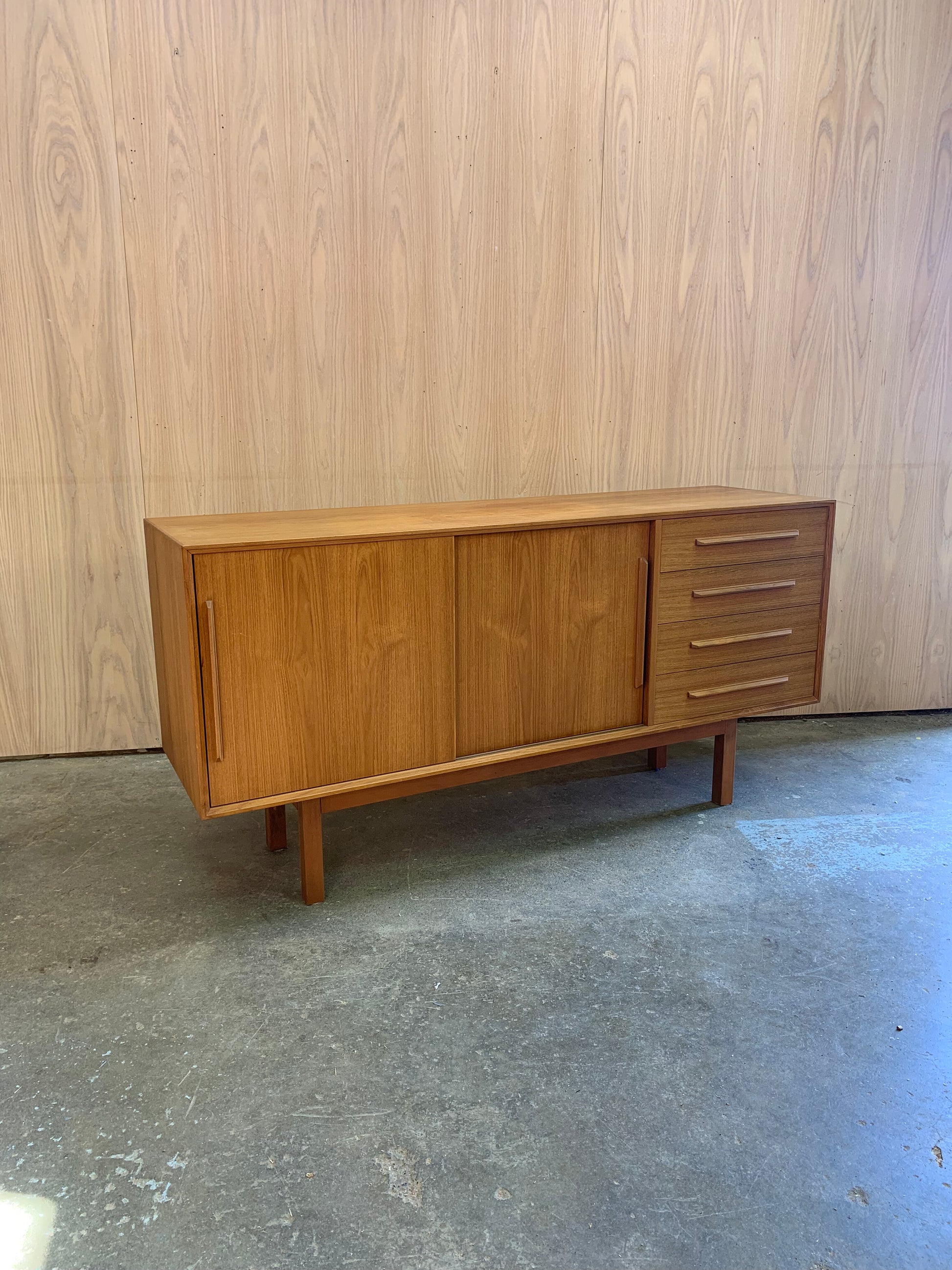 A clean-lined and beautifully proportioned 1960s Danish teak credenza featuring solid wood dovetail joinery on the drawer fronts and sculpted recessed pulls. The sliding doors reveal adjustable shelving, offering flexible storage alongside four smoothly gliding drawers. Warm teak grain throughout and solid craftsmanship make this a timeless piece. In very good vintage condition with minor marks consistent with age and use.