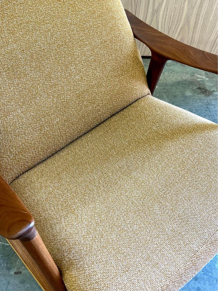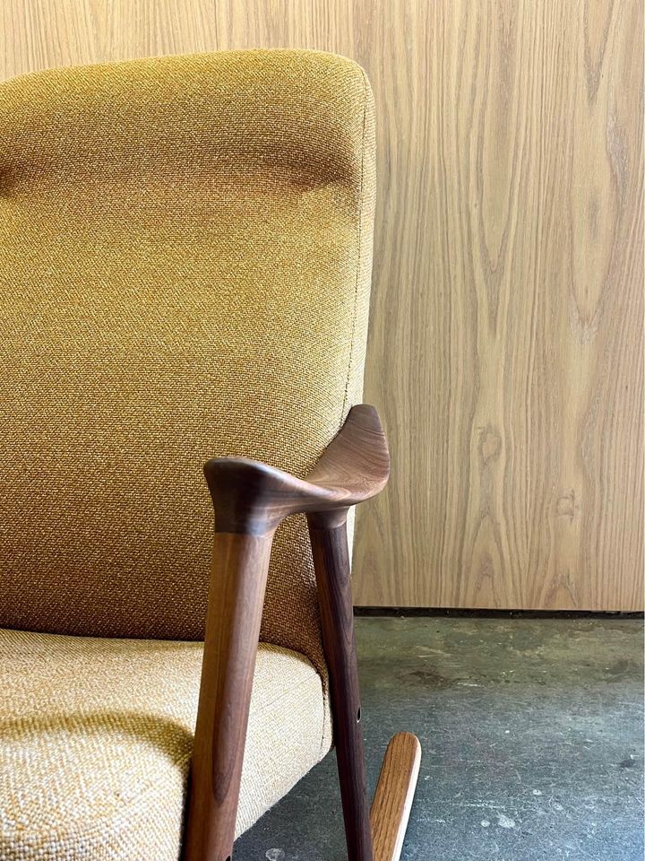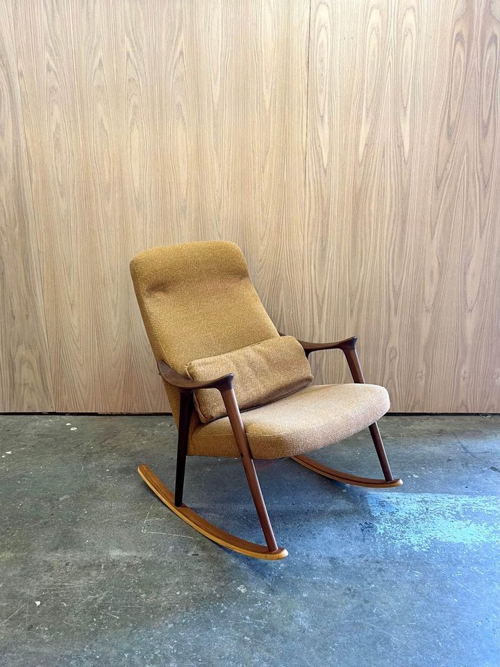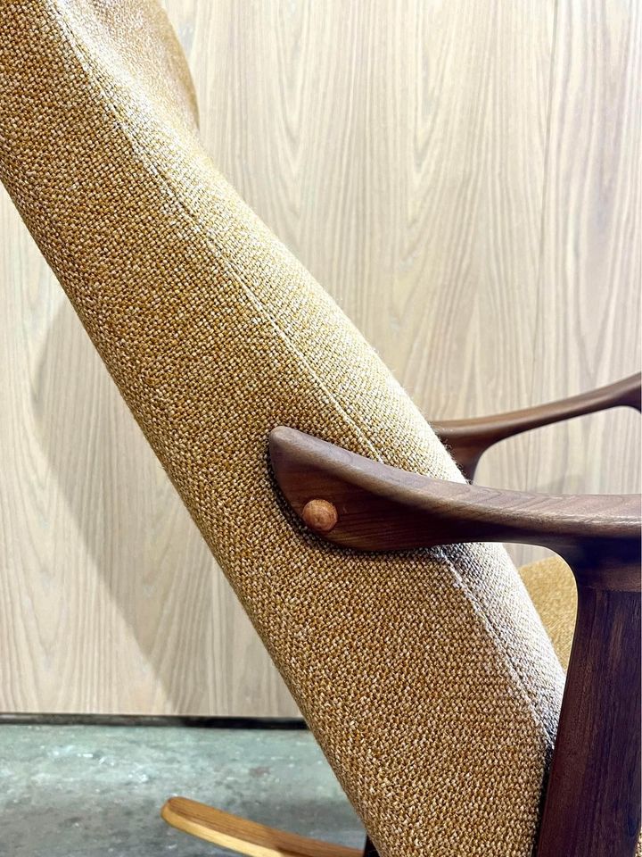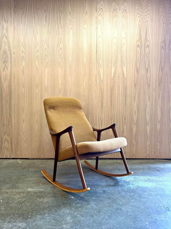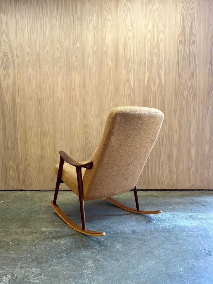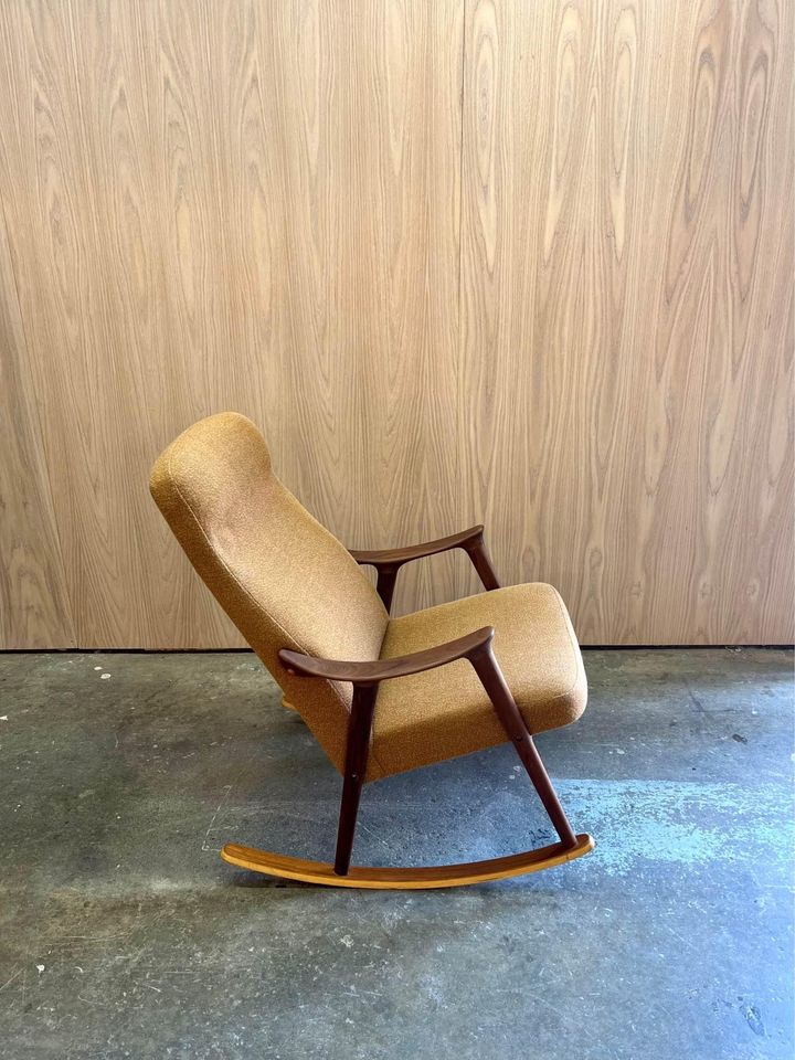 We are excited to offer this 1970’s Afrormosia and Teak Norwegian Rocking Chair. Boasting a beautifully sculpted frame, its upholstered in a muted mustard fabric which is sure to add warmth to any space.