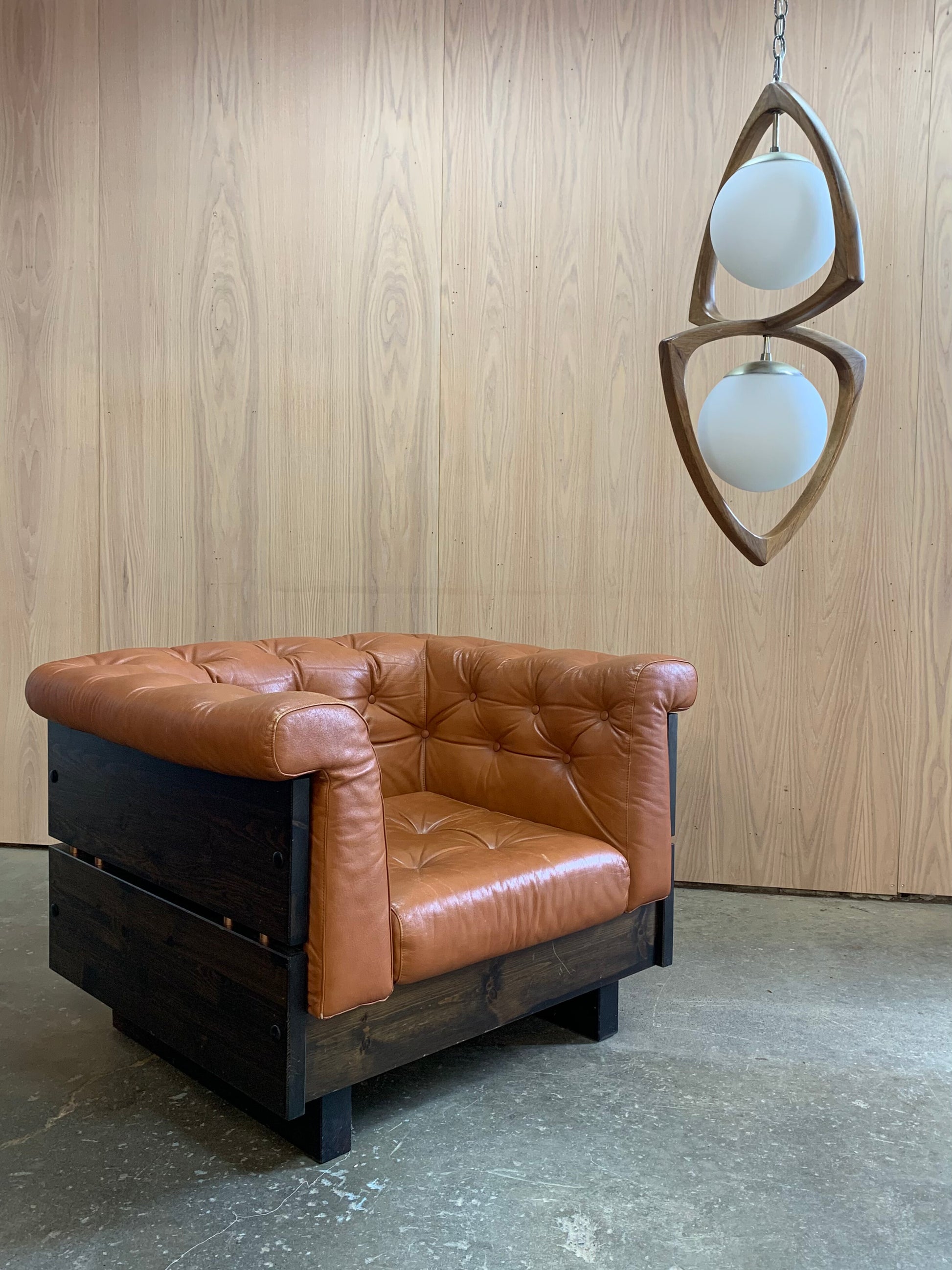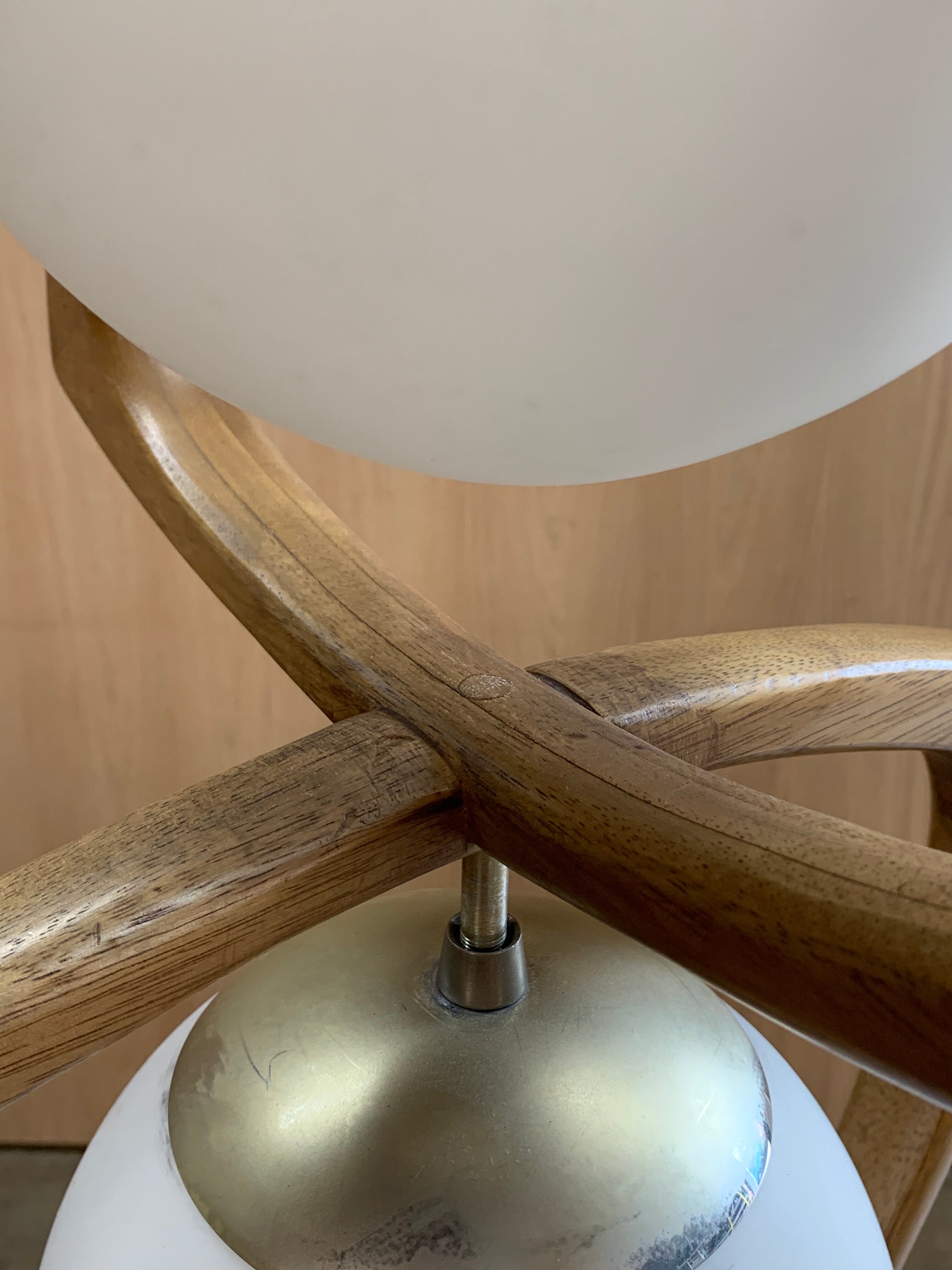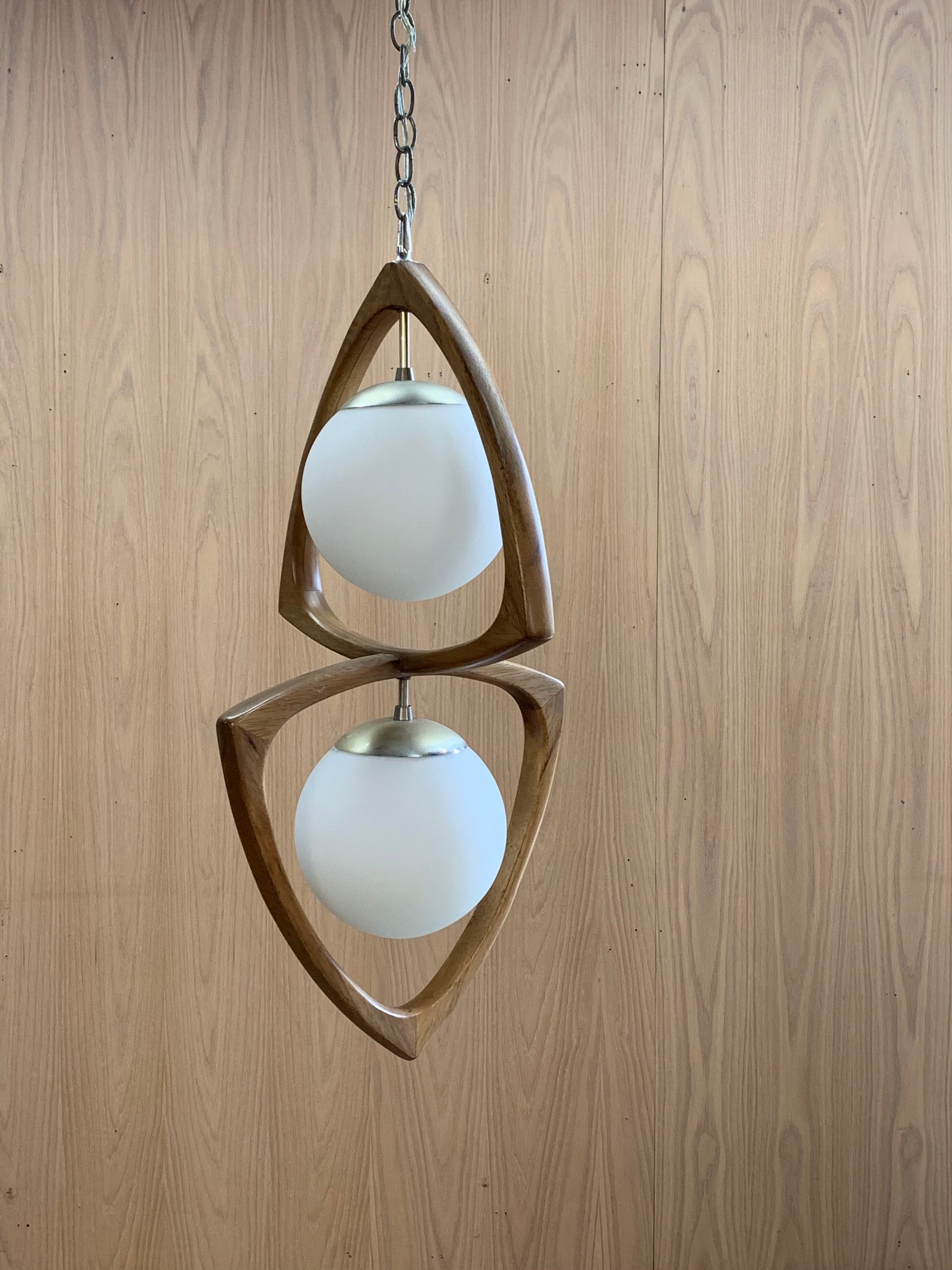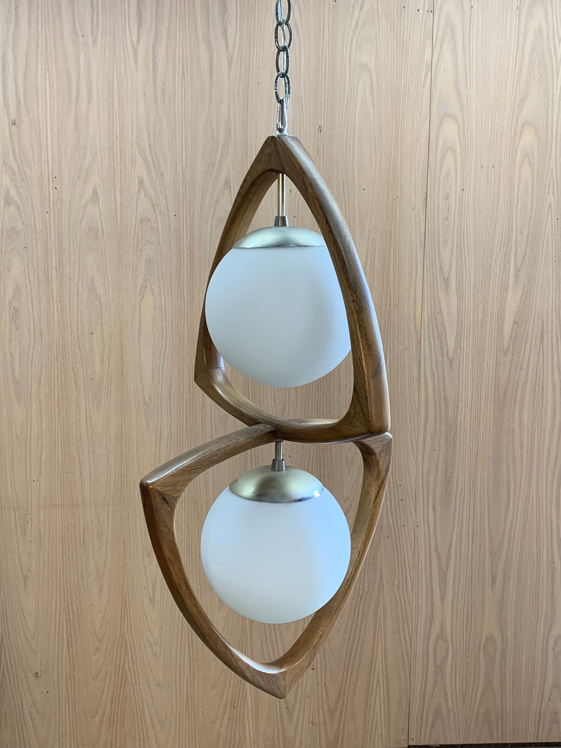 A striking piece of American mid-century lighting, this double pendant is a study in symmetry and sculptural form. Featuring two frosted glass globes cradled in finely carved walnut frames, its intersecting design evokes a suspended sense of motion and balance. The rich grain of the wood contrasts beautifully with the soft matte glow of the globes, while the brushed metal caps add a subtle industrial touch. A rare and captivating light fixture that reads like art in any modern interior.