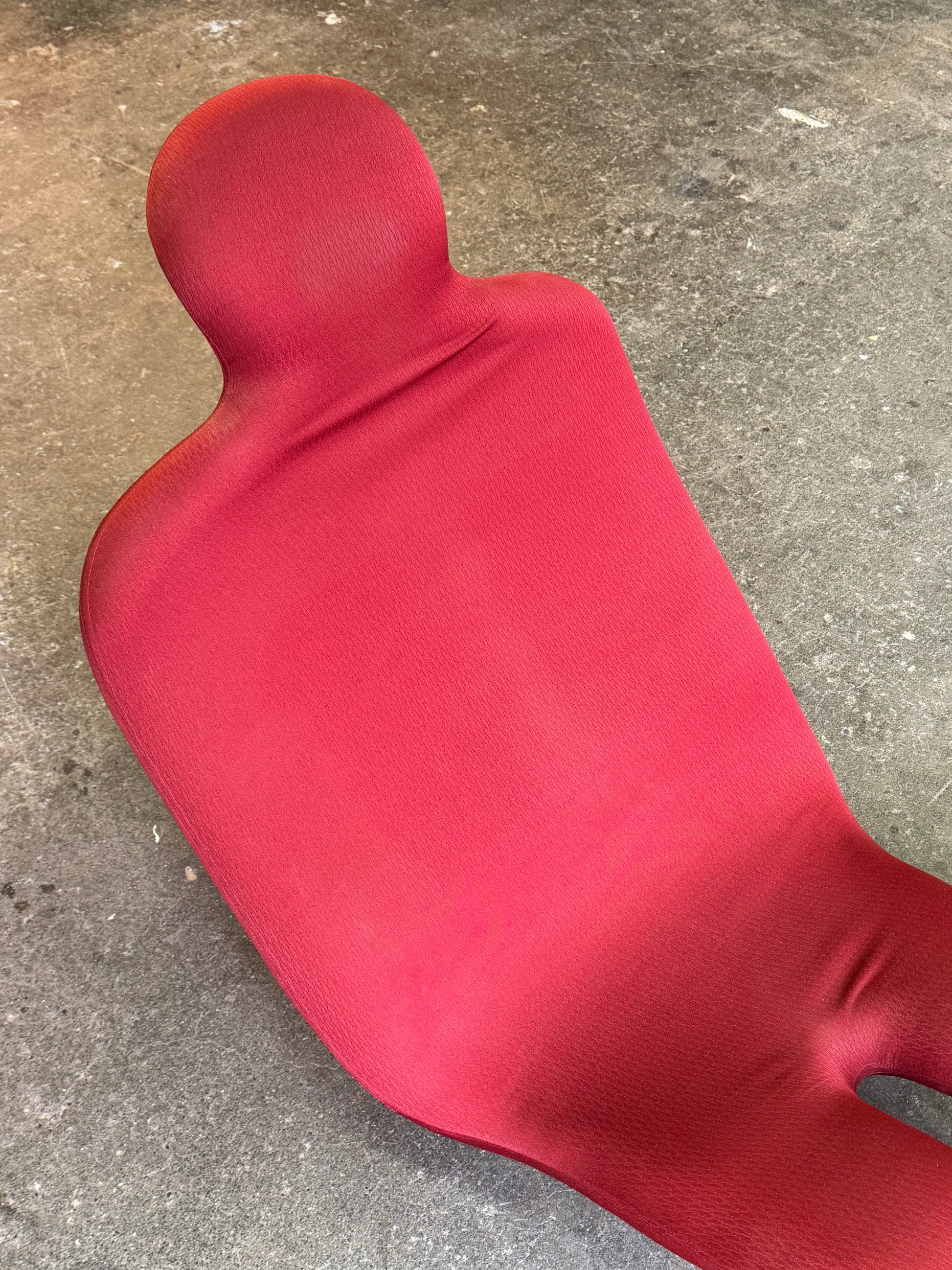 The structure is fully integrated, with the seat, back, and base forming one continuous surface. The proportions are low and informal, allowing the chair to sit close to the floor. The absence of exposed structure emphasizes the overall silhouette and the relationship between form and use.