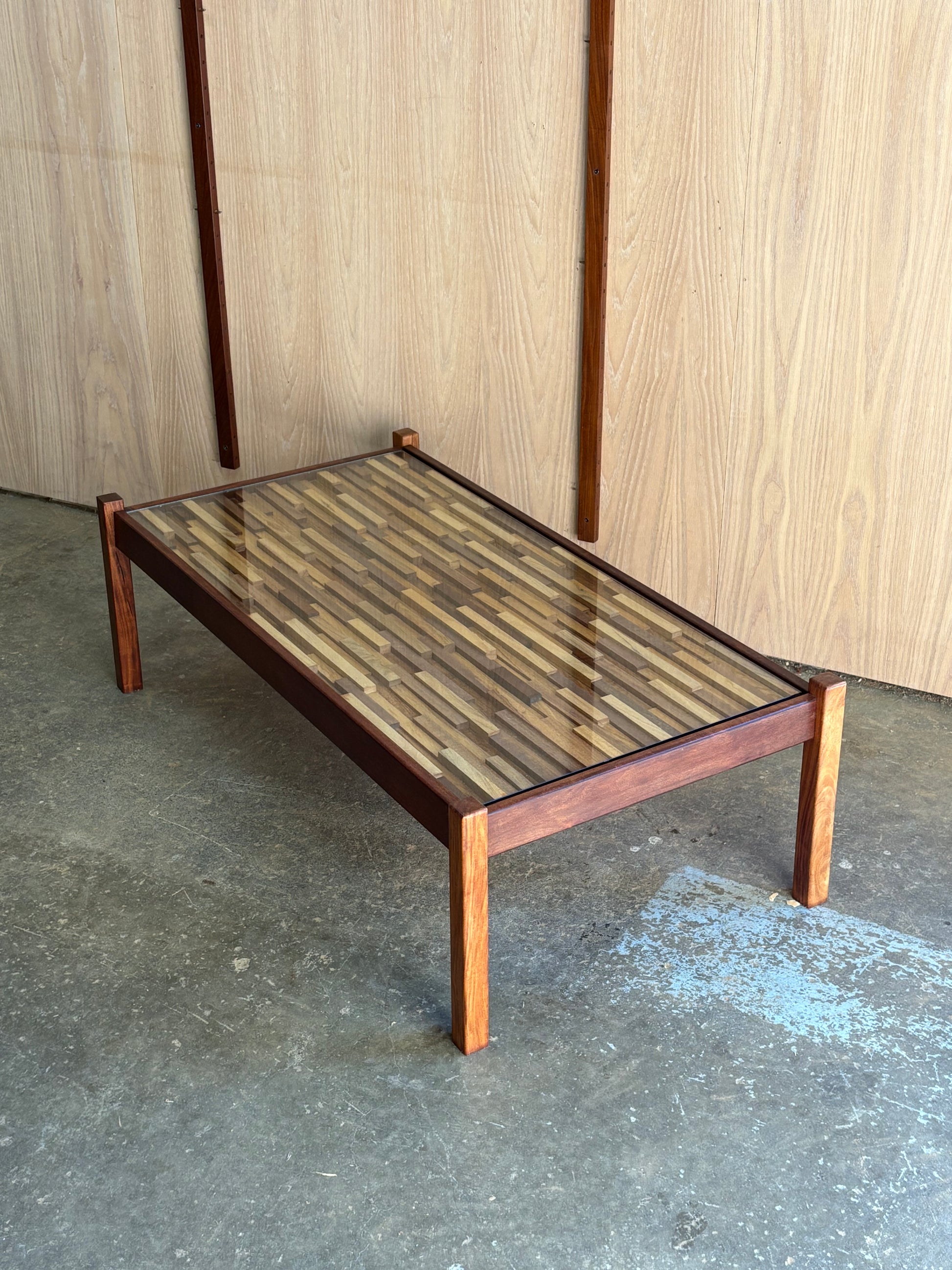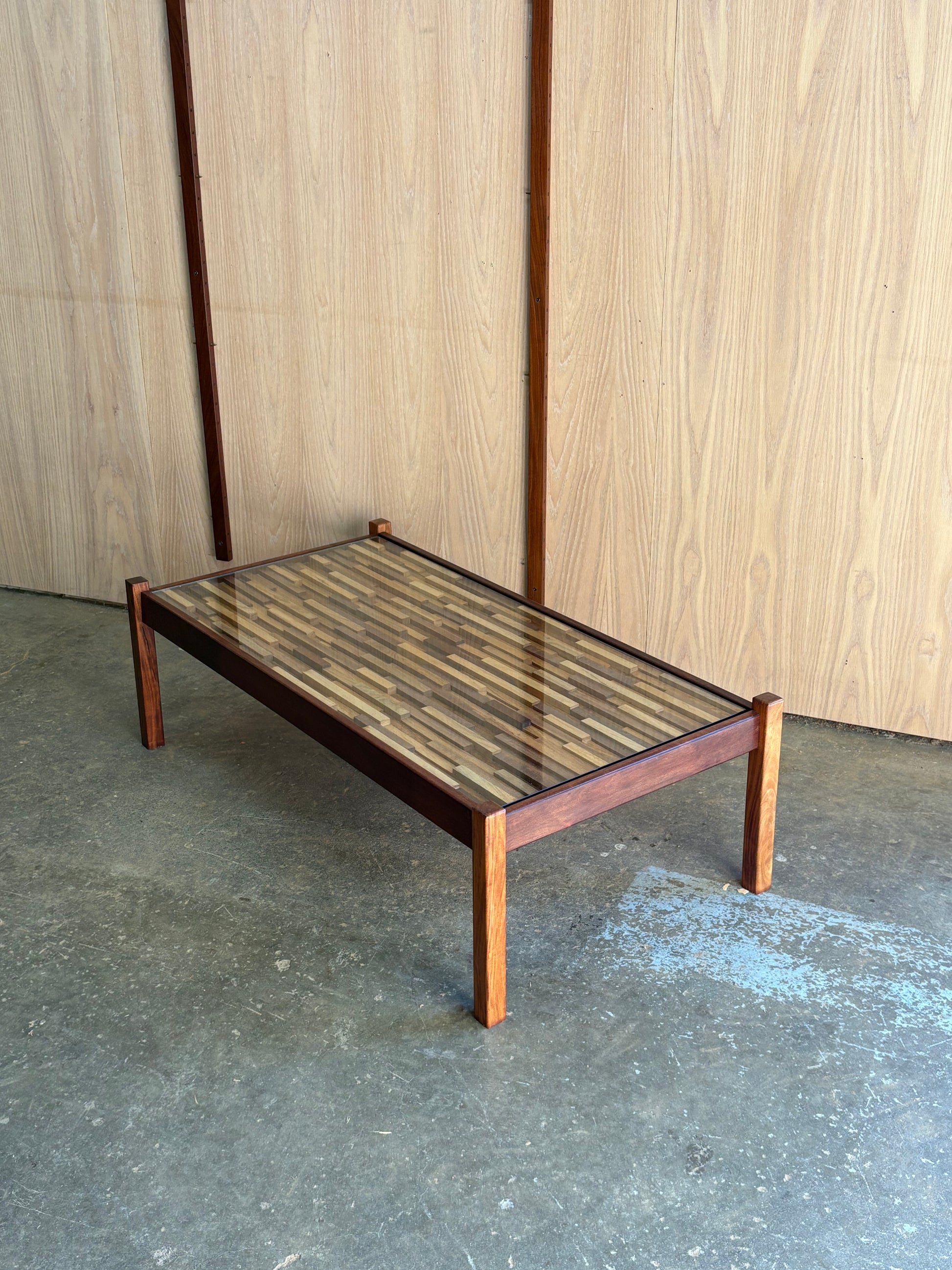 A striking 1970s Brazilian hardwood coffee table by the iconic Percival Lafer, featuring his unmistakable geometric mosaic top set beneath sleek glass for a touch of modern elegance. The rich tropical hardwood frame has been freshly cleaned and polished by our team, revealing its warm tones and beautiful grain. In excellent condition, it is ready to anchor your living space with style. Listing is for the coffee table only, but for those wanting the full Lafer experience, we also have the original matching side tables available.