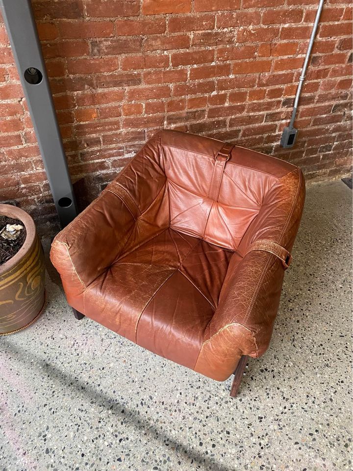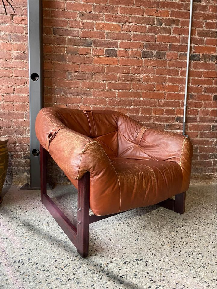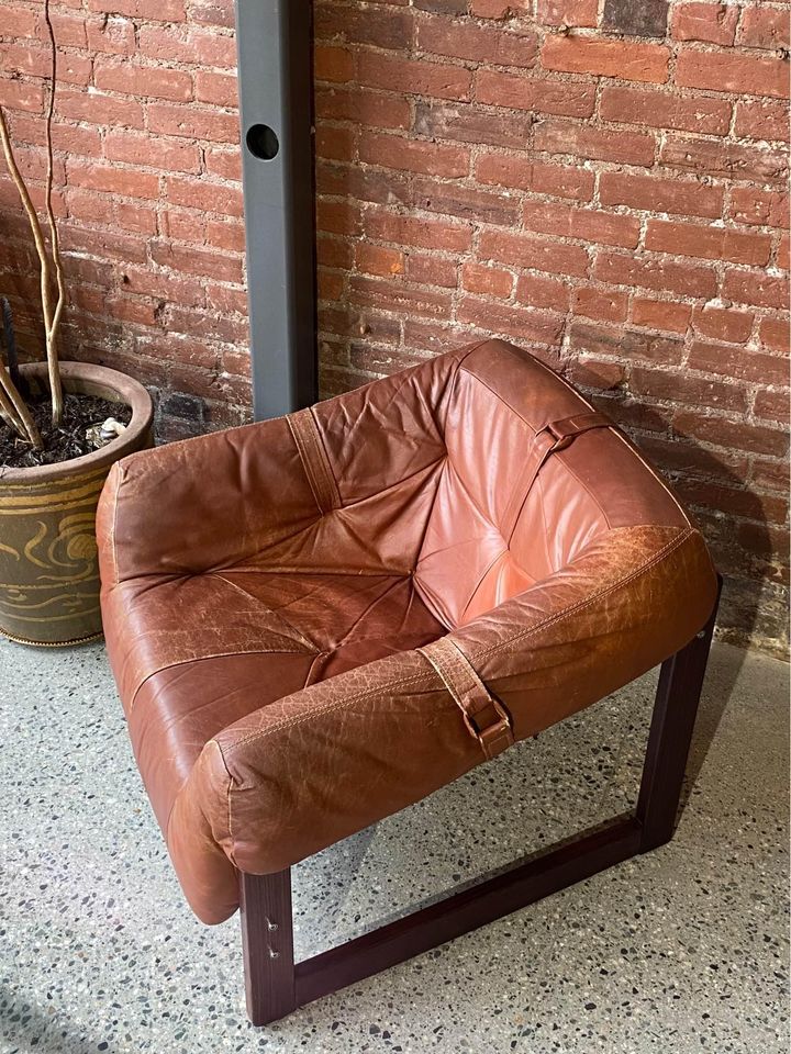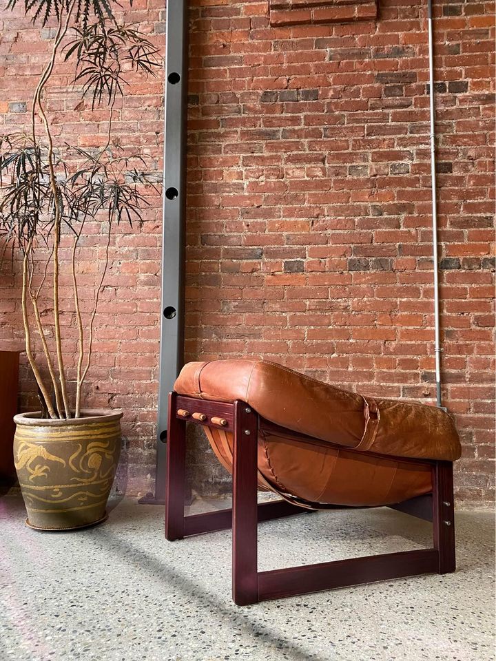 Beautifully aged Model “MP93” chair designed by Percival Lafer circa 1972. This design features a Brazilian hard wood frame, and a leather covered single block of injected polyurethane foam. The body is supported by new leather straps attached to the wood frame with wooden dowels. This original leather seat is freshly conditioned and cleaned; a process we do in house that takes about a week. It’s soft and comfortable and suitable for another generation of use. Love this piece. ♥️