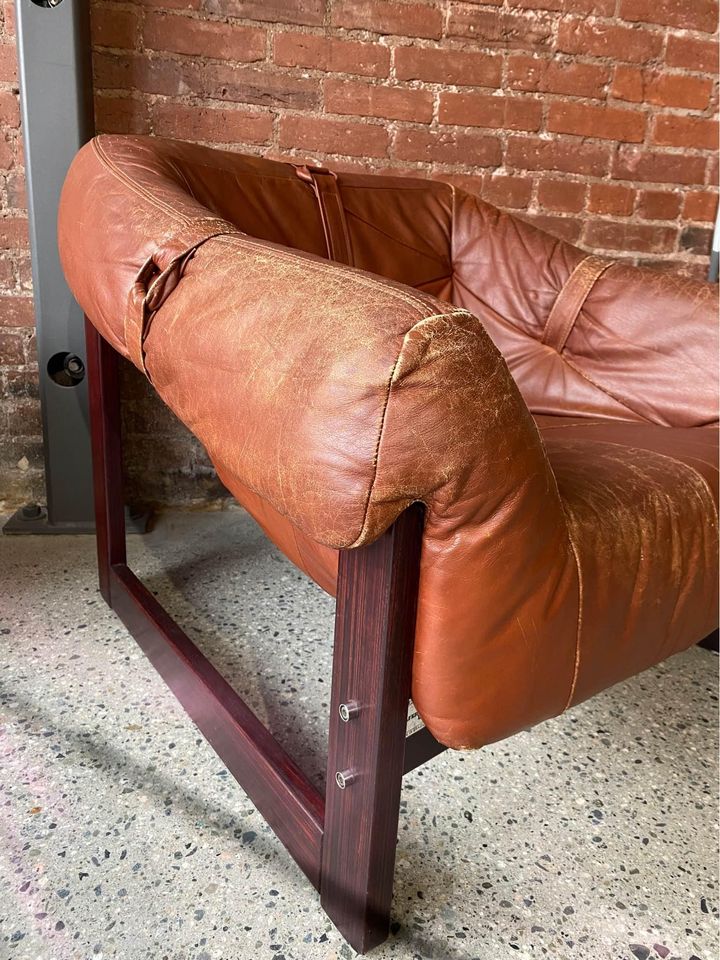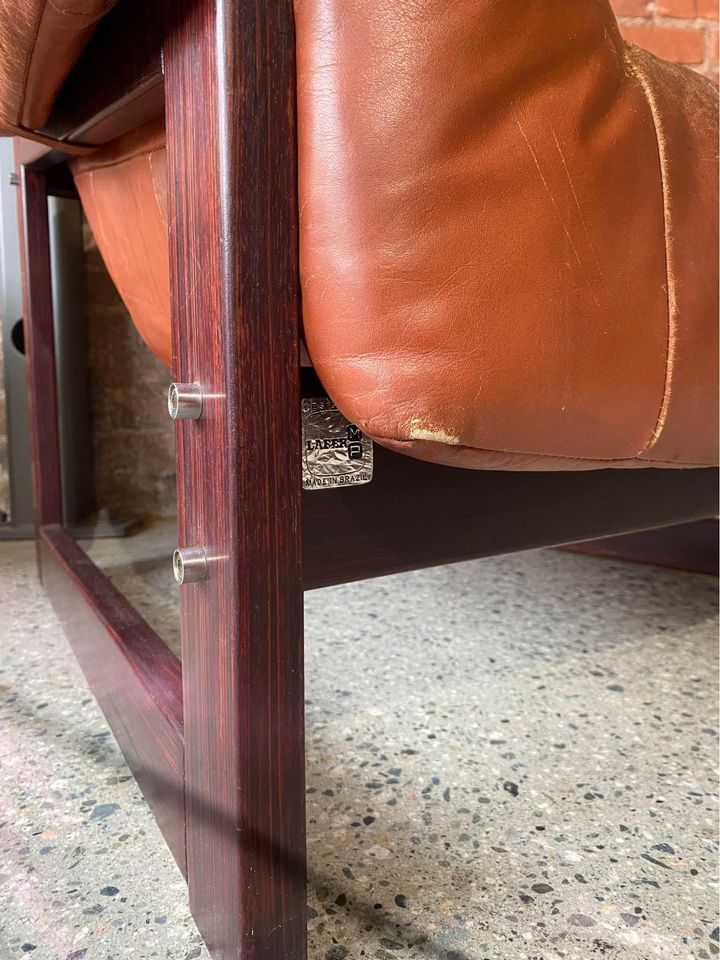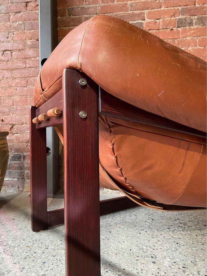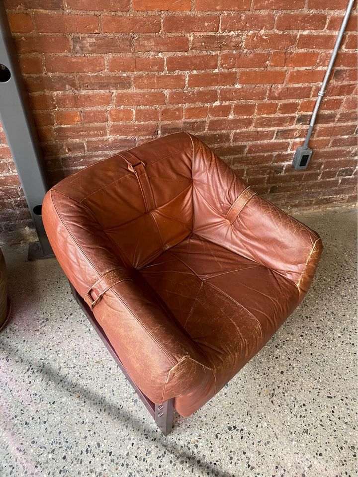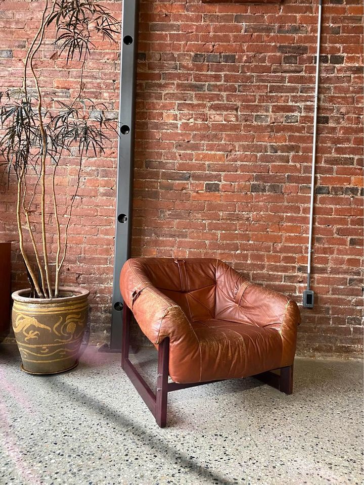 Beautifully aged Model “MP93” chair designed by Percival Lafer circa 1972. This design features a Brazilian hard wood frame, and a leather covered single block of injected polyurethane foam. The body is supported by new leather straps attached to the wood frame with wooden dowels. This original leather seat is freshly conditioned and cleaned; a process we do in house that takes about a week. It’s soft and comfortable and suitable for another generation of use. Love this piece. ♥️