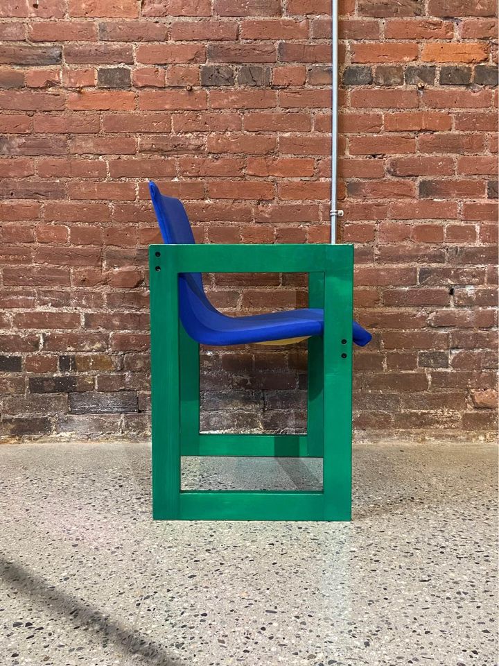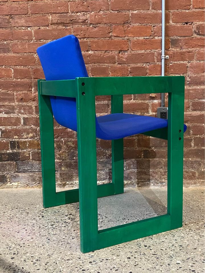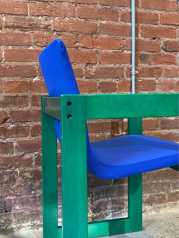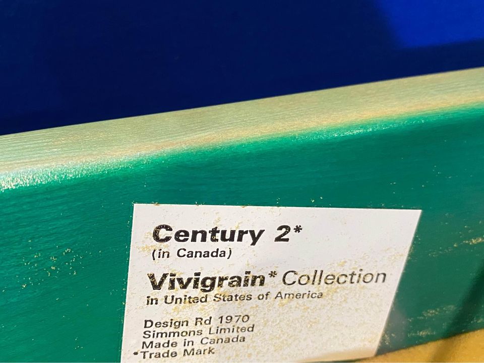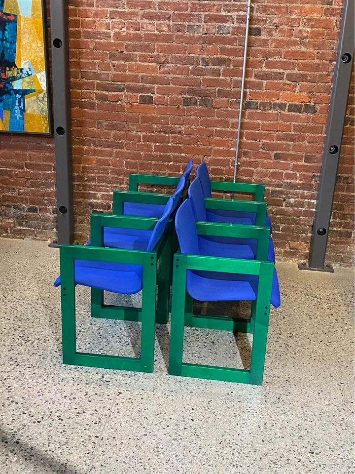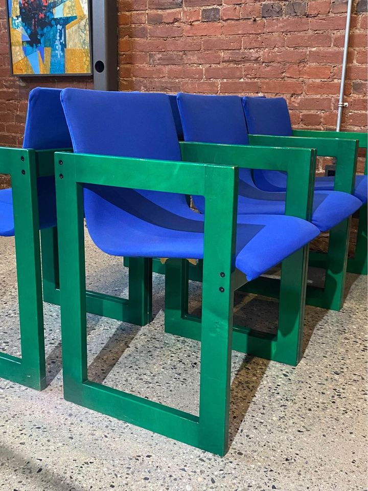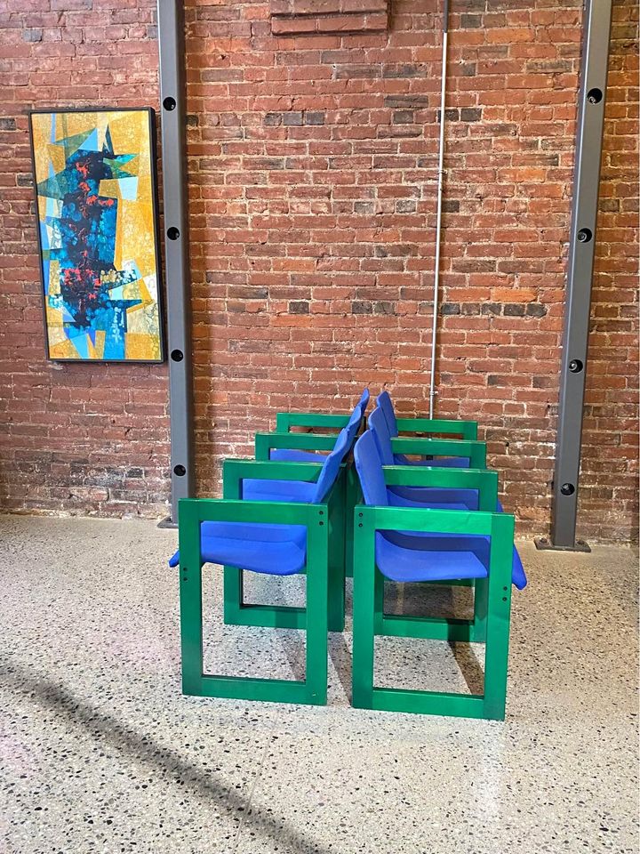 One of the most unique sets we have ever seen, this glorious set of dining chairs was made right here in Canada circa 1970. It features an intense aniline dye pigment that makes the maple wood grain shimmer and pop. The original fabric and wood finish are both in excellent condition.