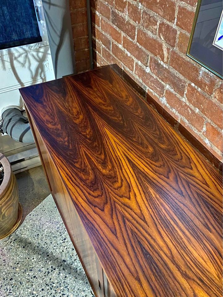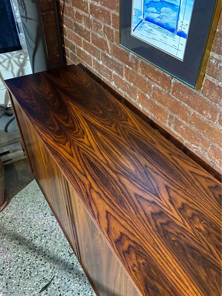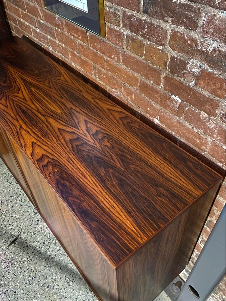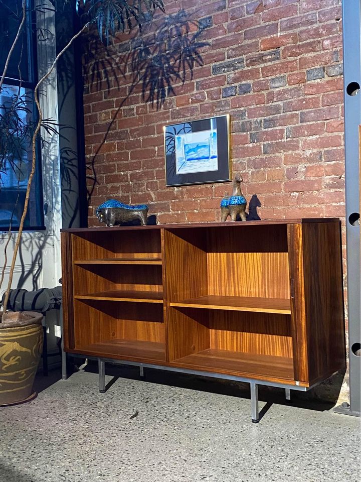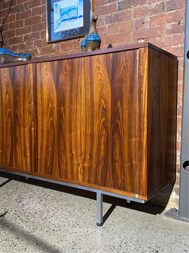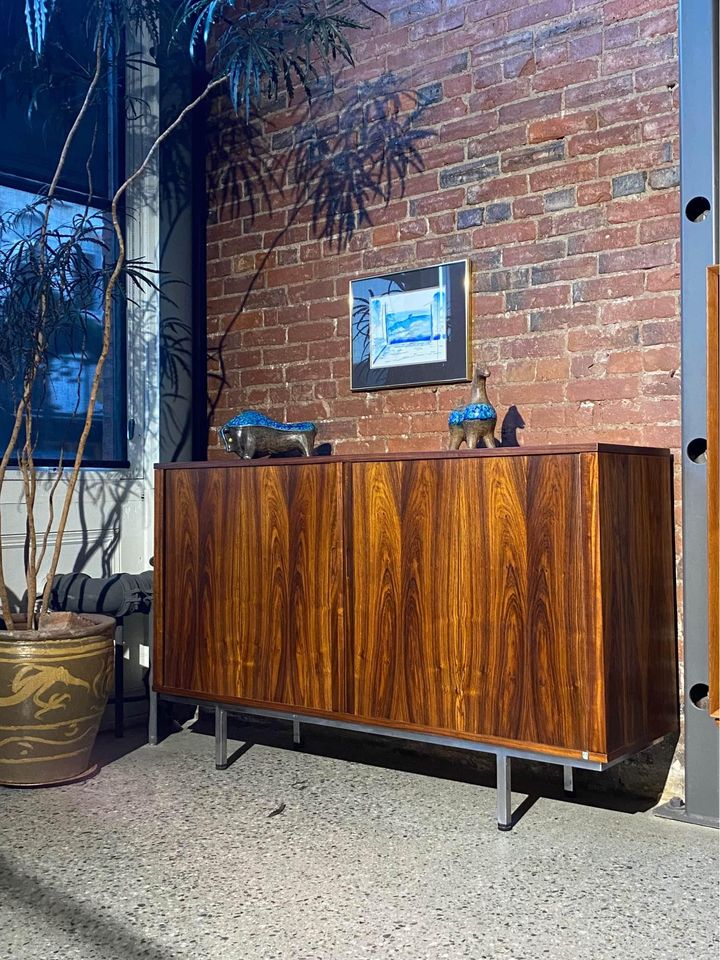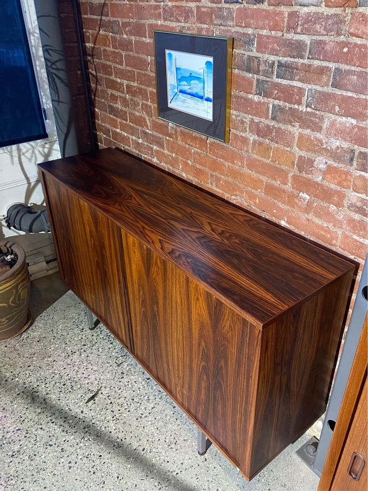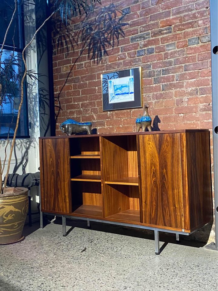 For all lovers of rosewood, this piece is sure to steal your hearts. Made of highly figured rosewood, this Danish cabinet has tambour doors, adjustable shelving, and a brushed steel base. It would work well as a stereo stand, as it can house a lot of LPs, or even as an epic dresser. Freshly restored by our team, this piece is in fantastic condition.