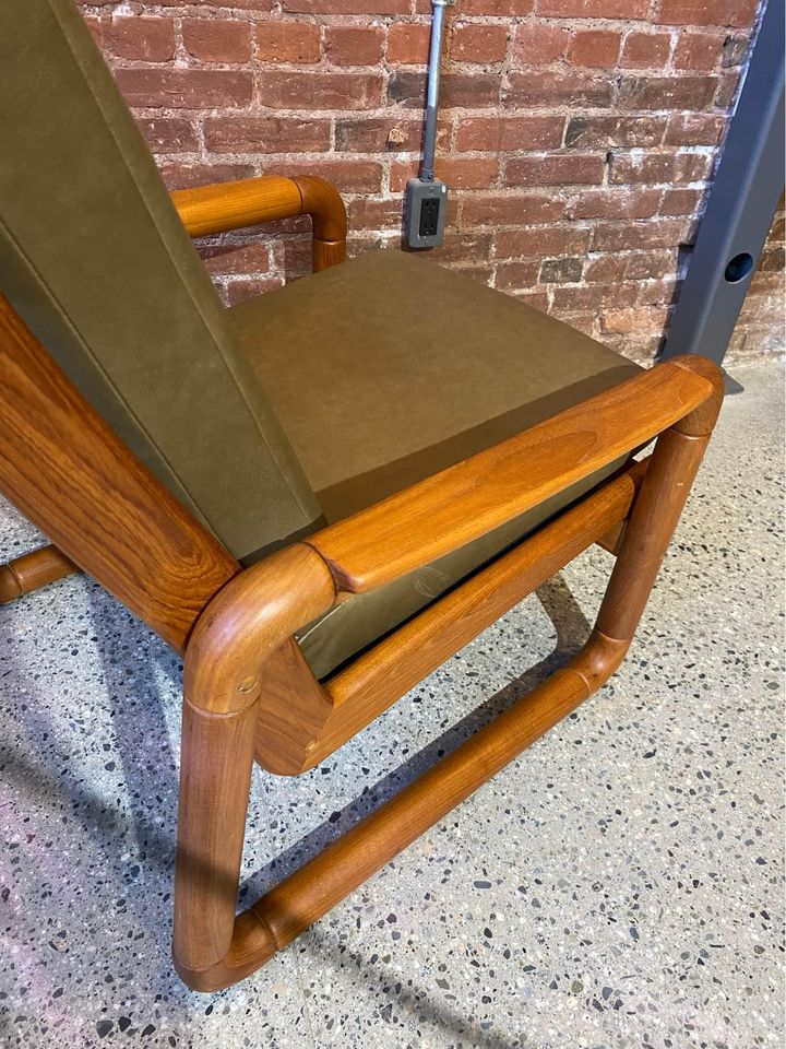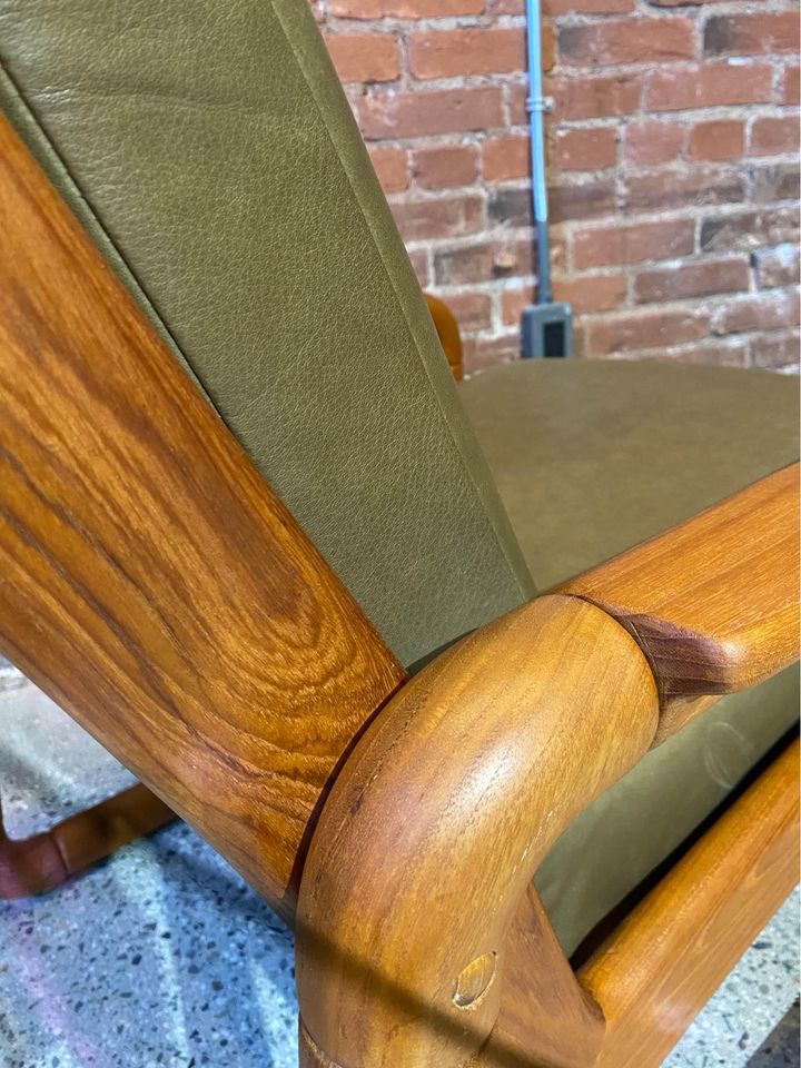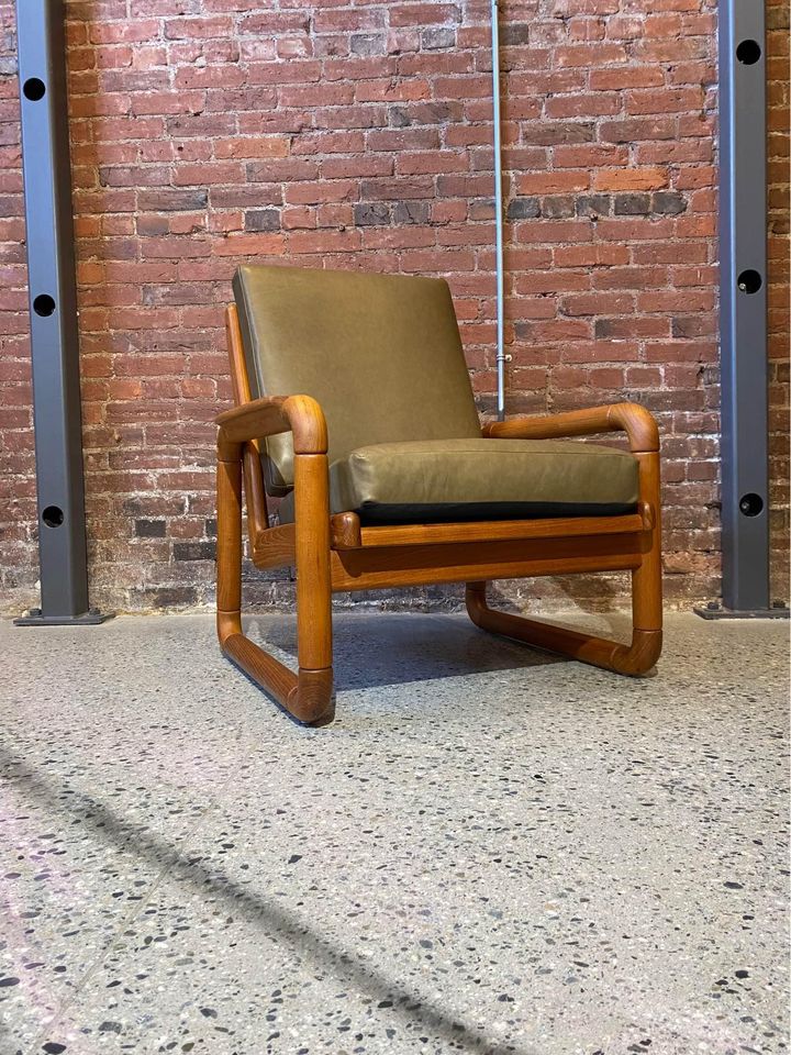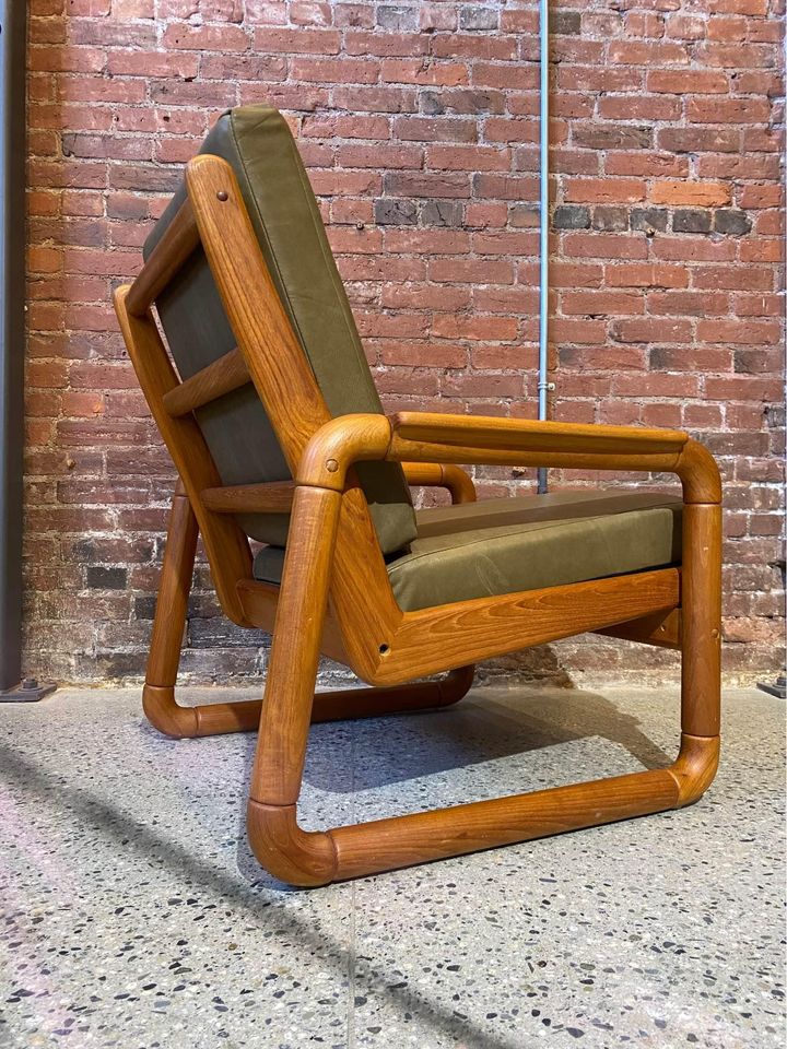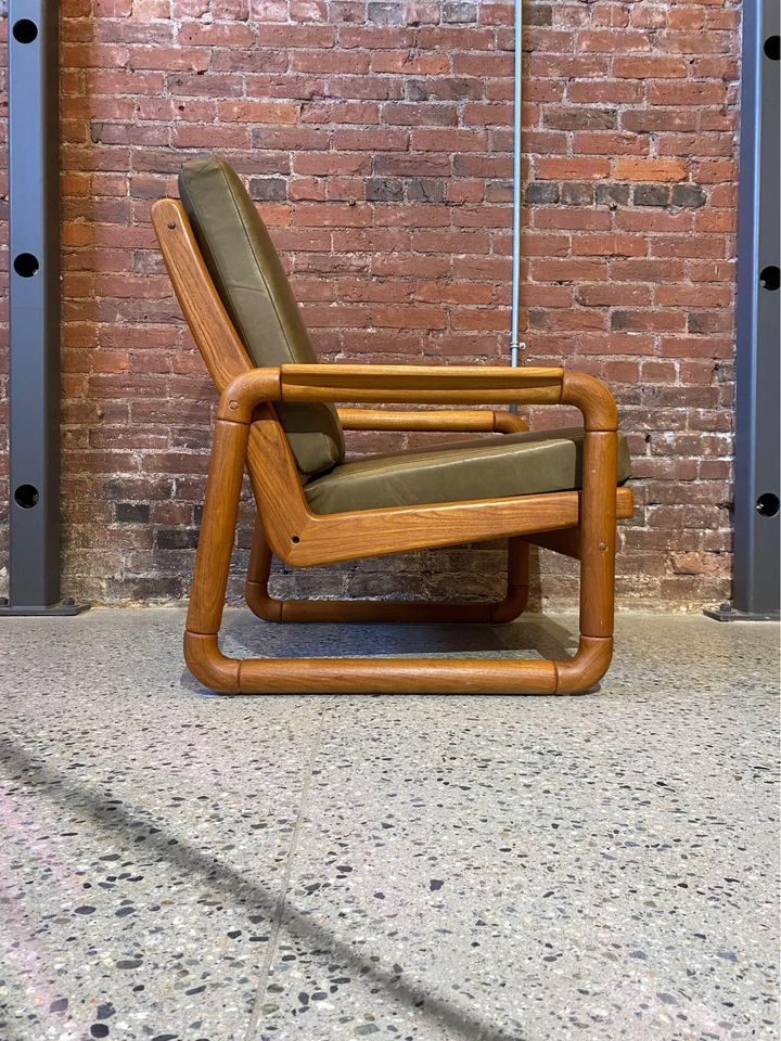 This high quality piece is constructed entirely from solid teak and is freshly adorned with buttery soft leather. It has a higher seat height than most mid century chairs, and the generous seat is very comfortable. The entire piece is completely restored and in excellent condition.