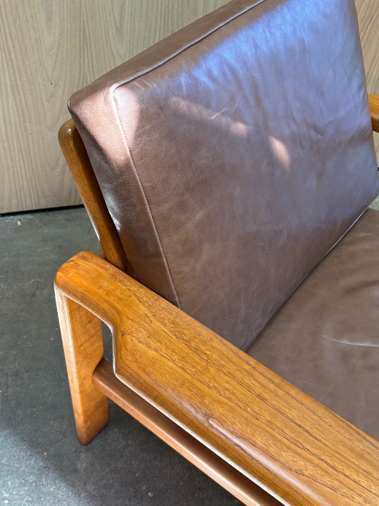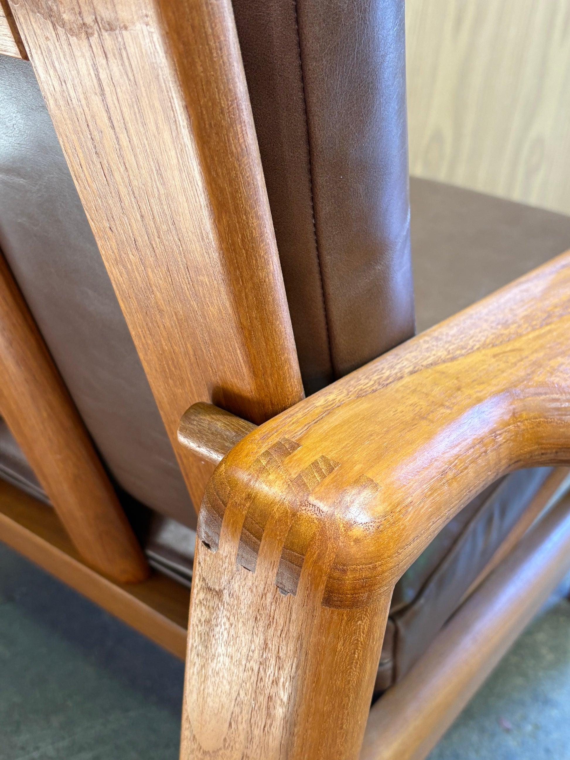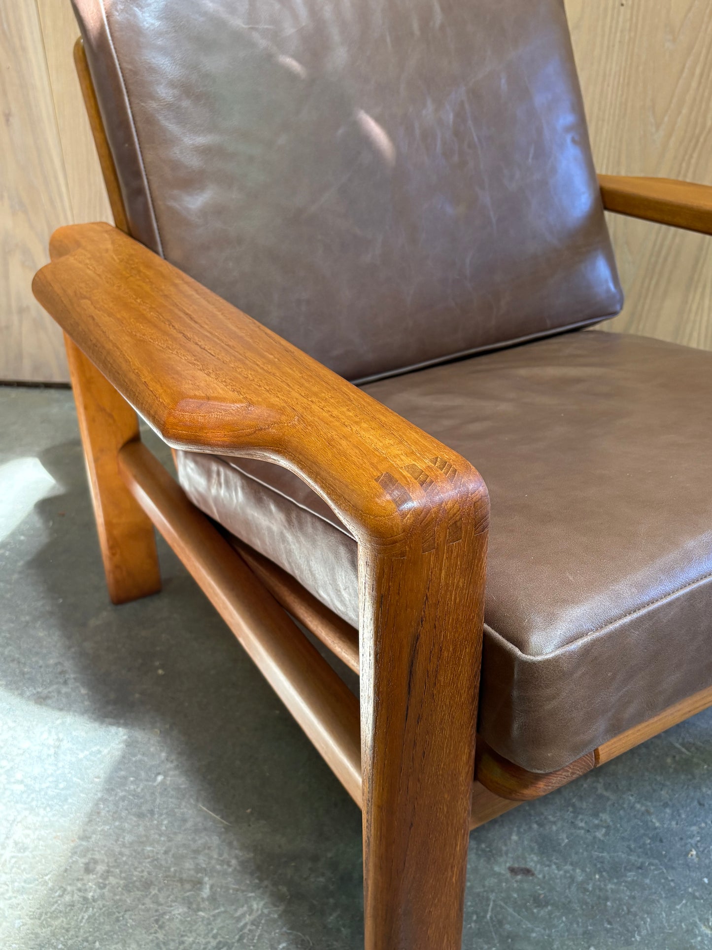 An elegant expression of 1970s craftsmanship and form, this solid teak lounge chair features bold paddle-style arms with exposed finger-joint construction and a confident low-slung stance. The wide seat and relaxed back offer generous comfort, while the freshly restored frame is paired with new seat webbing and top-grade leather upholstery. A timeless piece, beautifully built and ready to anchor any room.