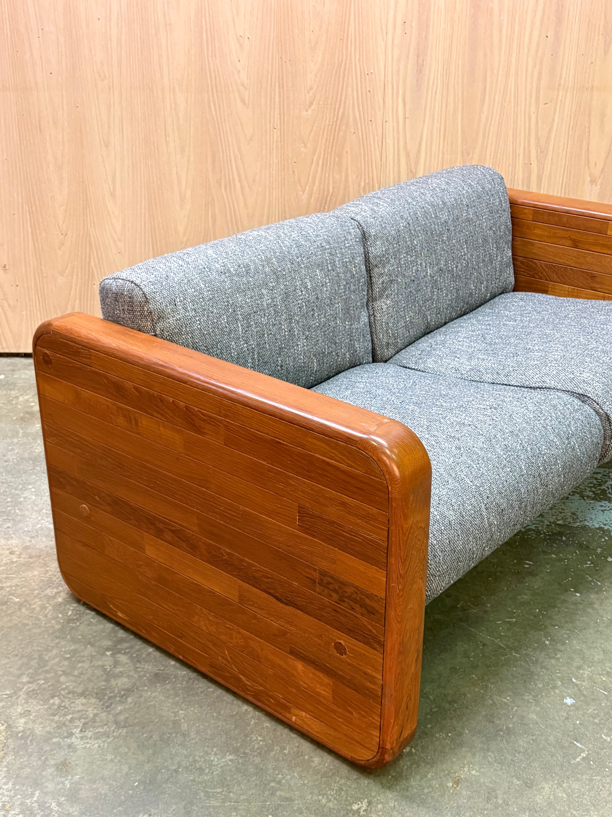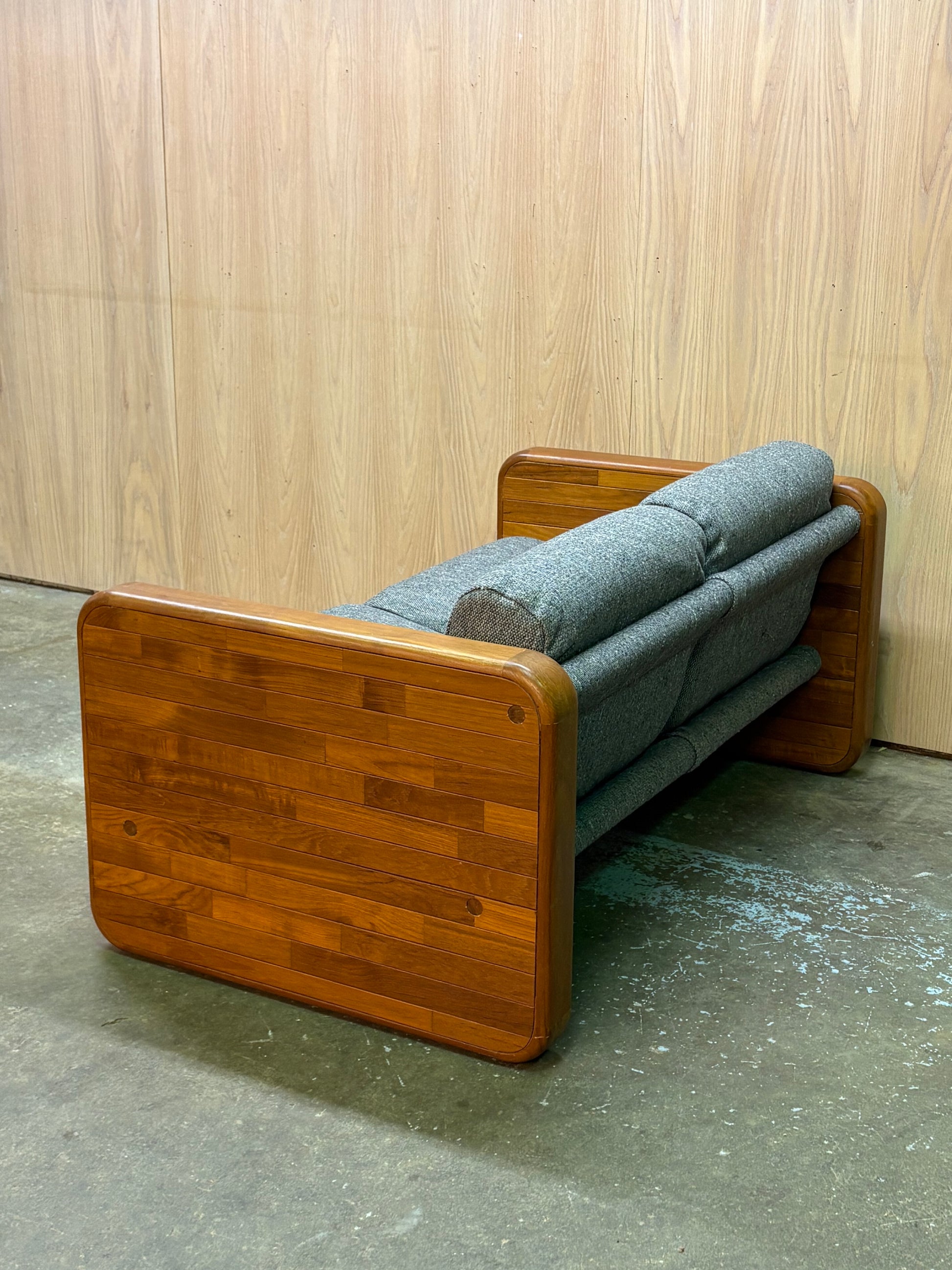 Solid teak sofa produced in the 1970s, characterized by broad block arms and horizontal sling construction. Strong, grounded proportions with softened edges, typical of the period’s emphasis on durability and everyday use.