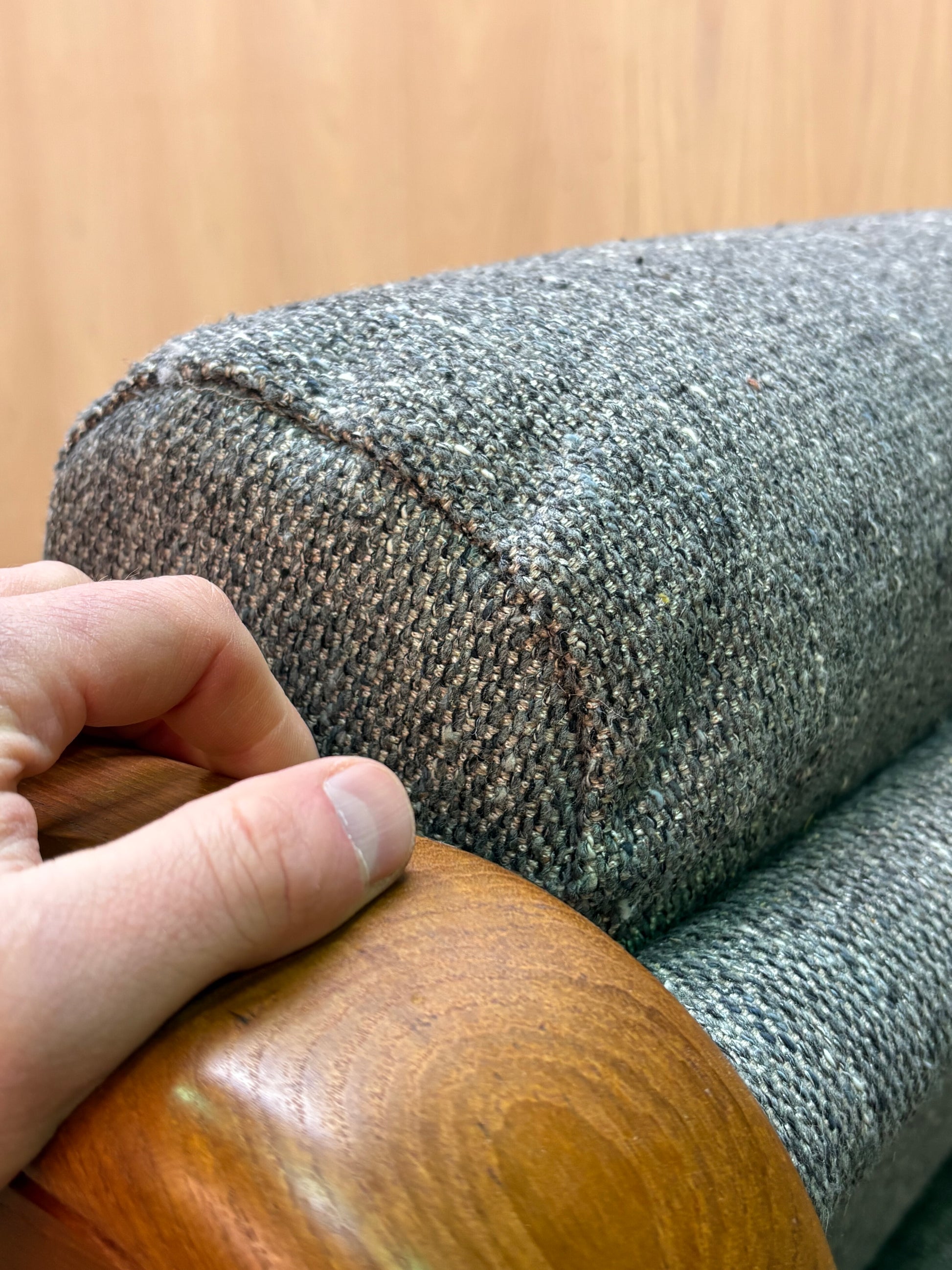 The teak frame has been freshly cleaned and polished, presenting evenly with a warm, natural tone. The sofa has been newly reupholstered in a textured neutral fabric that complements the weight and geometry of the frame. Upholstery work is clean and consistent throughout.