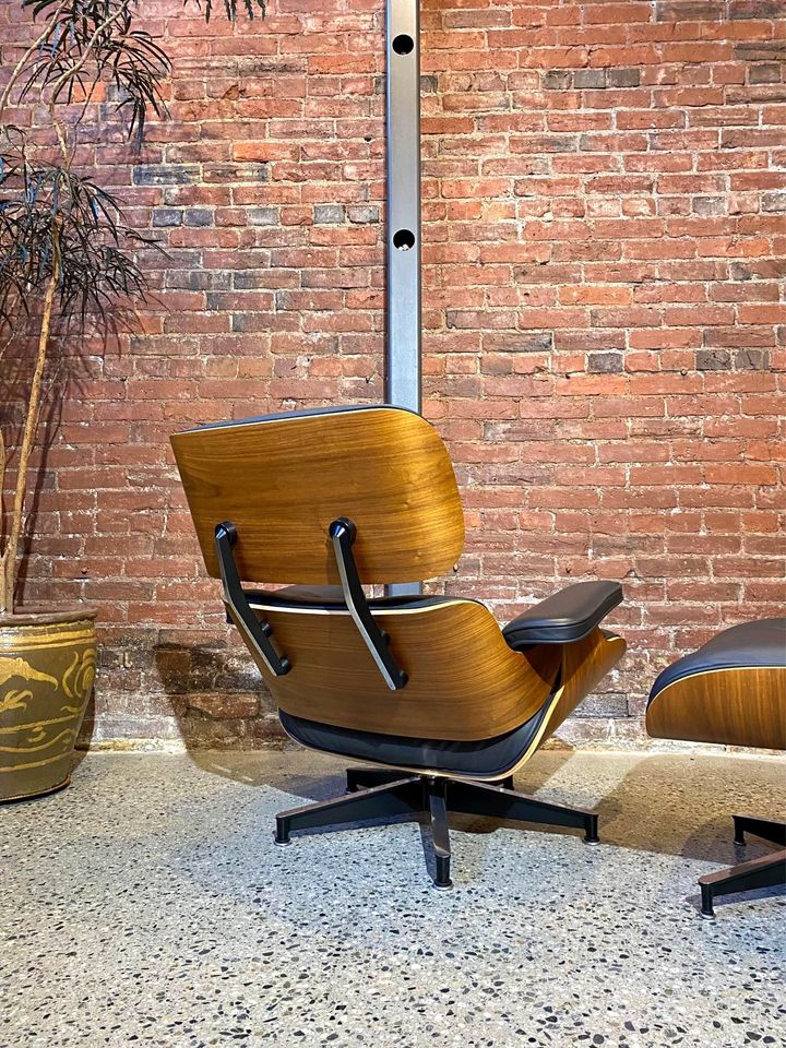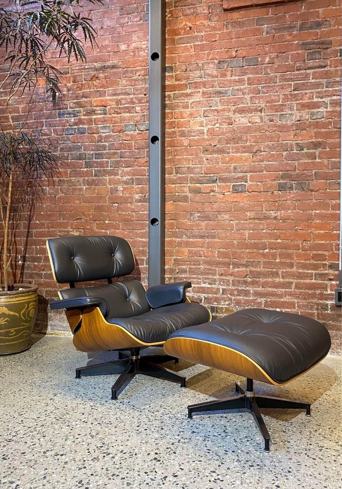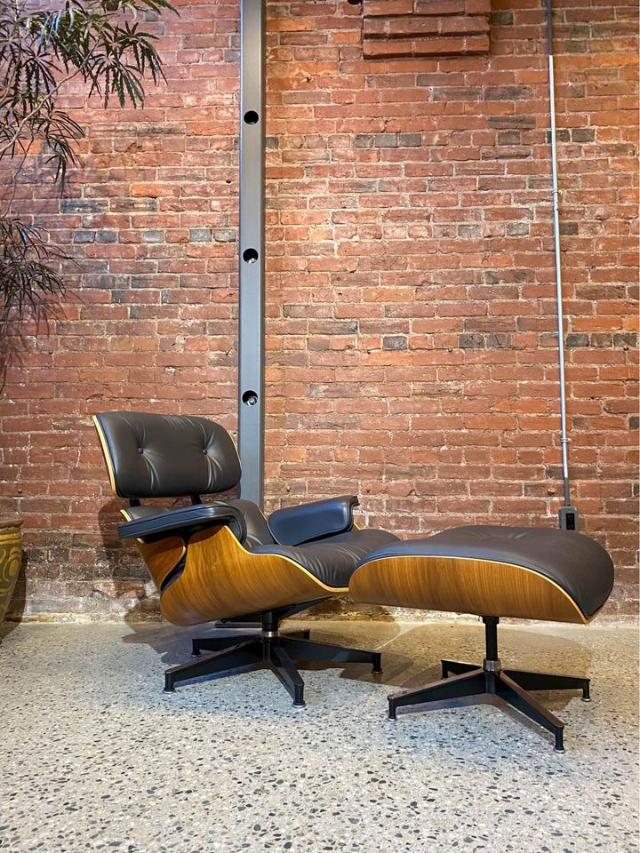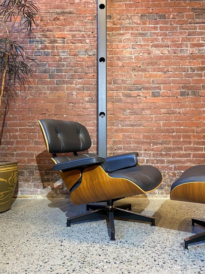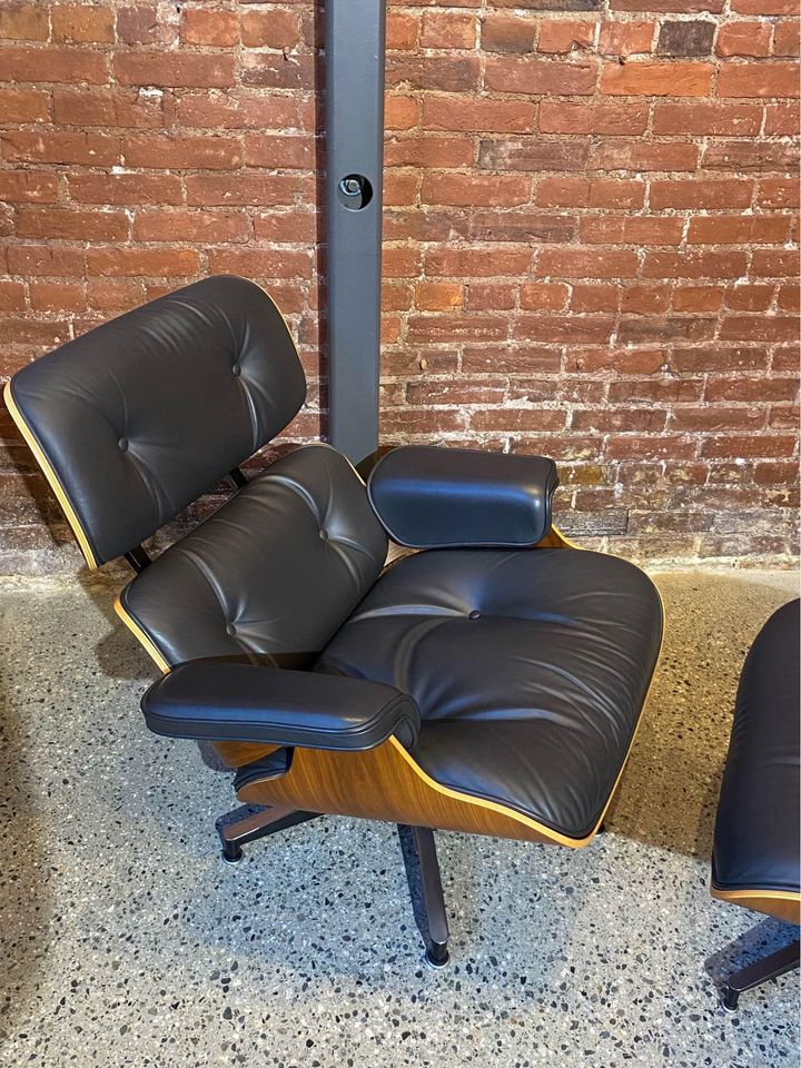 Recent production authentic Eames Lounge chair and ottoman in oiled walnut and “Lava” leather. Immaculate condition. manufactured by Herman Miller. Both pieces are labeled.