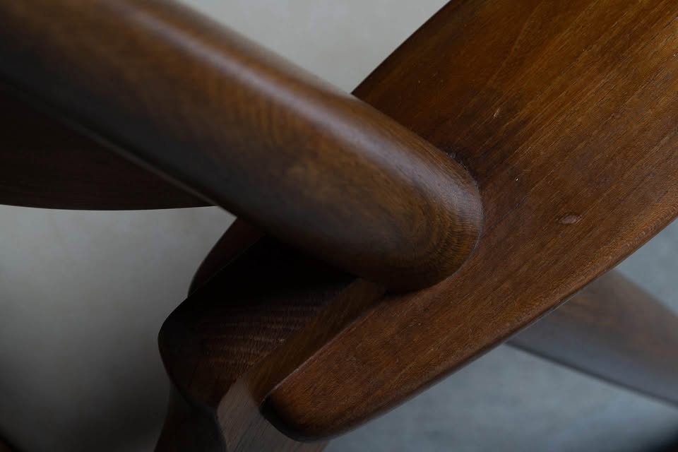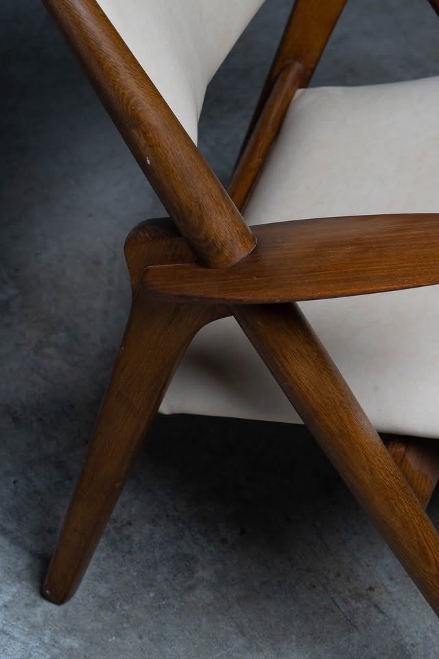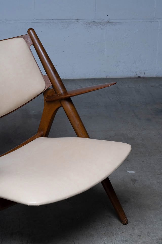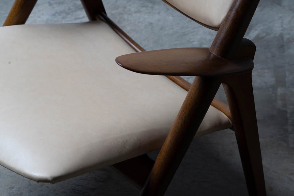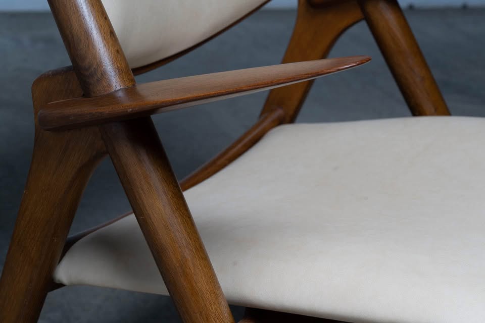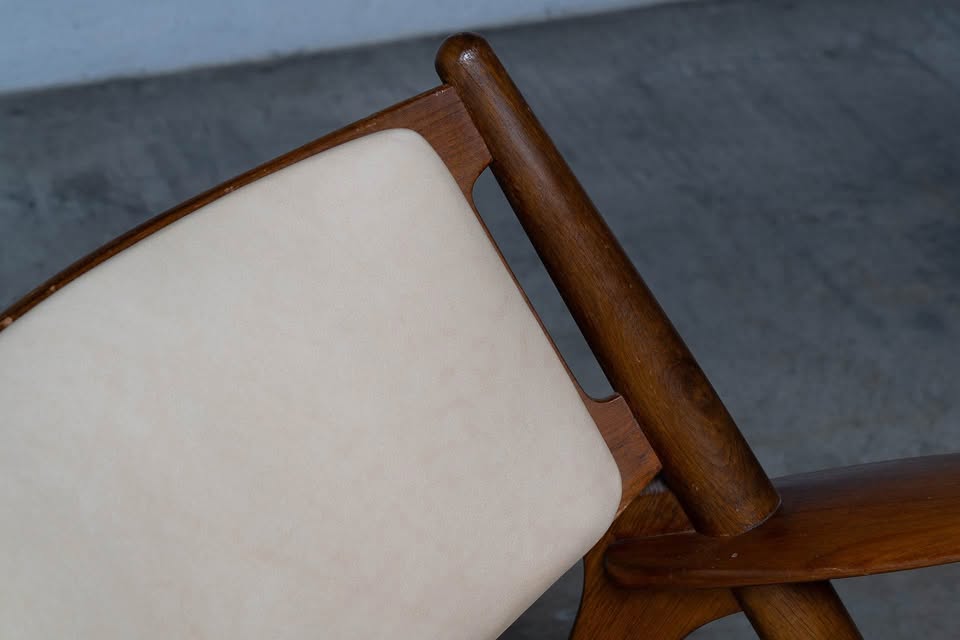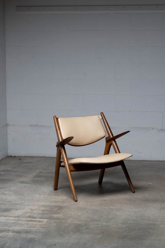Freshly upholstered in top-quality, natural-colored leather, the seat and backrest offer a warm, tactile experience that complements the chair’s inviting silhouette. The joinery is precise and seamless, a testament to Wegner’s cabinetmaking background, while the gently reclined stance and elegantly curved planes provide both aesthetic presence and remarkable comfort.