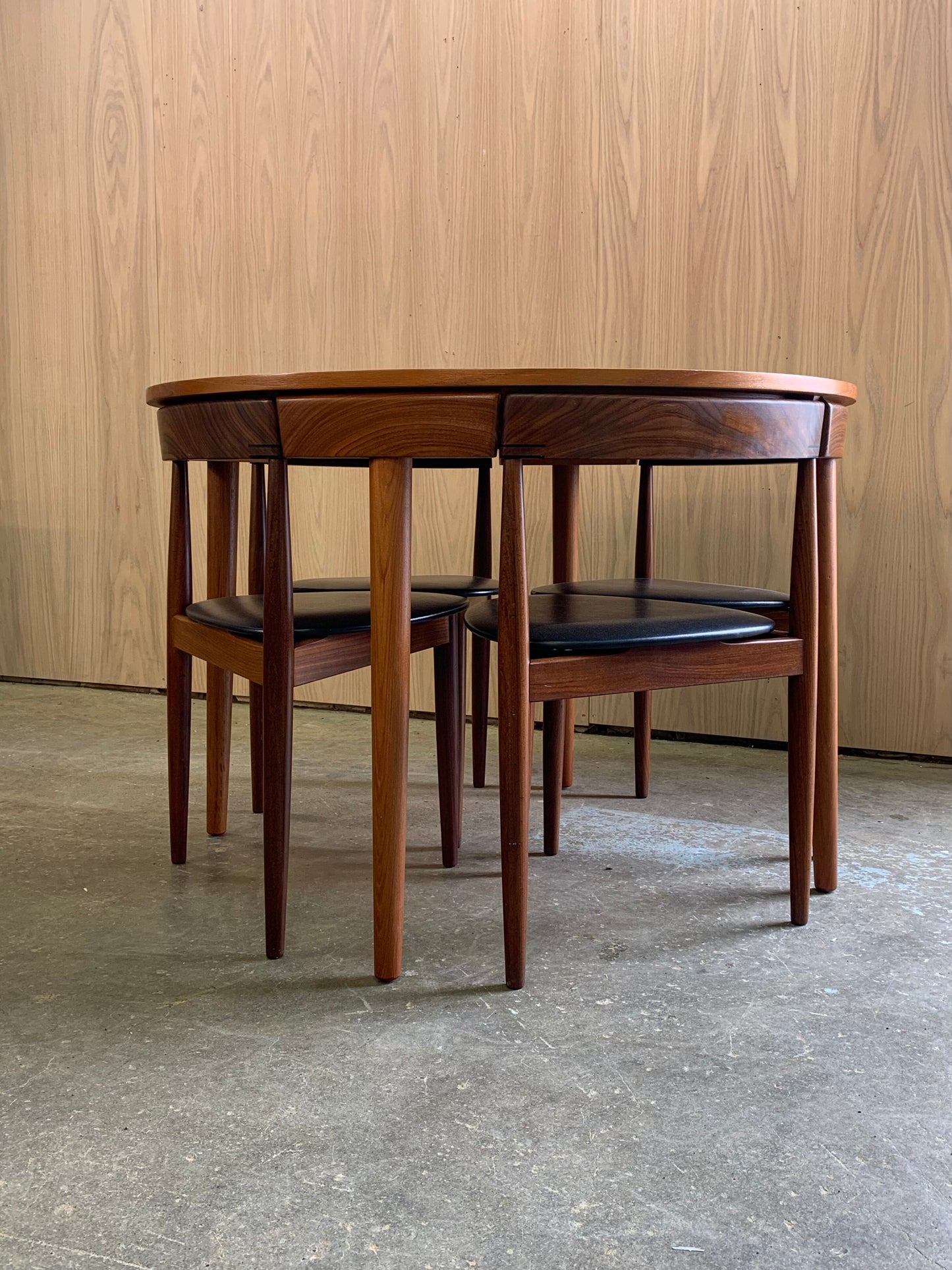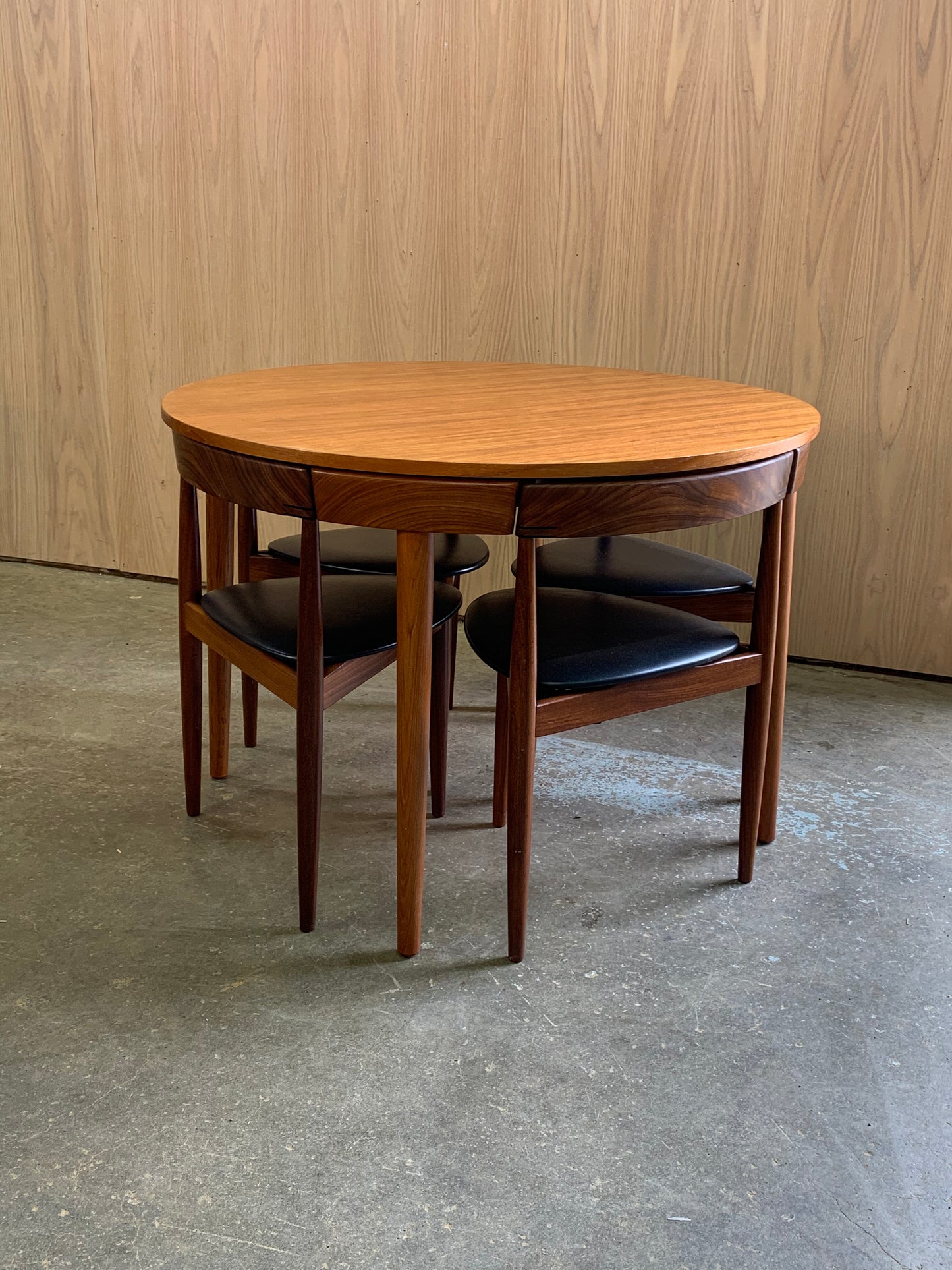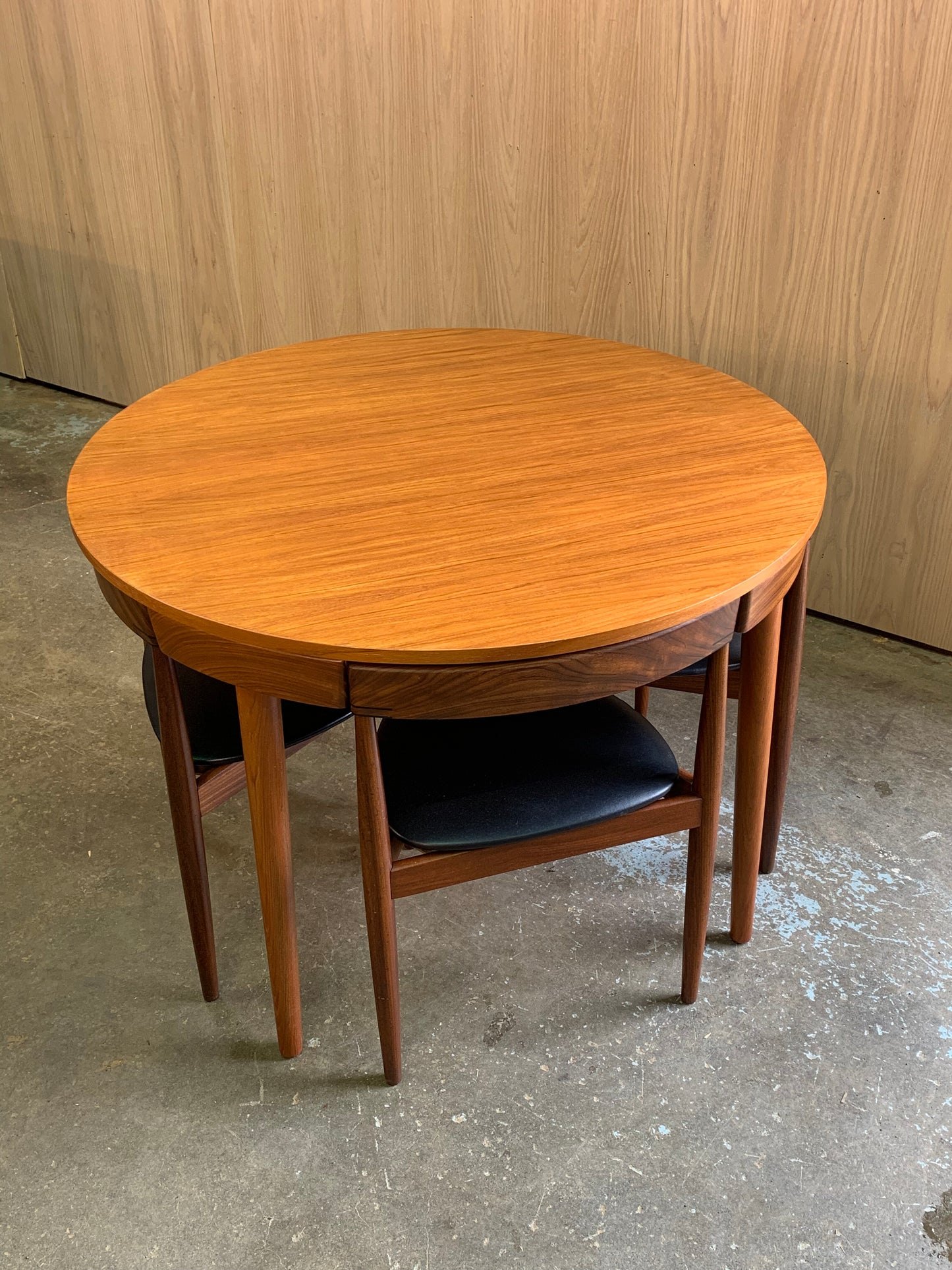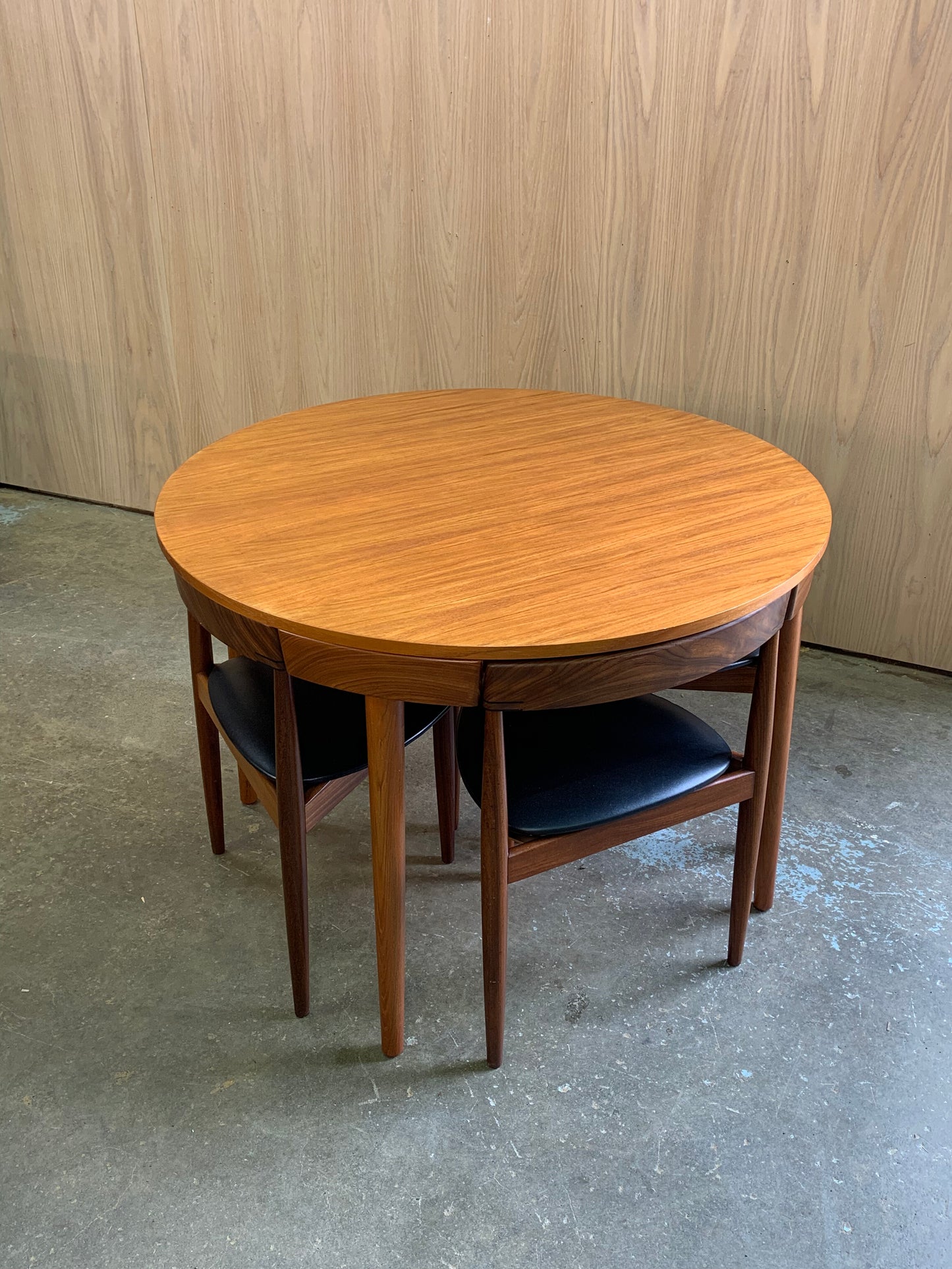 Designed in 1951 by Hans Olsen for Frem Røjle, the iconic “Roundette” dining set is a brilliant example of Danish design ingenuity. The set includes a round teak table and four sculptural chairs that nest seamlessly beneath the tabletop, creating a compact and elegant silhouette when not in use.