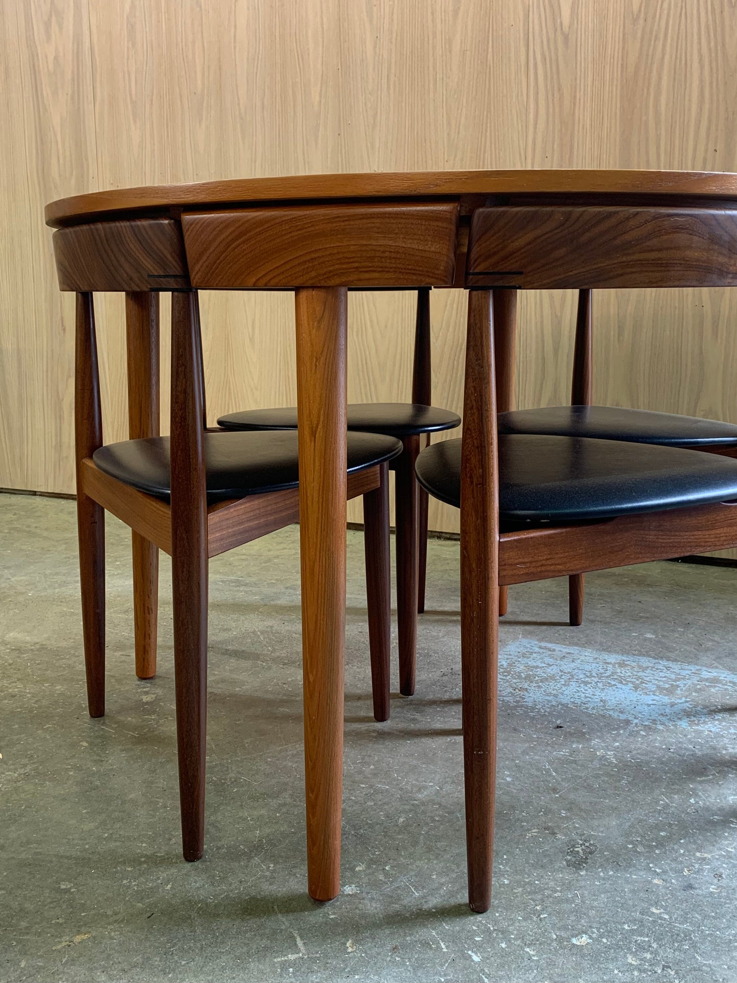The chairs feature curved backs and floating seats in black vinyl, highlighting Olsen’s signature blend of form and function. Every detail—from the rich grain of the teak to the clever stowaway design—speaks to the timeless appeal of mid-century modern craftsmanship.