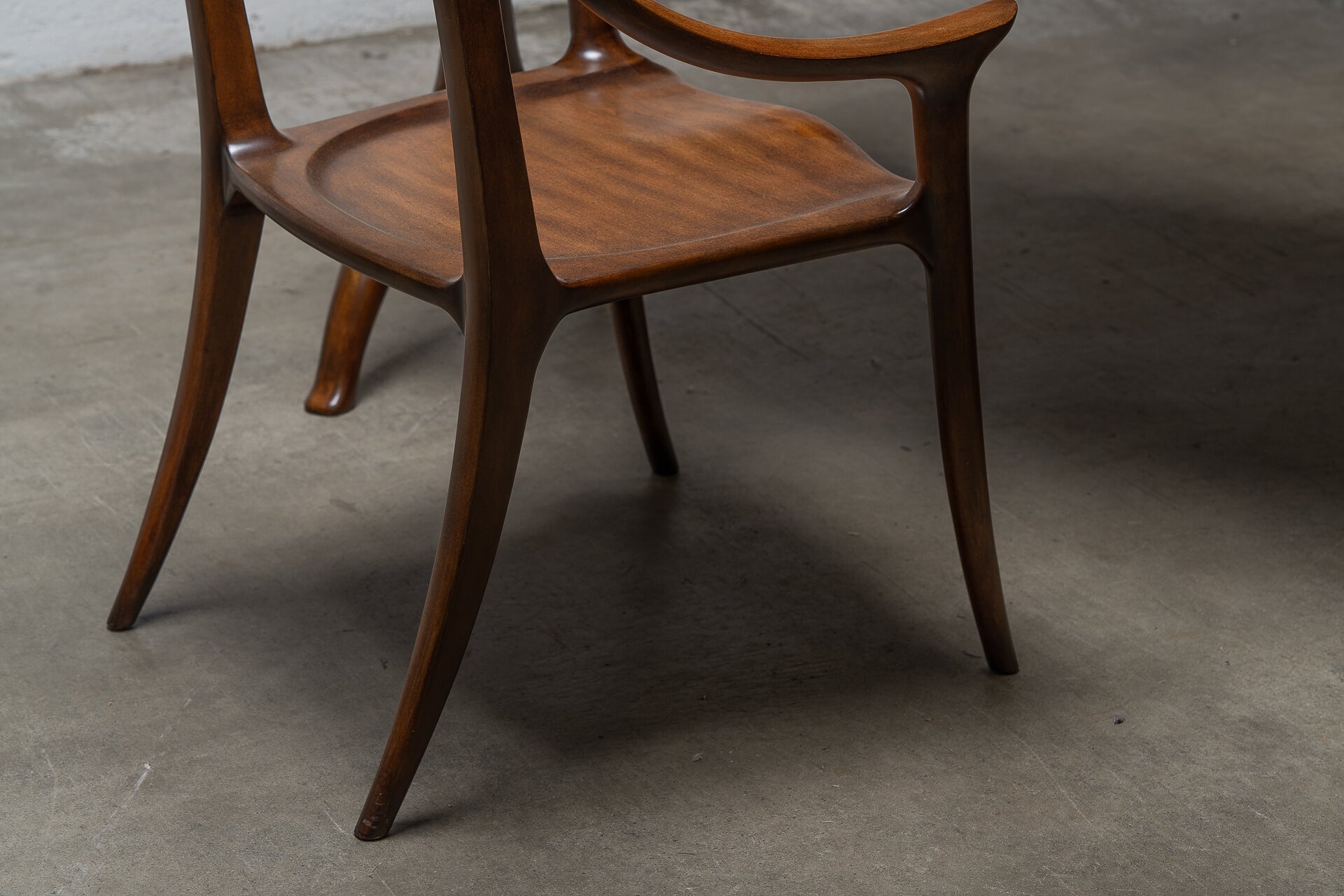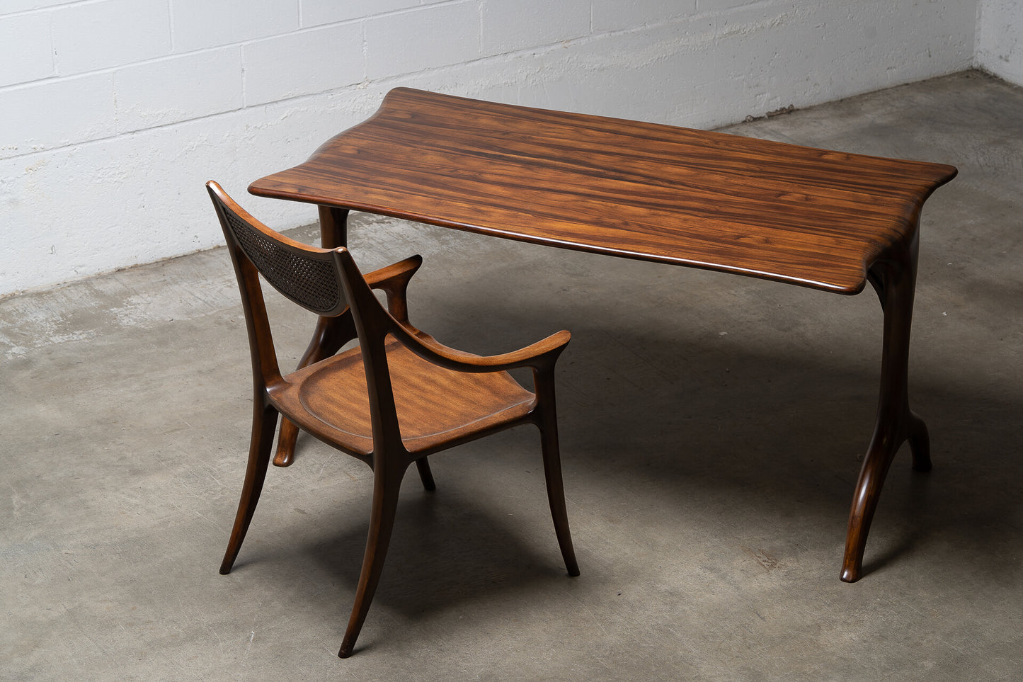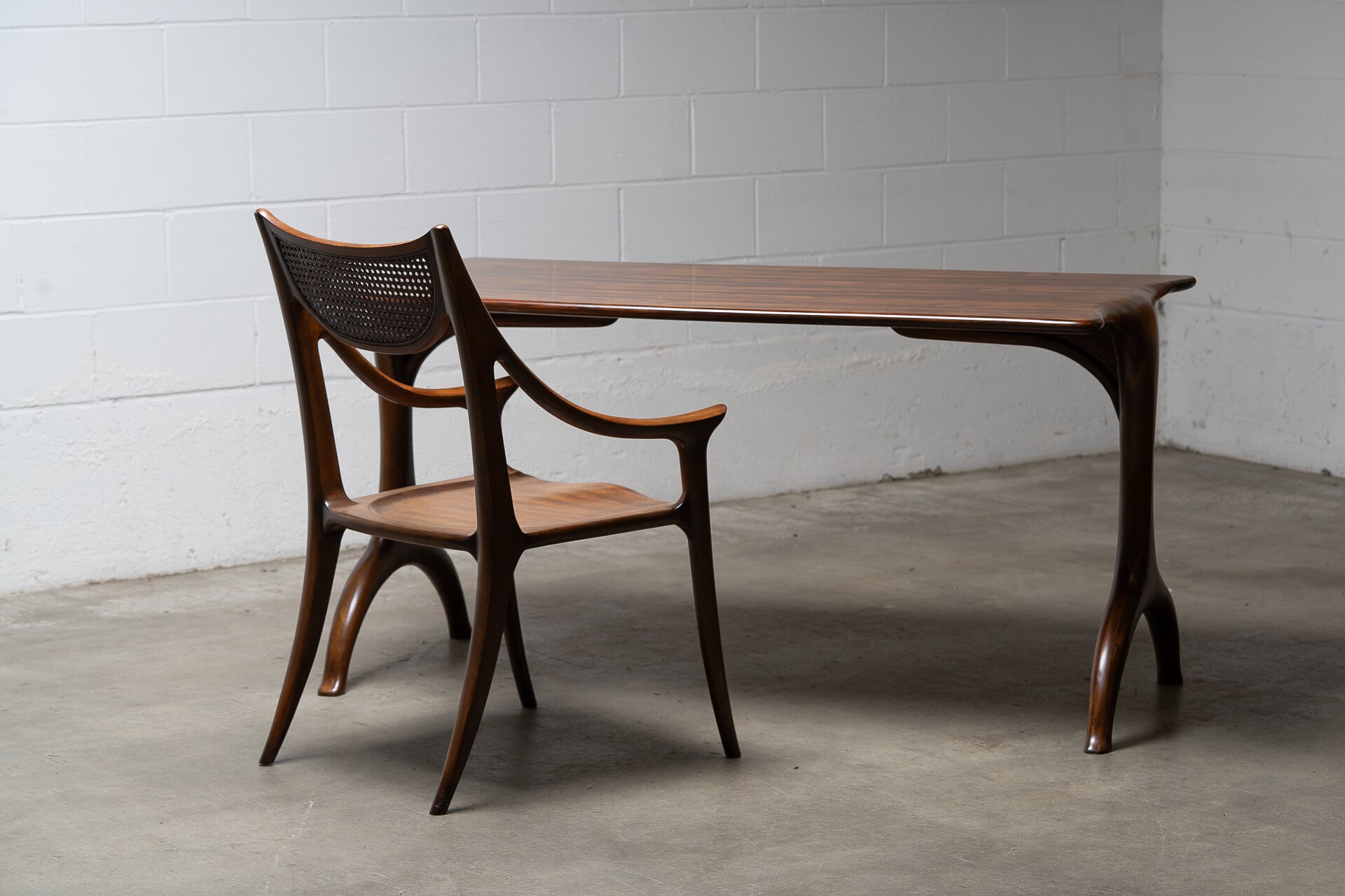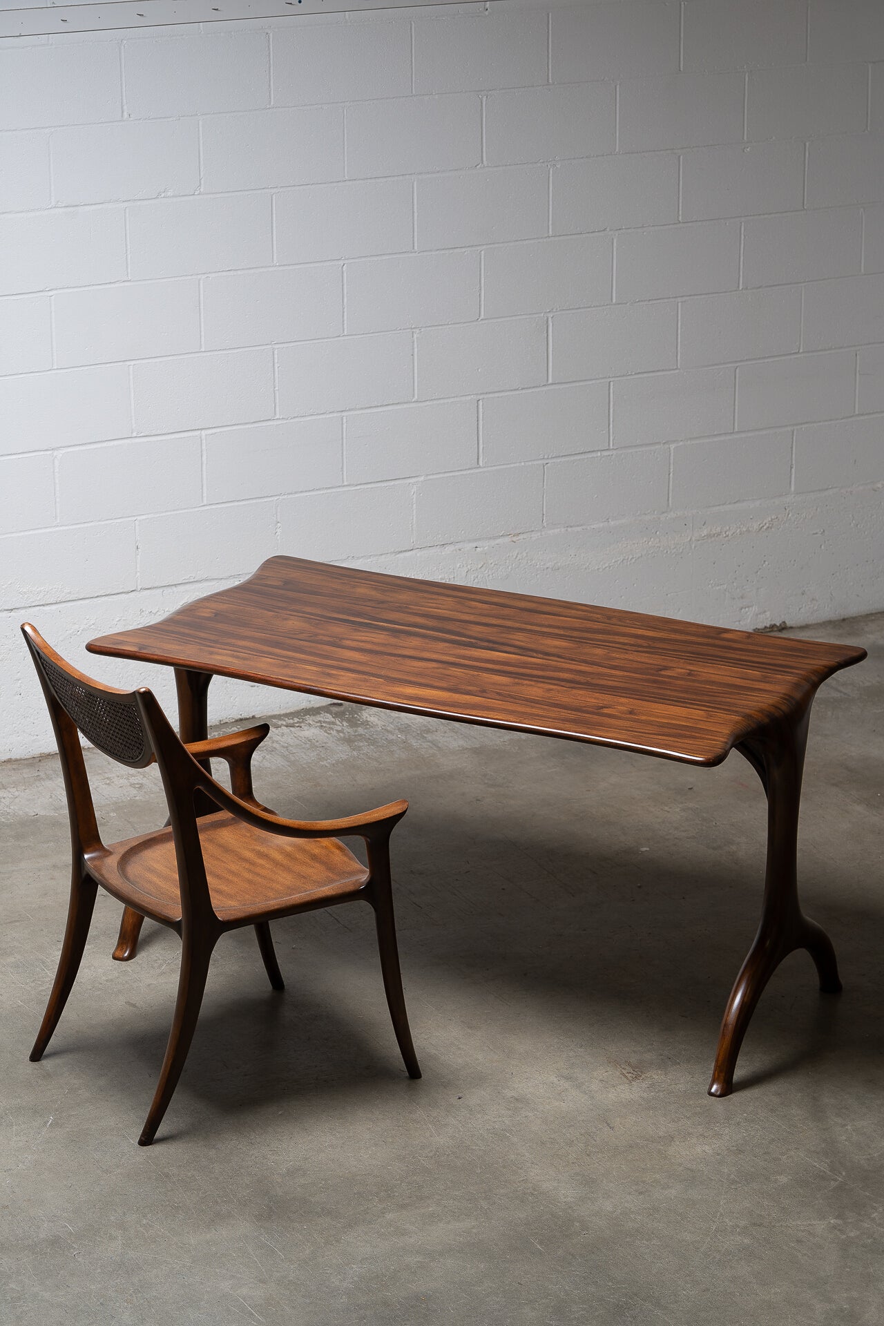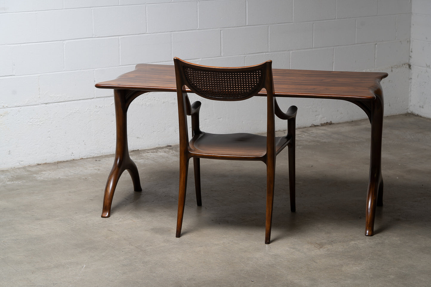 The desk features a sleek silhouette with refined lines, echoing the Keno Brothers’ appreciation for classic forms reinterpreted through a modern lens. The accompanying chair complements the desk’s architecture, offering both comfort and visual harmony. The set remains in exceptional condition, indicative of careful use and preservation.