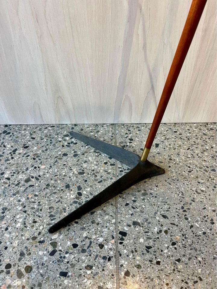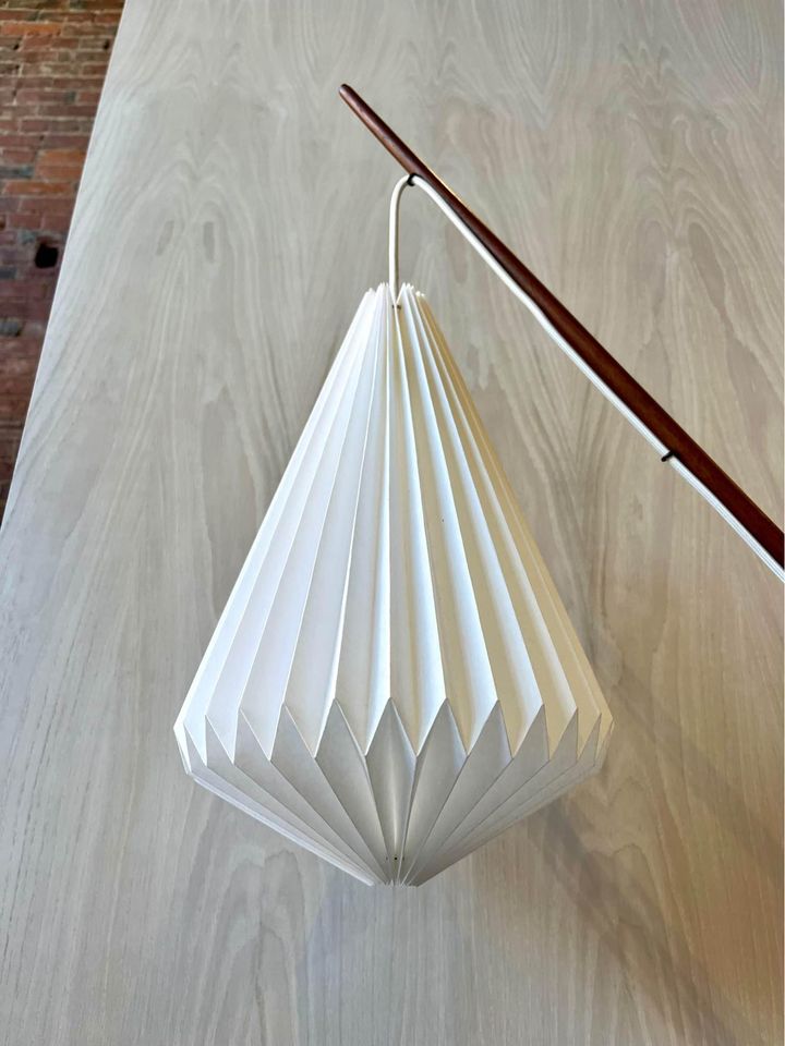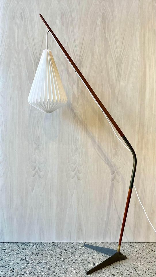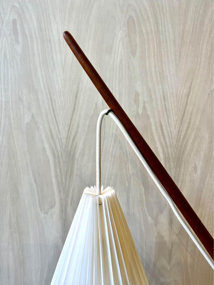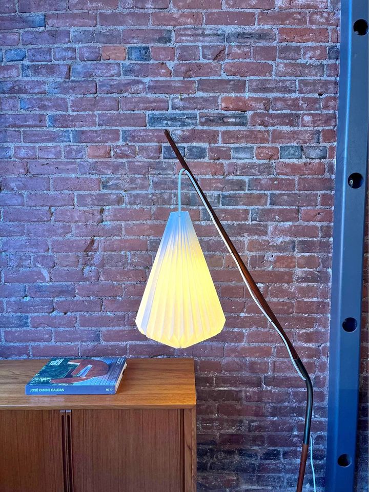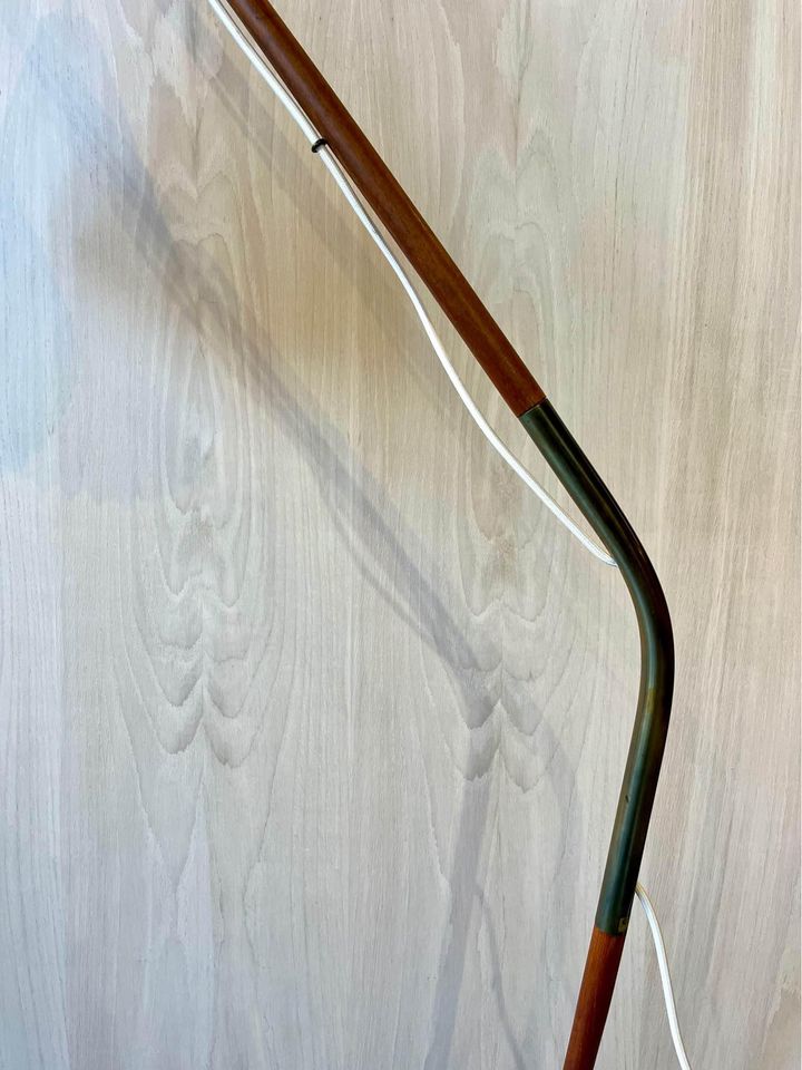 This rare 1960's Danish floor lamp, designed by Svend Aage Holm Sørensen, is a true collectors item. Its unique combination of materials and meticulous craftsmanship make it a stoundout piece. The lamp features a sturdy cast iron base that ensures stability, while the teak and brass body add an elegant touch of mid-century charm. Recently adorned with a new handmade pleated shade, the lamp exudes a warm and inviting glow when illuminated. When its striking design and exquisite details, this Danish floor lamp is a statement of both style and quality, destined to enhance any space with its timeless beauty.